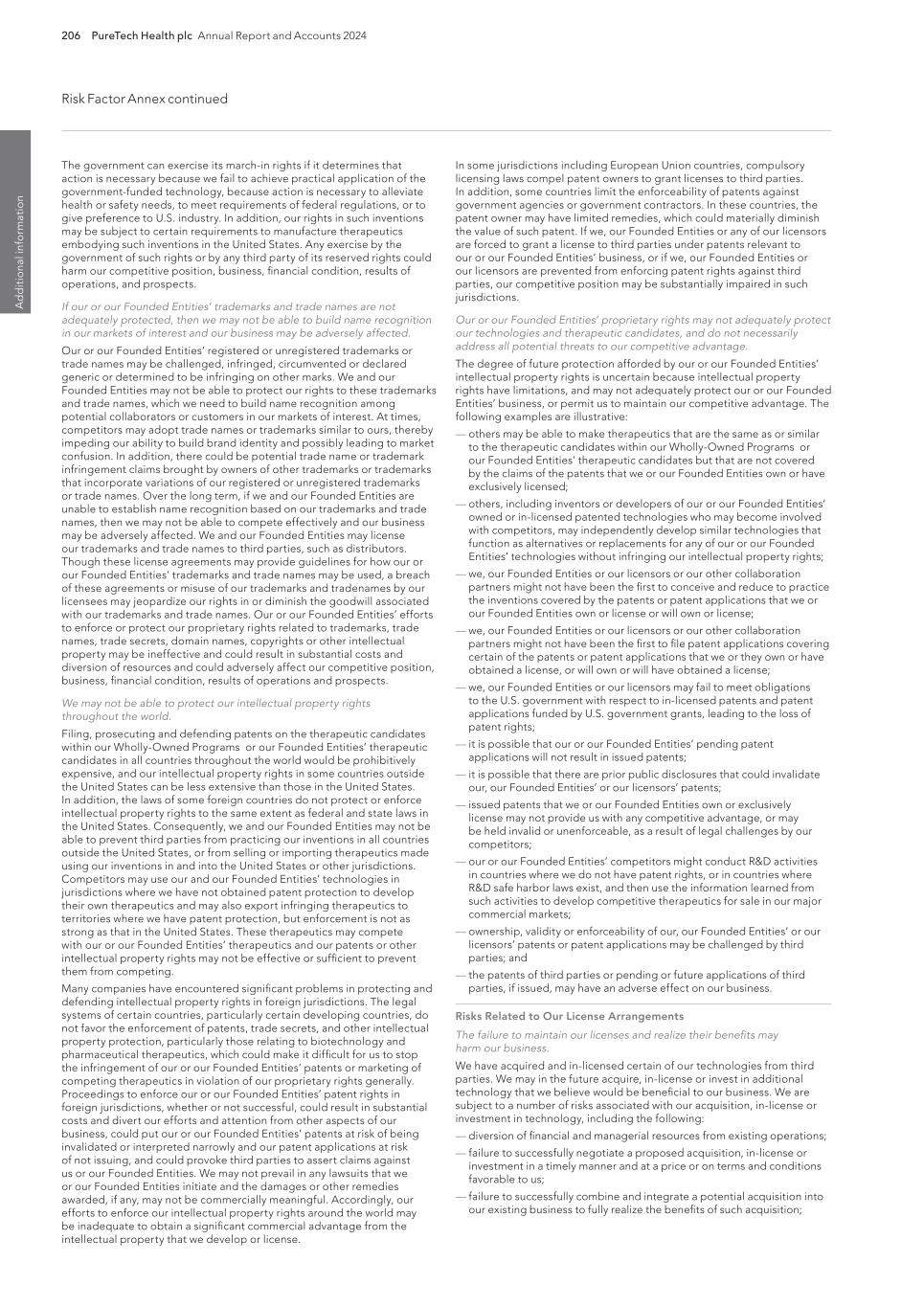 206  PureTech Health plc Annual Report and Accounts 2024 Risk Factor Annex continued A d d it io na l i nf o rm at io n In some jurisdictions including European Union countries, compulsory  licensing laws compel patent owners to grant licenses to third parties.  In addition, some countries limit the enforceability of patents against  government agencies or government contractors. In these countries, the  patent owner may have limited remedies, which could materially diminish  the value of such patent. If we, our Founded Entities or any of our licensors  are forced to grant a license to third parties under patents relevant to  our or our Founded Entities’ business, or if we, our Founded Entities or  our licensors are prevented from enforcing patent rights against third  parties, our competitive position may be substantially impaired in such  jurisdictions. Our or our Founded Entities’ proprietary rights may not adequately protect  our technologies and therapeutic candidates, and do not necessarily  address all potential threats to our competitive advantage. The degree of future protection afforded by our or our Founded Entities’  intellectual property rights is uncertain because intellectual property  rights have limitations, and may not adequately protect our or our Founded  Entities’ business, or permit us to maintain our competitive advantage. The  following examples are illustrative:  — others may be able to make therapeutics that are the same as or similar  to the therapeutic candidates within our Wholly-Owned Programs  or  our Founded Entities’ therapeutic candidates but that are not covered  by the claims of the patents that we or our Founded Entities own or have  exclusively licensed;  — others, including inventors or developers of our or our Founded Entities’  owned or in-licensed patented technologies who may become involved  with competitors, may independently develop similar technologies that  function as alternatives or replacements for any of our or our Founded  Entities’ technologies without infringing our intellectual property rights;  — we, our Founded Entities or our licensors or our other collaboration  partners might not have been the first to conceive and reduce to practice  the inventions covered by the patents or patent applications that we or  our Founded Entities own or license or will own or license;  — we, our Founded Entities or our licensors or our other collaboration  partners might not have been the first to file patent applications covering  certain of the patents or patent applications that we or they own or have  obtained a license, or will own or will have obtained a license;  — we, our Founded Entities or our licensors may fail to meet obligations  to the U.S. government with respect to in-licensed patents and patent  applications funded by U.S. government grants, leading to the loss of  patent rights;  — it is possible that our or our Founded Entities’ pending patent  applications will not result in issued patents;  — it is possible that there are prior public disclosures that could invalidate  our, our Founded Entities’ or our licensors’ patents;  — issued patents that we or our Founded Entities own or exclusively  license may not provide us with any competitive advantage, or may  be held invalid or unenforceable, as a result of legal challenges by our  competitors;  — our or our Founded Entities’ competitors might conduct R&D activities  in countries where we do not have patent rights, or in countries where  R&D safe harbor laws exist, and then use the information learned from  such activities to develop competitive therapeutics for sale in our major  commercial markets;  — ownership, validity or enforceability of our, our Founded Entities’ or our  licensors’ patents or patent applications may be challenged by third  parties; and  — the patents of third parties or pending or future applications of third  parties, if issued, may have an adverse effect on our business. Risks Related to Our License Arrangements The failure to maintain our licenses and realize their benefits may  harm our business. We have acquired and in-licensed certain of our technologies from third  parties. We may in the future acquire, in-license or invest in additional  technology that we believe would be beneficial to our business. We are  subject to a number of risks associated with our acquisition, in-license or  investment in technology, including the following:  — diversion of financial and managerial resources from existing operations;  — failure to successfully negotiate a proposed acquisition, in-license or  investment in a timely manner and at a price or on terms and conditions  favorable to us;  — failure to successfully combine and integrate a potential acquisition into  our existing business to fully realize the benefits of such acquisition; The government can exercise its march-in rights if it determines that  action is necessary because we fail to achieve practical application of the  government-funded technology, because action is necessary to alleviate  health or safety needs, to meet requirements of federal regulations, or to  give preference to U.S. industry. In addition, our rights in such inventions  may be subject to certain requirements to manufacture therapeutics  embodying such inventions in the United States. Any exercise by the  government of such rights or by any third party of its reserved rights could  harm our competitive position, business, financial condition, results of  operations, and prospects. If our or our Founded Entities’ trademarks and trade names are not  adequately protected, then we may not be able to build name recognition  in our markets of interest and our business may be adversely affected. Our or our Founded Entities’ registered or unregistered trademarks or  trade names may be challenged, infringed, circumvented or declared  generic or determined to be infringing on other ma
