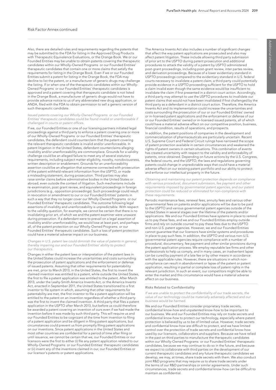 PureTech Health plc Annual Report and Accounts 2024  209  Risk Factor Annex continued A d d itio nal info rm atio n The America Invents Act also includes a number of significant changes  that affect the way patent applications are prosecuted and also may  affect patent litigation. These include allowing third party submission  of prior art to the USPTO during patent prosecution and additional  procedures to attack the validity of a patent by USPTO administered  post-grant proceedings, including post-grant review, inter partes review,  and derivation proceedings. Because of a lower evidentiary standard in  USPTO proceedings compared to the evidentiary standard in U.S. federal  courts necessary to invalidate a patent claim, a third party could potentially  provide evidence in a USPTO proceeding sufficient for the USPTO to hold  a claim invalid even though the same evidence would be insufficient to  invalidate the claim if first presented in a district court action. Accordingly,  a third party may attempt to use the USPTO procedures to invalidate our  patent claims that would not have been invalidated if first challenged by the  third party as a defendant in a district court action. Therefore, the America  Invents Act and its implementation could increase the uncertainties and  costs surrounding the prosecution of our or our Founded Entities’ owned  or in-licensed patent applications and the enforcement or defense of our  or our Founded Entities’ owned or in-licensed issued patents, all of which  could have a material adverse effect on our competitive position, business,  financial condition, results of operations, and prospects. In addition, the patent positions of companies in the development and  commercialization of pharmaceuticals are particularly uncertain. Recent  U.S. Supreme Court and Federal Circuit rulings have narrowed the scope  of patent protection available in certain circumstances and weakened the  rights of patent owners in certain situations. This combination of events  has created uncertainty with respect to the validity and enforceability of  patents, once obtained. Depending on future actions by the U.S. Congress,  the federal courts, and the USPTO, the laws and regulations governing  patents could change in unpredictable ways that could have a material  adverse effect on our existing patent portfolio and our ability to protect  and enforce our intellectual property in the future. Obtaining and maintaining our patent protection depends on compliance  with various procedural, document submission, fee payment and other  requirements imposed by governmental patent agencies, and our patent  protection could be reduced or eliminated for non-compliance with  these requirements. Periodic maintenance fees, renewal fees, annuity fees and various other  governmental fees on patents and/or applications will be due to be paid  to the USPTO and various governmental patent agencies outside of the  United States in several stages over the lifetime of the patents and/or  applications. We and our Founded Entities have systems in place to remind  us to pay these fees, and we and our Founded Entities employ outside  firms and rely on outside counsel to pay these fees due to the USPTO  and non-U.S. patent agencies. However, we and our Founded Entities  cannot guarantee that our licensors have similar systems and procedures  in place to pay such fees. In addition, the USPTO and various non-U.S.  governmental patent agencies require compliance with a number of  procedural, documentary, fee payment and other similar provisions during  the patent application process. We employ reputable law firms and other  professionals to help us comply, and in many cases, an inadvertent lapse  can be cured by payment of a late fee or by other means in accordance  with the applicable rules. However, there are situations in which non- compliance can result in abandonment or lapse of the patent or patent  application, resulting in partial or complete loss of patent rights in the  relevant jurisdiction. In such an event, our competitors might be able to  enter the market and this circumstance would have a material adverse  effect on our business. Risks Related to Confidentiality If we are unable to protect the confidentiality of our trade secrets, the  value of our technology could be materially adversely affected and our  business would be harmed. We and our Founded Entities consider proprietary trade secrets,  confidential know-how and unpatented know-how to be important to  our business. We and our Founded Entities may rely on trade secrets and  confidential know-how to protect our technology, especially where patent  protection is believed by us to be of limited value. However, trade secrets  and confidential know-how are difficult to protect, and we have limited  control over the protection of trade secrets and confidential know-how  used by our licensors, collaborators and suppliers. Because we have relied  in the past on third parties to manufacture the therapeutic candidates  within our Wholly-Owned Programs  or our Founded Entities’ therapeutic  candidates, because we may continue to do so in the future, and because  we expect to collaborate with third parties on the development of our  current therapeutic candidates and any future therapeutic candidates we  develop, we may, at times, share trade secrets with them. We also conduct  joint R&D programs that may require us to share trade secrets under  the terms of our R&D partnerships or similar agreements. Under such  circumstances, trade secrets and confidential know-how can be difficult to  maintain as confidential. Also, there are detailed rules and requirements regarding the patents that  may be submitted to the FDA for listing in the Approved Drug Products  with Therapeutic Equivalence Evaluations, or the Orange Book. We or our  Founded Entities may be unable to obtain patents covering the therapeutic  candidates within our Wholly-Owned Progr