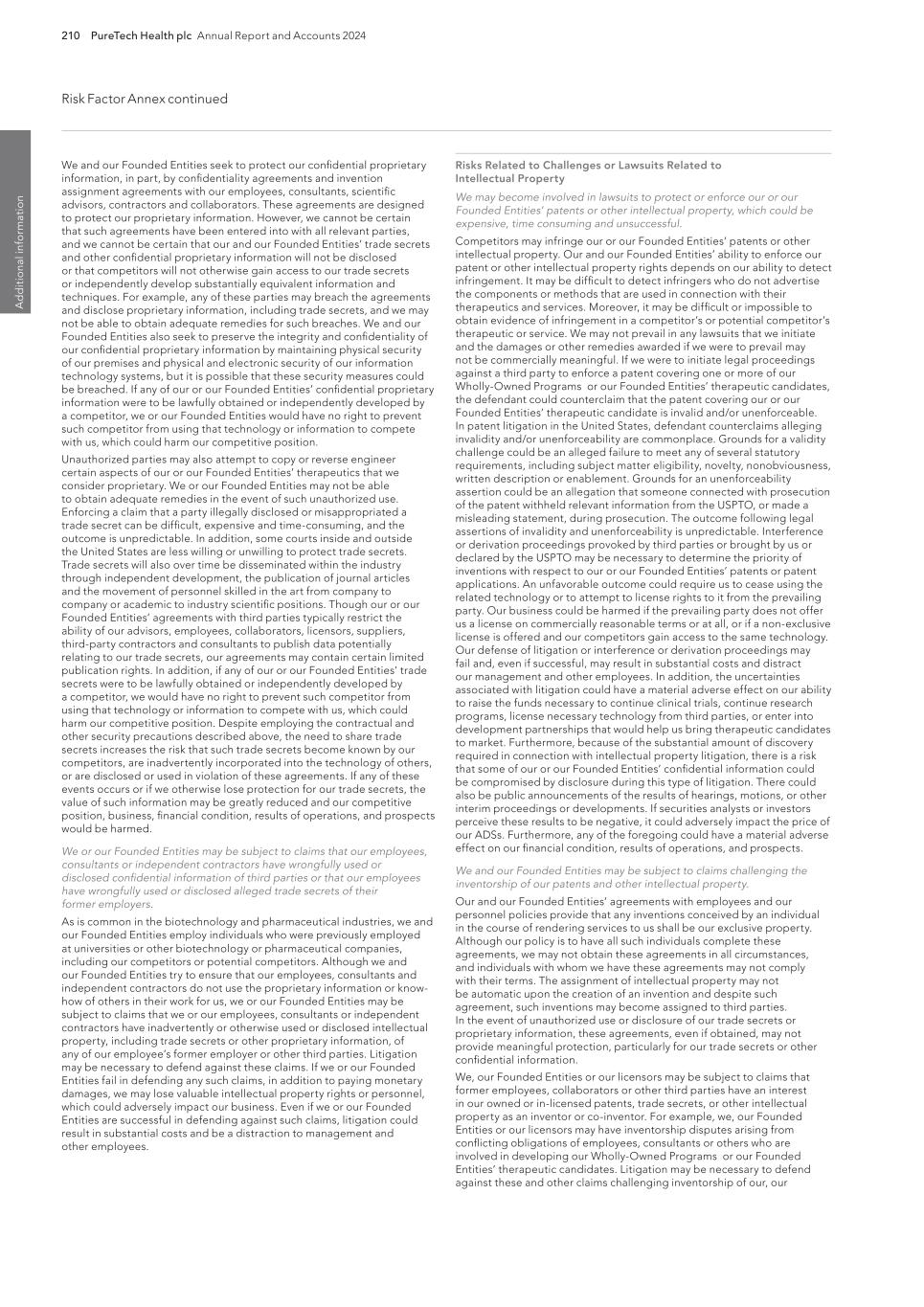 210  PureTech Health plc Annual Report and Accounts 2024 Risk Factor Annex continued A d d it io na l i nf o rm at io n Risks Related to Challenges or Lawsuits Related to  Intellectual Property We may become involved in lawsuits to protect or enforce our or our  Founded Entities’ patents or other intellectual property, which could be  expensive, time consuming and unsuccessful. Competitors may infringe our or our Founded Entities’ patents or other  intellectual property. Our and our Founded Entities’ ability to enforce our  patent or other intellectual property rights depends on our ability to detect  infringement. It may be difficult to detect infringers who do not advertise  the components or methods that are used in connection with their  therapeutics and services. Moreover, it may be difficult or impossible to  obtain evidence of infringement in a competitor’s or potential competitor’s  therapeutic or service. We may not prevail in any lawsuits that we initiate  and the damages or other remedies awarded if we were to prevail may  not be commercially meaningful. If we were to initiate legal proceedings  against a third party to enforce a patent covering one or more of our  Wholly-Owned Programs  or our Founded Entities’ therapeutic candidates,  the defendant could counterclaim that the patent covering our or our  Founded Entities’ therapeutic candidate is invalid and/or unenforceable.  In patent litigation in the United States, defendant counterclaims alleging  invalidity and/or unenforceability are commonplace. Grounds for a validity  challenge could be an alleged failure to meet any of several statutory  requirements, including subject matter eligibility, novelty, nonobviousness,  written description or enablement. Grounds for an unenforceability  assertion could be an allegation that someone connected with prosecution  of the patent withheld relevant information from the USPTO, or made a  misleading statement, during prosecution. The outcome following legal  assertions of invalidity and unenforceability is unpredictable. Interference  or derivation proceedings provoked by third parties or brought by us or  declared by the USPTO may be necessary to determine the priority of  inventions with respect to our or our Founded Entities’ patents or patent  applications. An unfavorable outcome could require us to cease using the  related technology or to attempt to license rights to it from the prevailing  party. Our business could be harmed if the prevailing party does not offer  us a license on commercially reasonable terms or at all, or if a non-exclusive  license is offered and our competitors gain access to the same technology.  Our defense of litigation or interference or derivation proceedings may  fail and, even if successful, may result in substantial costs and distract  our management and other employees. In addition, the uncertainties  associated with litigation could have a material adverse effect on our ability  to raise the funds necessary to continue clinical trials, continue research  programs, license necessary technology from third parties, or enter into  development partnerships that would help us bring therapeutic candidates  to market. Furthermore, because of the substantial amount of discovery  required in connection with intellectual property litigation, there is a risk  that some of our or our Founded Entities’ confidential information could  be compromised by disclosure during this type of litigation. There could  also be public announcements of the results of hearings, motions, or other  interim proceedings or developments. If securities analysts or investors  perceive these results to be negative, it could adversely impact the price of  our ADSs. Furthermore, any of the foregoing could have a material adverse  effect on our financial condition, results of operations, and prospects. We and our Founded Entities may be subject to claims challenging the  inventorship of our patents and other intellectual property. Our and our Founded Entities’ agreements with employees and our  personnel policies provide that any inventions conceived by an individual  in the course of rendering services to us shall be our exclusive property.  Although our policy is to have all such individuals complete these  agreements, we may not obtain these agreements in all circumstances,  and individuals with whom we have these agreements may not comply  with their terms. The assignment of intellectual property may not  be automatic upon the creation of an invention and despite such  agreement, such inventions may become assigned to third parties.  In the event of unauthorized use or disclosure of our trade secrets or  proprietary information, these agreements, even if obtained, may not  provide meaningful protection, particularly for our trade secrets or other  confidential information. We, our Founded Entities or our licensors may be subject to claims that  former employees, collaborators or other third parties have an interest  in our owned or in-licensed patents, trade secrets, or other intellectual  property as an inventor or co-inventor. For example, we, our Founded  Entities or our licensors may have inventorship disputes arising from  conflicting obligations of employees, consultants or others who are  involved in developing our Wholly-Owned Programs  or our Founded  Entities’ therapeutic candidates. Litigation may be necessary to defend  against these and other claims challenging inventorship of our, our  We and our Founded Entities seek to protect our confidential proprietary  information, in part, by confidentiality agreements and invention  assignment agreements with our employees, consultants, scientific  advisors, contractors and collaborators. These agreements are designed  to protect our proprietary information. However, we cannot be certain  that such agreements have been entered into with all relevant parties,  and we cannot be certain that our and our Foun