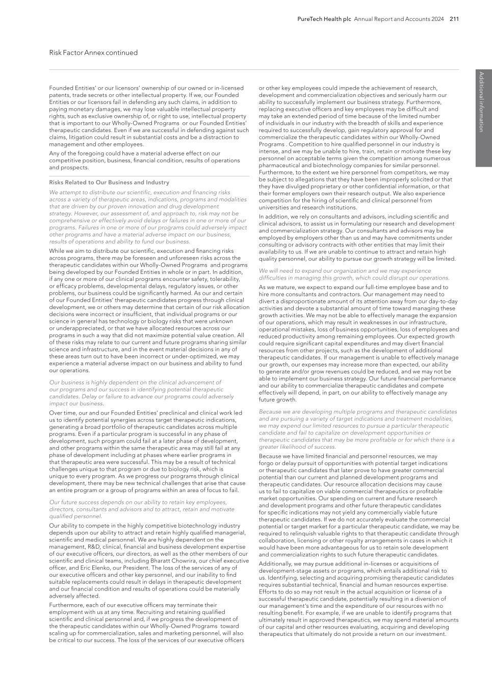 PureTech Health plc Annual Report and Accounts 2024  211  Risk Factor Annex continued A d d itio nal info rm atio n or other key employees could impede the achievement of research,  development and commercialization objectives and seriously harm our  ability to successfully implement our business strategy. Furthermore,  replacing executive officers and key employees may be difficult and  may take an extended period of time because of the limited number  of individuals in our industry with the breadth of skills and experience  required to successfully develop, gain regulatory approval for and  commercialize the therapeutic candidates within our Wholly-Owned  Programs . Competition to hire qualified personnel in our industry is  intense, and we may be unable to hire, train, retain or motivate these key  personnel on acceptable terms given the competition among numerous  pharmaceutical and biotechnology companies for similar personnel.  Furthermore, to the extent we hire personnel from competitors, we may  be subject to allegations that they have been improperly solicited or that  they have divulged proprietary or other confidential information, or that  their former employers own their research output. We also experience  competition for the hiring of scientific and clinical personnel from  universities and research institutions. In addition, we rely on consultants and advisors, including scientific and  clinical advisors, to assist us in formulating our research and development  and commercialization strategy. Our consultants and advisors may be  employed by employers other than us and may have commitments under  consulting or advisory contracts with other entities that may limit their  availability to us. If we are unable to continue to attract and retain high  quality personnel, our ability to pursue our growth strategy will be limited. We will need to expand our organization and we may experience  difficulties in managing this growth, which could disrupt our operations. As we mature, we expect to expand our full-time employee base and to  hire more consultants and contractors. Our management may need to  divert a disproportionate amount of its attention away from our day-to-day  activities and devote a substantial amount of time toward managing these  growth activities. We may not be able to effectively manage the expansion  of our operations, which may result in weaknesses in our infrastructure,  operational mistakes, loss of business opportunities, loss of employees and  reduced productivity among remaining employees. Our expected growth  could require significant capital expenditures and may divert financial  resources from other projects, such as the development of additional  therapeutic candidates. If our management is unable to effectively manage  our growth, our expenses may increase more than expected, our ability  to generate and/or grow revenues could be reduced, and we may not be  able to implement our business strategy. Our future financial performance  and our ability to commercialize therapeutic candidates and compete  effectively will depend, in part, on our ability to effectively manage any  future growth. Because we are developing multiple programs and therapeutic candidates  and are pursuing a variety of target indications and treatment modalities,  we may expend our limited resources to pursue a particular therapeutic  candidate and fail to capitalize on development opportunities or  therapeutic candidates that may be more profitable or for which there is a  greater likelihood of success. Because we have limited financial and personnel resources, we may  forgo or delay pursuit of opportunities with potential target indications  or therapeutic candidates that later prove to have greater commercial  potential than our current and planned development programs and  therapeutic candidates. Our resource allocation decisions may cause  us to fail to capitalize on viable commercial therapeutics or profitable  market opportunities. Our spending on current and future research  and development programs and other future therapeutic candidates  for specific indications may not yield any commercially viable future  therapeutic candidates. If we do not accurately evaluate the commercial  potential or target market for a particular therapeutic candidate, we may be  required to relinquish valuable rights to that therapeutic candidate through  collaboration, licensing or other royalty arrangements in cases in which it  would have been more advantageous for us to retain sole development  and commercialization rights to such future therapeutic candidates. Additionally, we may pursue additional in-licenses or acquisitions of  development-stage assets or programs, which entails additional risk to  us. Identifying, selecting and acquiring promising therapeutic candidates  requires substantial technical, financial and human resources expertise.  Efforts to do so may not result in the actual acquisition or license of a  successful therapeutic candidate, potentially resulting in a diversion of  our management’s time and the expenditure of our resources with no  resulting benefit. For example, if we are unable to identify programs that  ultimately result in approved therapeutics, we may spend material amounts  of our capital and other resources evaluating, acquiring and developing  therapeutics that ultimately do not provide a return on our investment. Founded Entities’ or our licensors’ ownership of our owned or in-licensed  patents, trade secrets or other intellectual property. If we, our Founded  Entities or our licensors fail in defending any such claims, in addition to  paying monetary damages, we may lose valuable intellectual property  rights, such as exclusive ownership of, or right to use, intellectual property  that is important to our Wholly-Owned Programs  or our Founded Entities’  therapeutic candidates. Even if we are successful in defending against such  claims, litigat