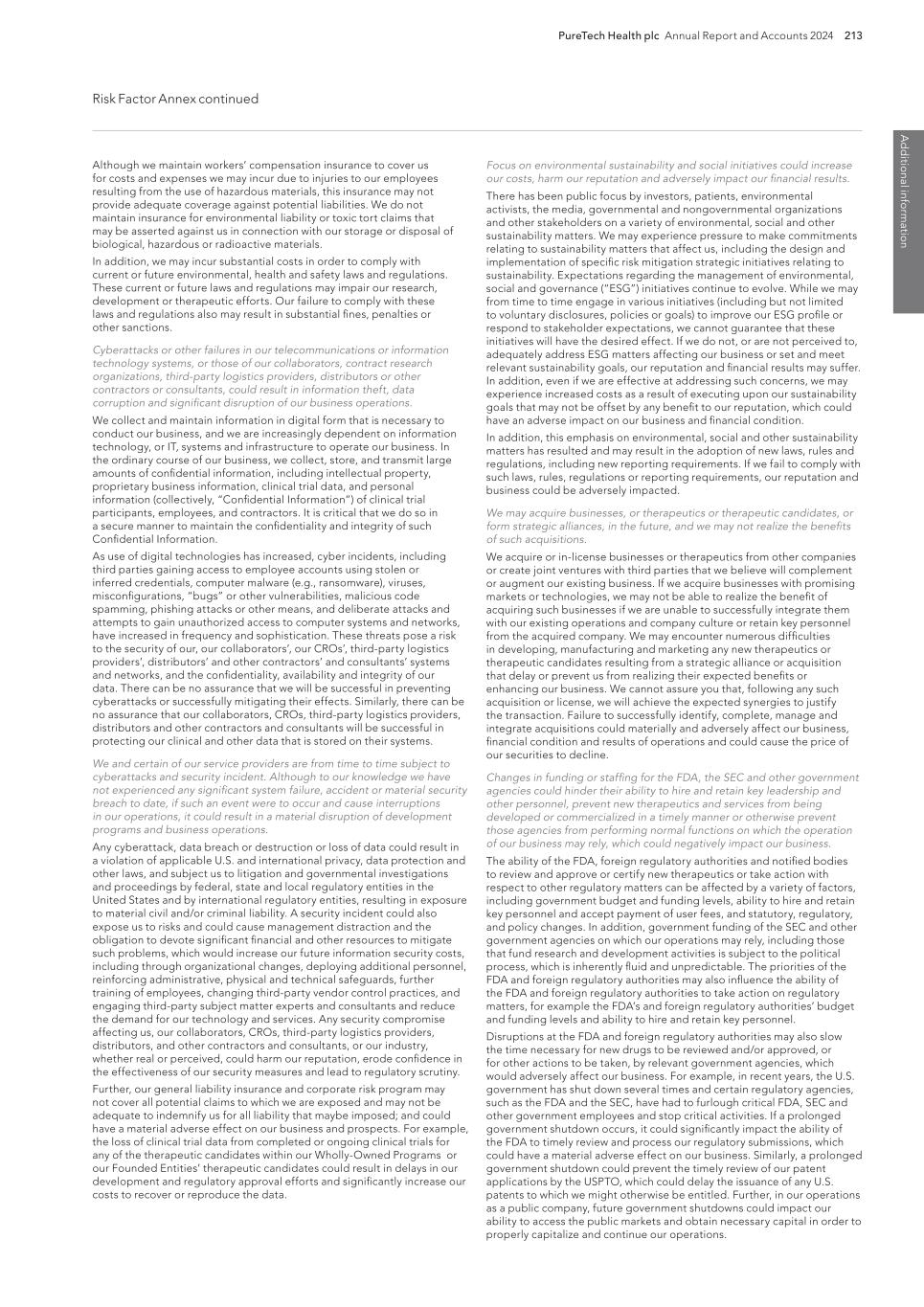 PureTech Health plc Annual Report and Accounts 2024  213  Risk Factor Annex continued A d d itio nal info rm atio n Focus on environmental sustainability and social initiatives could increase  our costs, harm our reputation and adversely impact our financial results. There has been public focus by investors, patients, environmental  activists, the media, governmental and nongovernmental organizations  and other stakeholders on a variety of environmental, social and other  sustainability matters. We may experience pressure to make commitments  relating to sustainability matters that affect us, including the design and  implementation of specific risk mitigation strategic initiatives relating to  sustainability. Expectations regarding the management of environmental,  social and governance (“ESG”) initiatives continue to evolve. While we may  from time to time engage in various initiatives (including but not limited  to voluntary disclosures, policies or goals) to improve our ESG profile or  respond to stakeholder expectations, we cannot guarantee that these  initiatives will have the desired effect. If we do not, or are not perceived to,  adequately address ESG matters affecting our business or set and meet  relevant sustainability goals, our reputation and financial results may suffer.  In addition, even if we are effective at addressing such concerns, we may  experience increased costs as a result of executing upon our sustainability  goals that may not be offset by any benefit to our reputation, which could  have an adverse impact on our business and financial condition. In addition, this emphasis on environmental, social and other sustainability  matters has resulted and may result in the adoption of new laws, rules and  regulations, including new reporting requirements. If we fail to comply with  such laws, rules, regulations or reporting requirements, our reputation and  business could be adversely impacted. We may acquire businesses, or therapeutics or therapeutic candidates, or  form strategic alliances, in the future, and we may not realize the benefits  of such acquisitions.  We acquire or in-license businesses or therapeutics from other companies  or create joint ventures with third parties that we believe will complement  or augment our existing business. If we acquire businesses with promising  markets or technologies, we may not be able to realize the benefit of  acquiring such businesses if we are unable to successfully integrate them  with our existing operations and company culture or retain key personnel  from the acquired company. We may encounter numerous difficulties  in developing, manufacturing and marketing any new therapeutics or  therapeutic candidates resulting from a strategic alliance or acquisition  that delay or prevent us from realizing their expected benefits or  enhancing our business. We cannot assure you that, following any such  acquisition or license, we will achieve the expected synergies to justify  the transaction. Failure to successfully identify, complete, manage and  integrate acquisitions could materially and adversely affect our business,  financial condition and results of operations and could cause the price of  our securities to decline. Changes in funding or staffing for the FDA, the SEC and other government  agencies could hinder their ability to hire and retain key leadership and  other personnel, prevent new therapeutics and services from being  developed or commercialized in a timely manner or otherwise prevent  those agencies from performing normal functions on which the operation  of our business may rely, which could negatively impact our business. The ability of the FDA, foreign regulatory authorities and notified bodies  to review and approve or certify new therapeutics or take action with  respect to other regulatory matters can be affected by a variety of factors,  including government budget and funding levels, ability to hire and retain  key personnel and accept payment of user fees, and statutory, regulatory,  and policy changes. In addition, government funding of the SEC and other  government agencies on which our operations may rely, including those  that fund research and development activities is subject to the political  process, which is inherently fluid and unpredictable. The priorities of the  FDA and foreign regulatory authorities may also influence the ability of  the FDA and foreign regulatory authorities to take action on regulatory  matters, for example the FDA’s and foreign regulatory authorities’ budget  and funding levels and ability to hire and retain key personnel. Disruptions at the FDA and foreign regulatory authorities may also slow  the time necessary for new drugs to be reviewed and/or approved, or  for other actions to be taken, by relevant government agencies, which  would adversely affect our business. For example, in recent years, the U.S.  government has shut down several times and certain regulatory agencies,  such as the FDA and the SEC, have had to furlough critical FDA, SEC and  other government employees and stop critical activities. If a prolonged  government shutdown occurs, it could significantly impact the ability of  the FDA to timely review and process our regulatory submissions, which  could have a material adverse effect on our business. Similarly, a prolonged  government shutdown could prevent the timely review of our patent  applications by the USPTO, which could delay the issuance of any U.S.  patents to which we might otherwise be entitled. Further, in our operations  as a public company, future government shutdowns could impact our  ability to access the public markets and obtain necessary capital in order to  properly capitalize and continue our operations. Although we maintain workers’ compensation insurance to cover us  for costs and expenses we may incur due to injuries to our employees  resulting from the use of hazardous materials, this insurance may not  provide a