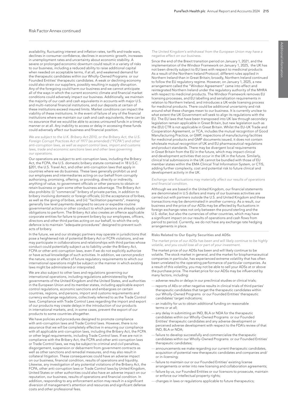 PureTech Health plc Annual Report and Accounts 2024  215  Risk Factor Annex continued A d d itio nal info rm atio n The United Kingdom’s withdrawal from the European Union may have a  negative effect on our business. Since the end of the Brexit transition period on January 1, 2021, and the  implementation of the Windsor Framework on January 1, 2025,  the UK has  not been directly subject to EU laws with respect to medicinal products  As a result of the Northern Ireland Protocol, different rules applied in  Northern Ireland than in Great Britain; broadly, Northern Ireland continued  to follow the EU regulatory regime. However, on January 1, 2025, a new  arrangement called the “Windsor Agreement” came into effect and  reintegrated Northern Ireland under the regulatory authority of the MHRA  with respect to medicinal products. The Windsor Framework removes EU  licensing processes, and EU labelling and serialization requirements in  relation to Northern Ireland, and introduces a UK-wide licensing process  for medicinal products. There could be additional uncertainty and risk  around what these changes mean to our business. It is currently unclear to  what extent the UK Government will seek to align its regulations with the  EU. The EU laws that have been transposed into UK law through secondary  legislation remain applicable in Great Britain, but new legislation such as  the (EU) CTR is not applicable in Great Britain. Whilst the EU-UK Trade and  Cooperation Agreement, or TCA, includes the mutual recognition of Good  Manufacturing Practice, or GMP, inspections of manufacturing facilities  for medicinal products and GMP documents issued, it does not contain  wholesale mutual recognition of UK and EU pharmaceutical regulations  and product standards. There may be divergent local requirements  in Great Britain from the EU in the future, which may impact clinical  and development activities that occur in the UK in the future. Similarly,  clinical trial submissions in the UK cannot be bundled with those of EU  member states within the EMA Clinical Trial Information System, or CTIS,  adding further complexity, cost and potential risk to future clinical and  development activity in the UK.  Exchange rate fluctuations may materially affect our results of operations  and financial condition. Although we are based in the United Kingdom, our financial statements  are denominated in U.S dollars and many of our business activities are  carried out with partners outside the U.S. and United Kingdom and these  transactions may be denominated in another currency. As a result, our  business and the price of our ADSs may be affected by fluctuations in  foreign exchange rates not only between the pound sterling and the  U.S. dollar, but also the currencies of other countries, which may have  a significant impact on our results of operations and cash flows from  period to period. Currently, we do not have any exchange rate hedging  arrangements in place. Risks Related to Our Equity Securities and ADSs The market price of our ADSs has been and will likely continue to be highly  volatile, and you could lose all or part of your investment. The market price of our ADSs has been and will likely continue to be  volatile. The stock market in general, and the market for biopharmaceutical  companies in particular, has experienced extreme volatility that has often  been unrelated to the operating performance of particular companies. As  a result of this volatility, you may not be able to sell your ADSs at or above  the purchase price. The market price for our ADSs may be influenced by  many factors, including:  — adverse results or delays in our preclinical studies or clinical trials;  — reports of AEs or other negative results in clinical trials of third parties’  therapeutic candidates that target the therapeutic candidates within  our Wholly-Owned Programs  or our Founded Entities’ therapeutic  candidates’ target indications;  — an inability for us to obtain additional funding on reasonable  terms or at all;  — any delay in submitting an IND, BLA or NDA for the therapeutic  candidates within our Wholly-Owned Programs  or our Founded  Entities’ therapeutic candidates and any adverse development or  perceived adverse development with respect to the FDA’s review of that  IND, BLA or NDA;  — failure to develop successfully and commercialize the therapeutic  candidates within our Wholly-Owned Programs  or our Founded Entities’  therapeutic candidates;  — announcements we make regarding our current therapeutic candidates,  acquisition of potential new therapeutic candidates and companies and/ or in-licensing;  — failure to maintain our or our Founded Entities’ existing license  arrangements or enter into new licensing and collaboration agreements;  — failure by us, our Founded Entities or our licensors to prosecute, maintain  or enforce our intellectual property rights;  — changes in laws or regulations applicable to future therapeutics; availability, fluctuating interest and inflation rates, tariffs and trade wars,  declines in consumer confidence, declines in economic growth, increases  in unemployment rates and uncertainty about economic stability. A  severe or prolonged economic downturn could result in a variety of risks  to our business, including a reduced ability to raise additional capital  when needed on acceptable terms, if at all, and weakened demand for  the therapeutic candidates within our Wholly-Owned Programs  or our  Founded Entities’ therapeutic candidates. A weak or declining economy  could also strain our suppliers, possibly resulting in supply disruption.  Any of the foregoing could harm our business and we cannot anticipate  all of the ways in which the current economic climate and financial market  conditions could adversely impact our business. Additionally, we maintain  the majority of our cash and cash equivalents in accounts with major U.S.  and multi-nation