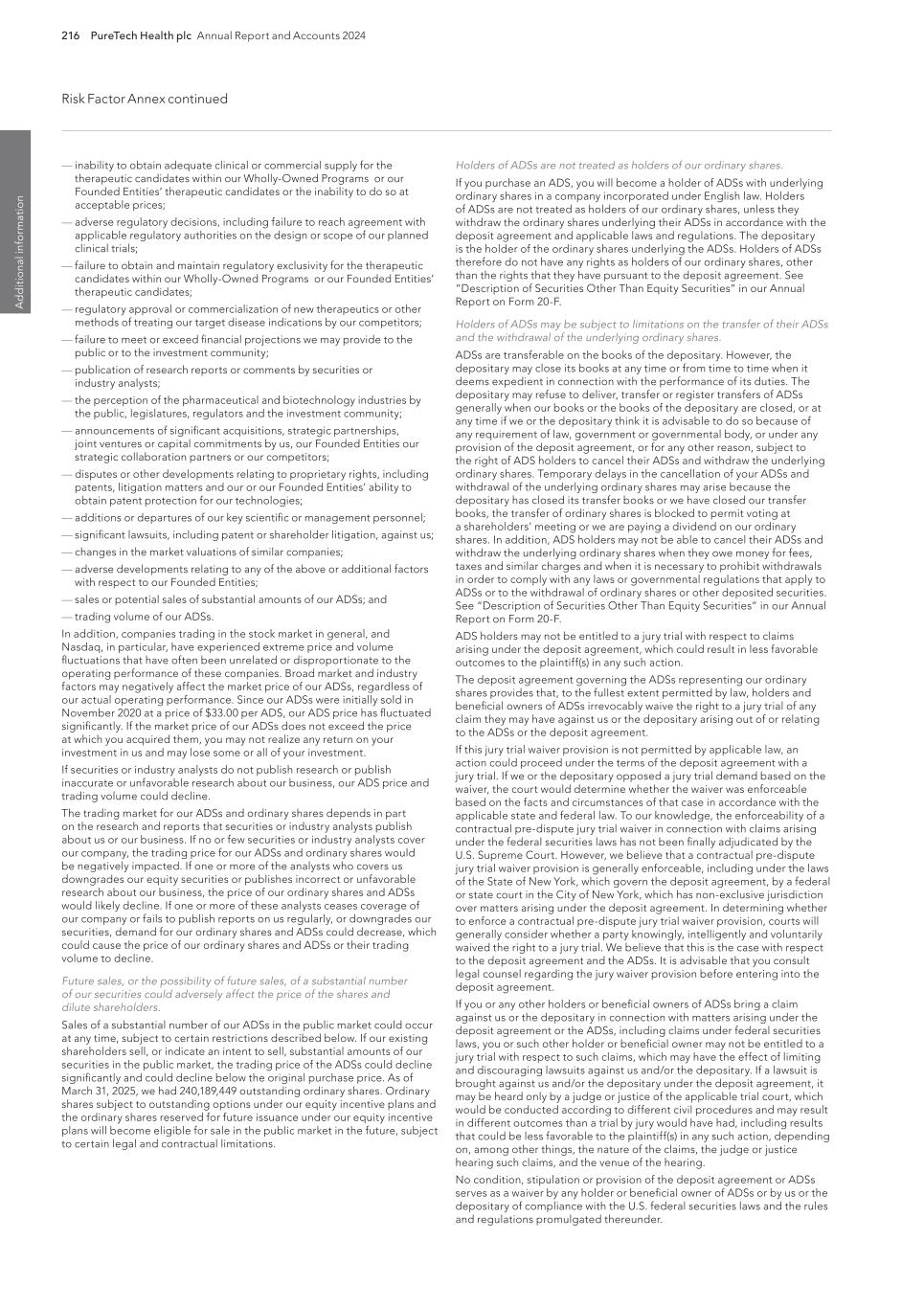 216  PureTech Health plc Annual Report and Accounts 2024 Risk Factor Annex continued A d d it io na l i nf o rm at io n Holders of ADSs are not treated as holders of our ordinary shares. If you purchase an ADS, you will become a holder of ADSs with underlying  ordinary shares in a company incorporated under English law. Holders  of ADSs are not treated as holders of our ordinary shares, unless they  withdraw the ordinary shares underlying their ADSs in accordance with the  deposit agreement and applicable laws and regulations. The depositary  is the holder of the ordinary shares underlying the ADSs. Holders of ADSs  therefore do not have any rights as holders of our ordinary shares, other  than the rights that they have pursuant to the deposit agreement. See  “Description of Securities Other Than Equity Securities” in our Annual  Report on Form 20-F. Holders of ADSs may be subject to limitations on the transfer of their ADSs  and the withdrawal of the underlying ordinary shares. ADSs are transferable on the books of the depositary. However, the  depositary may close its books at any time or from time to time when it  deems expedient in connection with the performance of its duties. The  depositary may refuse to deliver, transfer or register transfers of ADSs  generally when our books or the books of the depositary are closed, or at  any time if we or the depositary think it is advisable to do so because of  any requirement of law, government or governmental body, or under any  provision of the deposit agreement, or for any other reason, subject to  the right of ADS holders to cancel their ADSs and withdraw the underlying  ordinary shares. Temporary delays in the cancellation of your ADSs and  withdrawal of the underlying ordinary shares may arise because the  depositary has closed its transfer books or we have closed our transfer  books, the transfer of ordinary shares is blocked to permit voting at  a shareholders’ meeting or we are paying a dividend on our ordinary  shares. In addition, ADS holders may not be able to cancel their ADSs and  withdraw the underlying ordinary shares when they owe money for fees,  taxes and similar charges and when it is necessary to prohibit withdrawals  in order to comply with any laws or governmental regulations that apply to  ADSs or to the withdrawal of ordinary shares or other deposited securities.  See “Description of Securities Other Than Equity Securities” in our Annual  Report on Form 20-F. ADS holders may not be entitled to a jury trial with respect to claims  arising under the deposit agreement, which could result in less favorable  outcomes to the plaintiff(s) in any such action. The deposit agreement governing the ADSs representing our ordinary  shares provides that, to the fullest extent permitted by law, holders and  beneficial owners of ADSs irrevocably waive the right to a jury trial of any  claim they may have against us or the depositary arising out of or relating  to the ADSs or the deposit agreement. If this jury trial waiver provision is not permitted by applicable law, an  action could proceed under the terms of the deposit agreement with a  jury trial. If we or the depositary opposed a jury trial demand based on the  waiver, the court would determine whether the waiver was enforceable  based on the facts and circumstances of that case in accordance with the  applicable state and federal law. To our knowledge, the enforceability of a  contractual pre-dispute jury trial waiver in connection with claims arising  under the federal securities laws has not been finally adjudicated by the  U.S. Supreme Court. However, we believe that a contractual pre-dispute  jury trial waiver provision is generally enforceable, including under the laws  of the State of New York, which govern the deposit agreement, by a federal  or state court in the City of New York, which has non-exclusive jurisdiction  over matters arising under the deposit agreement. In determining whether  to enforce a contractual pre-dispute jury trial waiver provision, courts will  generally consider whether a party knowingly, intelligently and voluntarily  waived the right to a jury trial. We believe that this is the case with respect  to the deposit agreement and the ADSs. It is advisable that you consult  legal counsel regarding the jury waiver provision before entering into the  deposit agreement. If you or any other holders or beneficial owners of ADSs bring a claim  against us or the depositary in connection with matters arising under the  deposit agreement or the ADSs, including claims under federal securities  laws, you or such other holder or beneficial owner may not be entitled to a  jury trial with respect to such claims, which may have the effect of limiting  and discouraging lawsuits against us and/or the depositary. If a lawsuit is  brought against us and/or the depositary under the deposit agreement, it  may be heard only by a judge or justice of the applicable trial court, which  would be conducted according to different civil procedures and may result  in different outcomes than a trial by jury would have had, including results  that could be less favorable to the plaintiff(s) in any such action, depending  on, among other things, the nature of the claims, the judge or justice  hearing such claims, and the venue of the hearing. No condition, stipulation or provision of the deposit agreement or ADSs  serves as a waiver by any holder or beneficial owner of ADSs or by us or the  depositary of compliance with the U.S. federal securities laws and the rules  and regulations promulgated thereunder.  — inability to obtain adequate clinical or commercial supply for the  therapeutic candidates within our Wholly-Owned Programs  or our  Founded Entities’ therapeutic candidates or the inability to do so at  acceptable prices;  — adverse regulatory decisions, including failure to reach agreement with  applicable regulatory authorities on the design or scope of ou