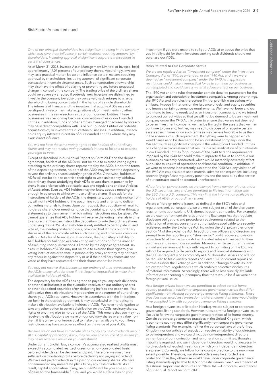PureTech Health plc Annual Report and Accounts 2024  217  Risk Factor Annex continued A d d itio nal info rm atio n One of our principal shareholders has a significant holding in the company  which may give them influence in certain matters requiring approval by  shareholders, including approval of significant corporate transactions in  certain circumstances. As of March 31, 2025, Invesco Asset Management Limited, or Invesco, held  approximately 17.07 percent of our ordinary shares. Accordingly, Invesco  may, as a practical matter, be able to influence certain matters requiring  approval by shareholders, including approval of significant corporate  transactions in certain circumstances. Such concentration of ownership  may also have the effect of delaying or preventing any future proposed  change in control of the company. The trading price of the ordinary shares  could be adversely affected if potential new investors are disinclined to  invest in the company because they perceive disadvantages to a large  shareholding being concentrated in the hands of a single shareholder.  The interests of Invesco and the investors that acquire ADSs may not  be aligned. Invesco may make acquisitions of, or investments in, other  businesses in the same sectors as us or our Founded Entities. These  businesses may be, or may become, competitors of us or our Founded  Entities. In addition, funds or other entities managed or advised by Invesco  may be in direct competition with us or our Founded Entities on potential  acquisitions of, or investments in, certain businesses. In addition, Invesco  holds equity interests in certain of our Founded Entities where they may  exert direct influence. You will not have the same voting rights as the holders of our ordinary  shares and may not receive voting materials in time to be able to exercise  your right to vote. Except as described in our Annual Report on Form 20-F and the deposit  agreement, holders of the ADSs will not be able to exercise voting rights  attaching to the ordinary shares represented by the ADSs. Under the terms  of the deposit agreement, holders of the ADSs may instruct the depositary  to vote the ordinary shares underlying their ADSs. Otherwise, holders of  ADSs will not be able to exercise their right to vote unless they withdraw  the ordinary shares underlying their ADSs to vote them in person or by  proxy in accordance with applicable laws and regulations and our Articles  of Association. Even so, ADS holders may not know about a meeting far  enough in advance to withdraw those ordinary shares. If we ask for the  instructions of holders of the ADSs, the depositary, upon timely notice from  us, will notify ADS holders of the upcoming vote and arrange to deliver  our voting materials to them. Upon our request, the depositary will mail to  holders a shareholder meeting notice that contains, among other things, a  statement as to the manner in which voting instructions may be given. We  cannot guarantee that ADS holders will receive the voting materials in time  to ensure that they can instruct the depositary to vote the ordinary shares  underlying their ADSs. A shareholder is only entitled to participate in, and  vote at, the meeting of shareholders, provided that it holds our ordinary  shares as of the record date set for such meeting and otherwise complies  with our Articles of Association. In addition, the depositary’s liability to  ADS holders for failing to execute voting instructions or for the manner  of executing voting instructions is limited by the deposit agreement. As  a result, holders of ADSs may not be able to exercise their right to give  voting instructions or to vote in person or by proxy and they may not have  any recourse against the depositary or us if their ordinary shares are not  voted as they have requested or if their shares cannot be voted. You may not receive distributions on our ordinary shares represented by  the ADSs or any value for them if it is illegal or impractical to make them  available to holders of ADSs. The depositary for the ADSs has agreed to pay to you any cash dividends  or other distributions it or the custodian receives on our ordinary shares  or other deposited securities after deducting its fees and expenses. You  will receive these distributions in proportion to the number of our ordinary  shares your ADSs represent. However, in accordance with the limitations  set forth in the deposit agreement, it may be unlawful or impractical to  make a distribution available to holders of ADSs. We have no obligation to  take any other action to permit distribution on the ADSs, ordinary shares,  rights or anything else to holders of the ADSs. This means that you may not  receive the distributions we make on our ordinary shares or any value from  them if it is unlawful or impractical to make them available to you. These  restrictions may have an adverse effect on the value of your ADSs. Because we do not have immediate plans to pay any cash dividends on our  ADSs, capital appreciation, if any, may be your sole source of gains and you  may never receive a return on your investment. Under current English law, a company’s accumulated realized profits must  exceed its accumulated realized losses (on a non-consolidated basis)  before dividends can be declared and paid. Therefore, we must have  sufficient distributable profits before declaring and paying a dividend.  We have not paid dividends in the past on our ordinary shares. We have  not announced any immediate plans to pay any cash dividends. As a  result, capital appreciation, if any, on our ADSs will be your sole source  of gains for the foreseeable future, and you would suffer a loss on your  investment if you were unable to sell your ADSs at or above the price that  you initially paid for them. Investors seeking cash dividends should not  purchase our ADSs. Risks Related to Our Corporate Status  We are not regulated as an “investment company” under