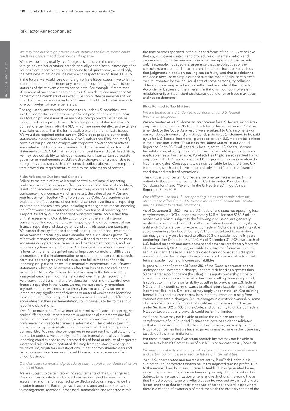 218  PureTech Health plc Annual Report and Accounts 2024 Risk Factor Annex continued A d d it io na l i nf o rm at io n the time periods specified in the rules and forms of the SEC. We believe  that any disclosure controls and procedures or internal controls and  procedures, no matter how well conceived and operated, can provide  only reasonable, not absolute, assurance that the objectives of the  control system are met. These inherent limitations include the realities  that judgments in decision-making can be faulty, and that breakdowns  can occur because of simple error or mistake. Additionally, controls can  be circumvented by the individual acts of some persons, by collusion  of two or more people or by an unauthorized override of the controls.  Accordingly, because of the inherent limitations in our control system,  misstatements or insufficient disclosures due to error or fraud may occur  and not be detected. Risks Related to Tax Matters We are treated as a U.S. domestic corporation for U.S. federal  income tax purposes. We are treated as a U.S. domestic corporation for U.S. federal income tax  purposes under Section 7874(b) of the Internal Revenue Code of 1986, as  amended, or the Code. As a result, we are subject to U.S. income tax on  our worldwide income and any dividends paid by us (or deemed to be paid  by us for U.S. federal income tax purposes) to Non-U.S. Holders (as defined  in the discussion under “Taxation in the United States” in our Annual  Report on Form 20-F) will generally be subject to U.S. federal income  tax withholding at a 30 percent rate or such lower rate as provided in an  applicable treaty. Furthermore, PureTech Health plc is also resident for tax  purposes in the U.K. and subject to U.K. corporation tax on its worldwide  income and gains. Consequently, we may be liable for both U.S. and U.K.  income tax, which could have a material adverse effect on our financial  condition and results of operations. This discussion of certain U.S. federal income tax risks is subject in its  entirety to the summaries set forth in “Certain United Kingdom Tax  Considerations” and “Taxation in the United States” in our Annual  Report on Form 20-F. Our ability to use our U.S. net operating losses and certain other tax  attributes to offset future U.S. taxable income and income tax liabilities  may be subject to certain limitations. As of December 31, 2024, we had U.S. federal and state net operating loss  carryforwards, or NOLs, of approximately $7.8 million and $380.8 million,  respectively, which, subject to the following discussion, are generally  available to be carried forward to offset our future taxable income, if any,  until such NOLs are used or expire. Our federal NOLs generated in taxable  years beginning after December 31, 2017 are not subject to expiration,  but may generally only be used to offset 80% of taxable income in years  beginning after December 31, 2020. As of December 31, 2024, we also had  U.S. federal research and development and other tax credit carryforwards  of approximately $0.2 million, available to reduce our future income tax  liabilities, if any. These NOLs and tax credit carryforwards could expire  unused, to the extent subject to expiration, and be unavailable to offset  future taxable income or income tax liabilities. In general, under Sections 382 and 383 of the Code, a corporation that  undergoes an “ownership change,” generally defined as a greater than  50 percentage point change (by value) in its equity ownership by certain  shareholders or groups of shareholders over a rolling three year period,  is subject to limitations on its ability to utilize its pre-change U.S. federal  NOLs  and tax credit carryforwards to offset future taxable income and  income tax liabilities. Similar rules may apply under state law. Our existing  federal NOLs and tax credits may be subject to limitation arising from  previous ownership changes. Future changes in our stock ownership, some  of which are outside of our control, could result in ownership changes  under Sections 382 or 383 of the Code, and our ability to utilize our federal  NOLs or tax credit carryforwards could be further limited. Additionally, we may not be able to utilize the NOLs or tax credit  carryforwards of our Founded Entities that have been deconsolidated  or that will deconsolidate in the future. Furthermore, our ability to utilize  NOLs of companies that we have acquired or may acquire in the future may  be subject to similar limitations. For these reasons, even if we attain profitability, we may not be able to  realize a tax benefit from the use of our NOLs or tax credit carryforwards. We may be unable to use net operating loss and tax credit carryforwards  and certain built-in losses to reduce future U.K. tax liabilities. As a U.K. incorporated and tax resident entity, PureTech Health plc is  subject to U.K. corporate taxation on its tax-adjusted trading profits. Due  to the nature of our business, PureTech Health plc has generated losses  since inception and therefore we have not paid any U.K. corporation tax.  Subject to numerous utilization criteria and restrictions (including those  that limit the percentage of profits that can be reduced by carried forward  losses and those that can restrict the use of carried forward losses where  there is a change of ownership of more than half the ordinary shares of the  We may lose our foreign private issuer status in the future, which could  result in significant additional cost and expense. While we currently qualify as a foreign private issuer, the determination of  foreign private issuer status is made annually on the last business day of an  issuer’s most recently completed second fiscal quarter and, accordingly,  the next determination will be made with respect to us on June 30, 2025. In the future, we would lose our foreign private issuer status if we to fail to  meet the requirements necessary to maintain our fo