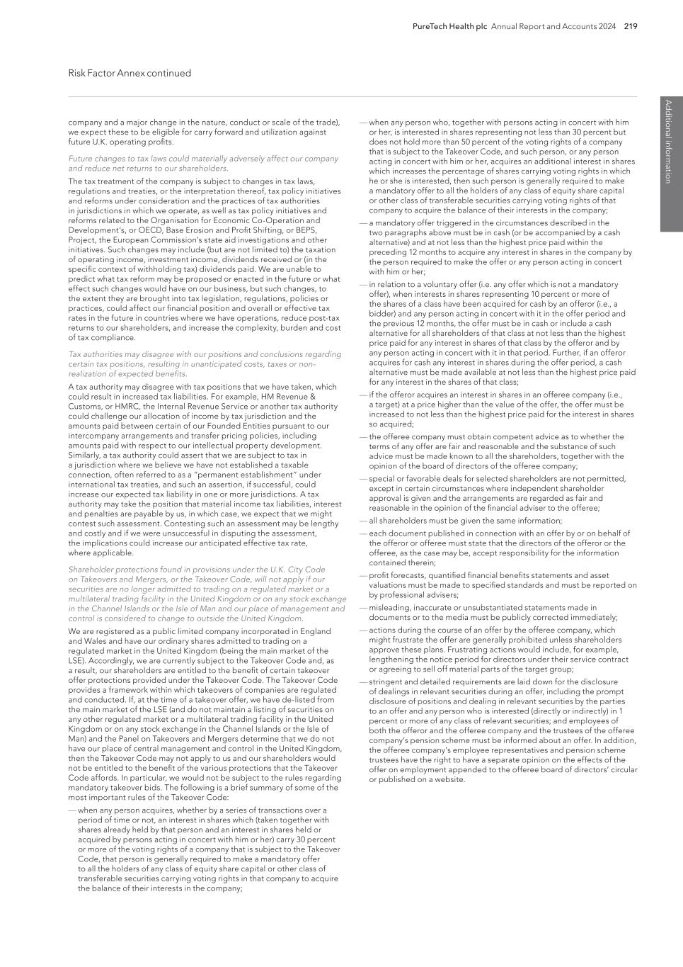 PureTech Health plc Annual Report and Accounts 2024  219  Risk Factor Annex continued A d d itio nal info rm atio n company and a major change in the nature, conduct or scale of the trade),  we expect these to be eligible for carry forward and utilization against  future U.K. operating profits. Future changes to tax laws could materially adversely affect our company  and reduce net returns to our shareholders. The tax treatment of the company is subject to changes in tax laws,  regulations and treaties, or the interpretation thereof, tax policy initiatives  and reforms under consideration and the practices of tax authorities  in jurisdictions in which we operate, as well as tax policy initiatives and  reforms related to the Organisation for Economic Co-Operation and  Development’s, or OECD, Base Erosion and Profit Shifting, or BEPS,  Project, the European Commission’s state aid investigations and other  initiatives. Such changes may include (but are not limited to) the taxation  of operating income, investment income, dividends received or (in the  specific context of withholding tax) dividends paid. We are unable to  predict what tax reform may be proposed or enacted in the future or what  effect such changes would have on our business, but such changes, to  the extent they are brought into tax legislation, regulations, policies or  practices, could affect our financial position and overall or effective tax  rates in the future in countries where we have operations, reduce post-tax  returns to our shareholders, and increase the complexity, burden and cost  of tax compliance. Tax authorities may disagree with our positions and conclusions regarding  certain tax positions, resulting in unanticipated costs, taxes or non- realization of expected benefits. A tax authority may disagree with tax positions that we have taken, which  could result in increased tax liabilities. For example, HM Revenue &  Customs, or HMRC, the Internal Revenue Service or another tax authority  could challenge our allocation of income by tax jurisdiction and the  amounts paid between certain of our Founded Entities pursuant to our  intercompany arrangements and transfer pricing policies, including  amounts paid with respect to our intellectual property development.  Similarly, a tax authority could assert that we are subject to tax in  a jurisdiction where we believe we have not established a taxable  connection, often referred to as a “permanent establishment” under  international tax treaties, and such an assertion, if successful, could  increase our expected tax liability in one or more jurisdictions. A tax  authority may take the position that material income tax liabilities, interest  and penalties are payable by us, in which case, we expect that we might  contest such assessment. Contesting such an assessment may be lengthy  and costly and if we were unsuccessful in disputing the assessment,  the implications could increase our anticipated effective tax rate,  where applicable. Shareholder protections found in provisions under the U.K. City Code  on Takeovers and Mergers, or the Takeover Code, will not apply if our  securities are no longer admitted to trading on a regulated market or a  multilateral trading facility in the United Kingdom or on any stock exchange  in the Channel Islands or the Isle of Man and our place of management and  control is considered to change to outside the United Kingdom. We are registered as a public limited company incorporated in England  and Wales and have our ordinary shares admitted to trading on a  regulated market in the United Kingdom (being the main market of the  LSE). Accordingly, we are currently subject to the Takeover Code and, as  a result, our shareholders are entitled to the benefit of certain takeover  offer protections provided under the Takeover Code. The Takeover Code  provides a framework within which takeovers of companies are regulated  and conducted. If, at the time of a takeover offer, we have de-listed from  the main market of the LSE (and do not maintain a listing of securities on  any other regulated market or a multilateral trading facility in the United  Kingdom or on any stock exchange in the Channel Islands or the Isle of  Man) and the Panel on Takeovers and Mergers determine that we do not  have our place of central management and control in the United Kingdom,  then the Takeover Code may not apply to us and our shareholders would  not be entitled to the benefit of the various protections that the Takeover  Code affords. In particular, we would not be subject to the rules regarding  mandatory takeover bids. The following is a brief summary of some of the  most important rules of the Takeover Code:  — when any person acquires, whether by a series of transactions over a  period of time or not, an interest in shares which (taken together with  shares already held by that person and an interest in shares held or  acquired by persons acting in concert with him or her) carry 30 percent  or more of the voting rights of a company that is subject to the Takeover  Code, that person is generally required to make a mandatory offer  to all the holders of any class of equity share capital or other class of  transferable securities carrying voting rights in that company to acquire  the balance of their interests in the company;  — when any person who, together with persons acting in concert with him  or her, is interested in shares representing not less than 30 percent but  does not hold more than 50 percent of the voting rights of a company  that is subject to the Takeover Code, and such person, or any person  acting in concert with him or her, acquires an additional interest in shares  which increases the percentage of shares carrying voting rights in which  he or she is interested, then such person is generally required to make  a mandatory offer to all the holders of any class of equity share capital  or other class of transferable securities carr