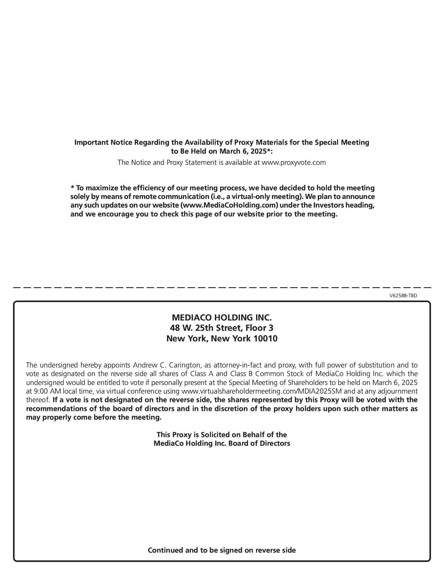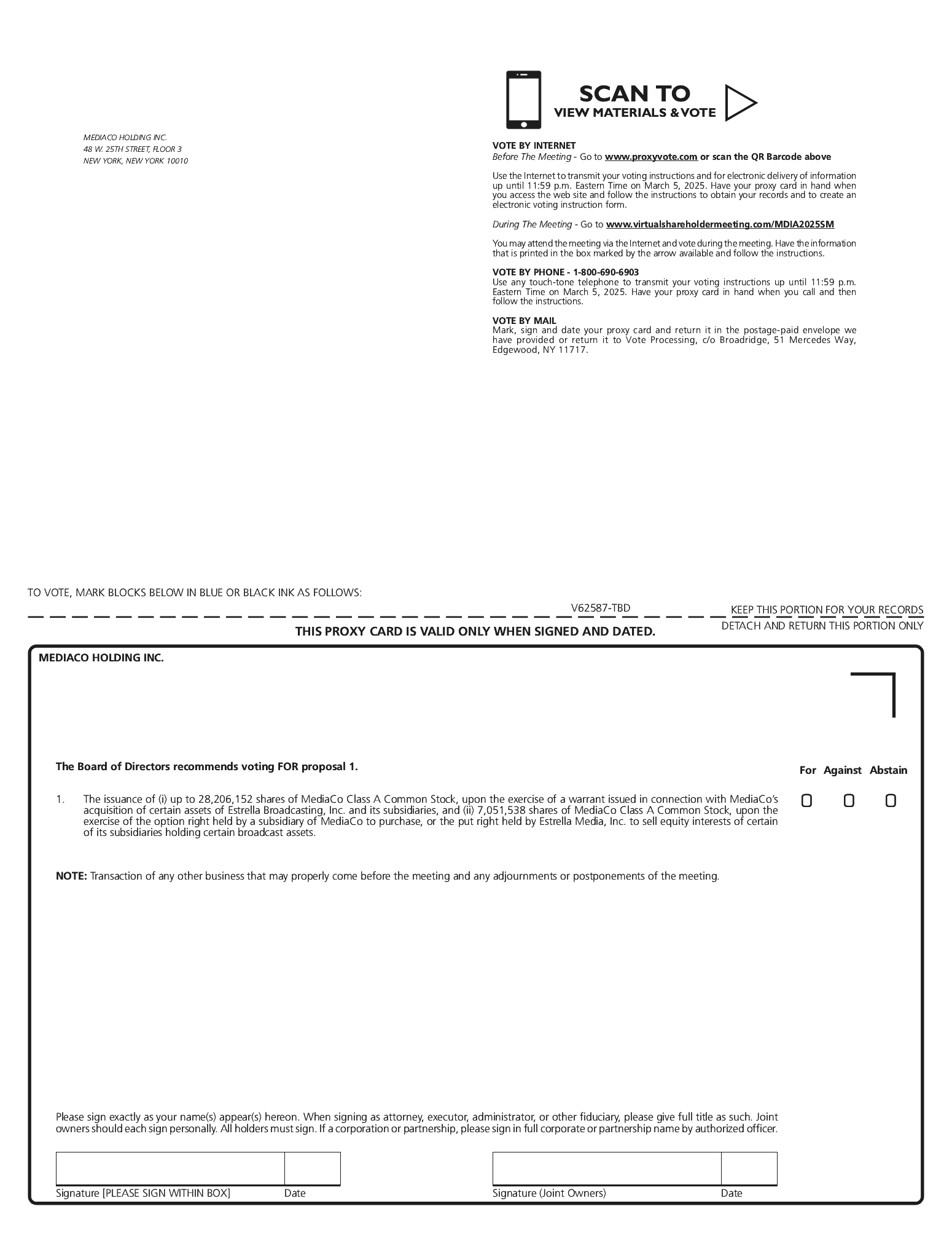On the evening of April 16, 2024, our board of directors held a special meeting to consider approving the proposed transaction and the entry into the transaction and financing documentation. MediaCo management provided our board of directors with an update on the status of final negotiations with Estrella and WhiteHawk. Representatives of Fried Frank reviewed the fiduciary duties of the directors in connection with their evaluation of the proposed transaction, and representatives of Fried Frank described the proposed final terms of the transaction and financing documents. Our board of directors then discussed the proposed transaction and, after carefully considering the matters discussed at that meeting and at prior meetings of our board of directors, adopted resolutions which, among other things: (i) determined and resolved that the transaction documentation was advisable and in the best interest of MediaCo and its stockholders; (ii) authorized MediaCo’s execution and delivery of the transaction documentation and authorized the issuance of 60,000 shares of Series B Preferred Stock, a warrant to purchase up to 28,206,152 Class A Shares, exercisable at an exercise price of $0.00001 per share, and a term loan in the principal amount of $30 million, each to an affiliate of HPS; and (iii) determined to recommend that MediaCo’s stockholders vote in favor of the Issuance Proposal.