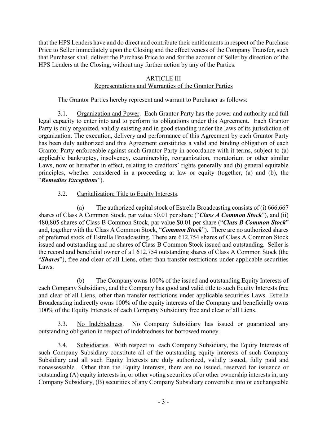 - 3 - that the HPS Lenders have and do direct and contribute their entitlements in respect of the Purchase Price to Seller immediately upon the Closing and the effectiveness of the Company Transfer, such that Purchaser shall deliver the Purchase Price to and for the account of Seller by direction of the HPS Lenders at the Closing, without any further action by any of the Parties. ARTICLE III Representations and Warranties of the Grantor Parties The Grantor Parties hereby represent and warrant to Purchaser as follows: 3.1. Organization and Power. Each Grantor Party has the power and authority and full legal capacity to enter into and to perform its obligations under this Agreement. Each Grantor Party is duly organized, validly existing and in good standing under the laws of its jurisdiction of organization. The execution, delivery and performance of this Agreement by each Grantor Party has been duly authorized and this Agreement constitutes a valid and binding obligation of each Grantor Party enforceable against such Grantor Party in accordance with it terms, subject to (a) applicable bankruptcy, insolvency, examinership, reorganization, moratorium or other similar Laws, now or hereafter in effect, relating to creditors’ rights generally and (b) general equitable principles, whether considered in a proceeding at law or equity (together, (a) and (b), the “Remedies Exceptions”). 3.2. Capitalization; Title to Equity Interests. (a) The authorized capital stock of Estrella Broadcasting consists of (i) 666,667 shares of Class A Common Stock, par value $0.01 per share (“Class A Common Stock”), and (ii) 480,805 shares of Class B Common Stock, par value $0.01 per share (“Class B Common Stock” and, together with the Class A Common Stock, “Common Stock”). There are no authorized shares of preferred stock of Estrella Broadcasting. There are 612,754 shares of Class A Common Stock issued and outstanding and no shares of Class B Common Stock issued and outstanding. Seller is the record and beneficial owner of all 612,754 outstanding shares of Class A Common Stock (the “Shares”), free and clear of all Liens, other than transfer restrictions under applicable securities Laws. (b) The Company owns 100% of the issued and outstanding Equity Interests of each Company Subsidiary, and the Company has good and valid title to such Equity Interests free and clear of all Liens, other than transfer restrictions under applicable securities Laws. Estrella Broadcasting indirectly owns 100% of the equity interests of the Company and beneficially owns 100% of the Equity Interests of each Company Subsidiary free and clear of all Liens. 3.3. No Indebtedness. No Company Subsidiary has issued or guaranteed any outstanding obligation in respect of indebtedness for borrowed money. 3.4. Subsidiaries. With respect to each Company Subsidiary, the Equity Interests of such Company Subsidiary constitute all of the outstanding equity interests of such Company Subsidiary and all such Equity Interests are duly authorized, validly issued, fully paid and nonassessable. Other than the Equity Interests, there are no issued, reserved for issuance or outstanding (A) equity interests in, or other voting securities of or other ownership interests in, any Company Subsidiary, (B) securities of any Company Subsidiary convertible into or exchangeable