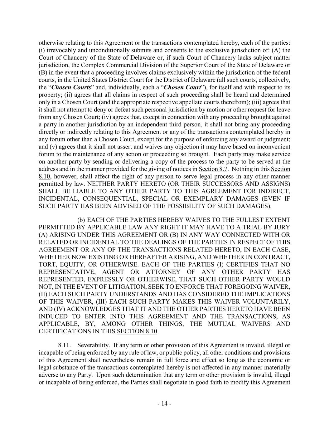 - 14 - otherwise relating to this Agreement or the transactions contemplated hereby, each of the parties: (i) irrevocably and unconditionally submits and consents to the exclusive jurisdiction of: (A) the Court of Chancery of the State of Delaware or, if such Court of Chancery lacks subject matter jurisdiction, the Complex Commercial Division of the Superior Court of the State of Delaware or (B) in the event that a proceeding involves claims exclusively within the jurisdiction of the federal courts, in the United States District Court for the District of Delaware (all such courts, collectively, the “Chosen Courts” and, individually, each a “Chosen Court”), for itself and with respect to its property; (ii) agrees that all claims in respect of such proceeding shall be heard and determined only in a Chosen Court (and the appropriate respective appellate courts therefrom); (iii) agrees that it shall not attempt to deny or defeat such personal jurisdiction by motion or other request for leave from any Chosen Court; (iv) agrees that, except in connection with any proceeding brought against a party in another jurisdiction by an independent third person, it shall not bring any proceeding directly or indirectly relating to this Agreement or any of the transactions contemplated hereby in any forum other than a Chosen Court, except for the purpose of enforcing any award or judgment; and (v) agrees that it shall not assert and waives any objection it may have based on inconvenient forum to the maintenance of any action or proceeding so brought. Each party may make service on another party by sending or delivering a copy of the process to the party to be served at the address and in the manner provided for the giving of notices in Section 8.7. Nothing in this Section 8.10, however, shall affect the right of any person to serve legal process in any other manner permitted by law. NEITHER PARTY HERETO (OR THEIR SUCCESSORS AND ASSIGNS) SHALL BE LIABLE TO ANY OTHER PARTY TO THIS AGREEMENT FOR INDIRECT, INCIDENTAL, CONSEQUENTIAL, SPECIAL OR EXEMPLARY DAMAGES (EVEN IF SUCH PARTY HAS BEEN ADVISED OF THE POSSIBILITY OF SUCH DAMAGES). (b) EACH OF THE PARTIES HEREBY WAIVES TO THE FULLEST EXTENT PERMITTED BY APPLICABLE LAW ANY RIGHT IT MAY HAVE TO A TRIAL BY JURY (A) ARISING UNDER THIS AGREEMENT OR (B) IN ANY WAY CONNECTED WITH OR RELATED OR INCIDENTAL TO THE DEALINGS OF THE PARTIES IN RESPECT OF THIS AGREEMENT OR ANY OF THE TRANSACTIONS RELATED HERETO, IN EACH CASE, WHETHER NOW EXISTING OR HEREAFTER ARISING, AND WHETHER IN CONTRACT, TORT, EQUITY, OR OTHERWISE. EACH OF THE PARTIES (I) CERTIFIES THAT NO REPRESENTATIVE, AGENT OR ATTORNEY OF ANY OTHER PARTY HAS REPRESENTED, EXPRESSLY OR OTHERWISE, THAT SUCH OTHER PARTY WOULD NOT, IN THE EVENT OF LITIGATION, SEEK TO ENFORCE THAT FOREGOING WAIVER, (II) EACH SUCH PARTY UNDERSTANDS AND HAS CONSIDERED THE IMPLICATIONS OF THIS WAIVER, (III) EACH SUCH PARTY MAKES THIS WAIVER VOLUNTARILY, AND (IV) ACKNOWLEDGES THAT IT AND THE OTHER PARTIES HERETO HAVE BEEN INDUCED TO ENTER INTO THIS AGREEMENT AND THE TRANSACTIONS, AS APPLICABLE, BY, AMONG OTHER THINGS, THE MUTUAL WAIVERS AND CERTIFICATIONS IN THIS SECTION 8.10. 8.11. Severability. If any term or other provision of this Agreement is invalid, illegal or incapable of being enforced by any rule of law, or public policy, all other conditions and provisions of this Agreement shall nevertheless remain in full force and effect so long as the economic or legal substance of the transactions contemplated hereby is not affected in any manner materially adverse to any Party. Upon such determination that any term or other provision is invalid, illegal or incapable of being enforced, the Parties shall negotiate in good faith to modify this Agreement