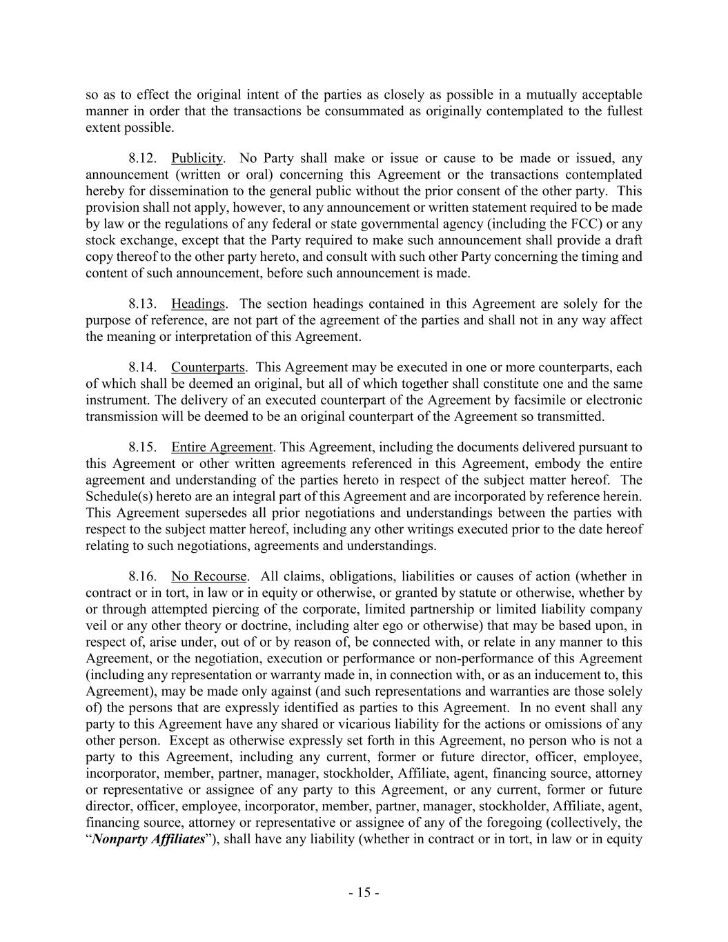 - 15 - so as to effect the original intent of the parties as closely as possible in a mutually acceptable manner in order that the transactions be consummated as originally contemplated to the fullest extent possible. 8.12. Publicity. No Party shall make or issue or cause to be made or issued, any announcement (written or oral) concerning this Agreement or the transactions contemplated hereby for dissemination to the general public without the prior consent of the other party. This provision shall not apply, however, to any announcement or written statement required to be made by law or the regulations of any federal or state governmental agency (including the FCC) or any stock exchange, except that the Party required to make such announcement shall provide a draft copy thereof to the other party hereto, and consult with such other Party concerning the timing and content of such announcement, before such announcement is made. 8.13. Headings. The section headings contained in this Agreement are solely for the purpose of reference, are not part of the agreement of the parties and shall not in any way affect the meaning or interpretation of this Agreement. 8.14. Counterparts. This Agreement may be executed in one or more counterparts, each of which shall be deemed an original, but all of which together shall constitute one and the same instrument. The delivery of an executed counterpart of the Agreement by facsimile or electronic transmission will be deemed to be an original counterpart of the Agreement so transmitted. 8.15. Entire Agreement. This Agreement, including the documents delivered pursuant to this Agreement or other written agreements referenced in this Agreement, embody the entire agreement and understanding of the parties hereto in respect of the subject matter hereof. The Schedule(s) hereto are an integral part of this Agreement and are incorporated by reference herein. This Agreement supersedes all prior negotiations and understandings between the parties with respect to the subject matter hereof, including any other writings executed prior to the date hereof relating to such negotiations, agreements and understandings. 8.16. No Recourse. All claims, obligations, liabilities or causes of action (whether in contract or in tort, in law or in equity or otherwise, or granted by statute or otherwise, whether by or through attempted piercing of the corporate, limited partnership or limited liability company veil or any other theory or doctrine, including alter ego or otherwise) that may be based upon, in respect of, arise under, out of or by reason of, be connected with, or relate in any manner to this Agreement, or the negotiation, execution or performance or non-performance of this Agreement (including any representation or warranty made in, in connection with, or as an inducement to, this Agreement), may be made only against (and such representations and warranties are those solely of) the persons that are expressly identified as parties to this Agreement. In no event shall any party to this Agreement have any shared or vicarious liability for the actions or omissions of any other person. Except as otherwise expressly set forth in this Agreement, no person who is not a party to this Agreement, including any current, former or future director, officer, employee, incorporator, member, partner, manager, stockholder, Affiliate, agent, financing source, attorney or representative or assignee of any party to this Agreement, or any current, former or future director, officer, employee, incorporator, member, partner, manager, stockholder, Affiliate, agent, financing source, attorney or representative or assignee of any of the foregoing (collectively, the “Nonparty Affiliates”), shall have any liability (whether in contract or in tort, in law or in equity