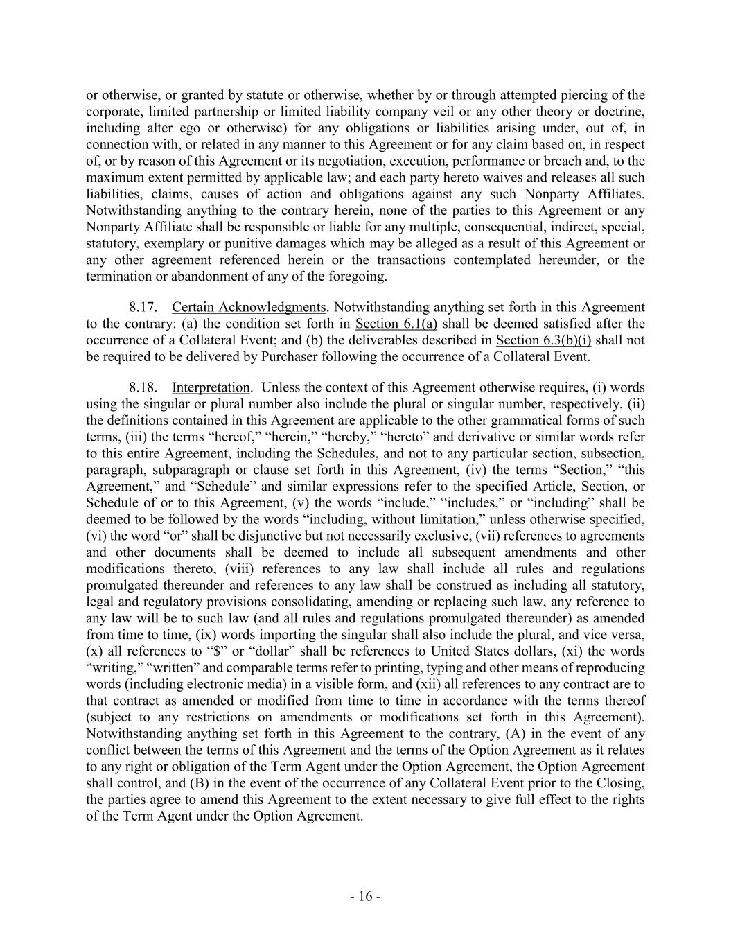 - 16 - or otherwise, or granted by statute or otherwise, whether by or through attempted piercing of the corporate, limited partnership or limited liability company veil or any other theory or doctrine, including alter ego or otherwise) for any obligations or liabilities arising under, out of, in connection with, or related in any manner to this Agreement or for any claim based on, in respect of, or by reason of this Agreement or its negotiation, execution, performance or breach and, to the maximum extent permitted by applicable law; and each party hereto waives and releases all such liabilities, claims, causes of action and obligations against any such Nonparty Affiliates. Notwithstanding anything to the contrary herein, none of the parties to this Agreement or any Nonparty Affiliate shall be responsible or liable for any multiple, consequential, indirect, special, statutory, exemplary or punitive damages which may be alleged as a result of this Agreement or any other agreement referenced herein or the transactions contemplated hereunder, or the termination or abandonment of any of the foregoing. 8.17. Certain Acknowledgments. Notwithstanding anything set forth in this Agreement to the contrary: (a) the condition set forth in Section 6.1(a) shall be deemed satisfied after the occurrence of a Collateral Event; and (b) the deliverables described in Section 6.3(b)(i) shall not be required to be delivered by Purchaser following the occurrence of a Collateral Event. 8.18. Interpretation. Unless the context of this Agreement otherwise requires, (i) words using the singular or plural number also include the plural or singular number, respectively, (ii) the definitions contained in this Agreement are applicable to the other grammatical forms of such terms, (iii) the terms “hereof,” “herein,” “hereby,” “hereto” and derivative or similar words refer to this entire Agreement, including the Schedules, and not to any particular section, subsection, paragraph, subparagraph or clause set forth in this Agreement, (iv) the terms “Section,” “this Agreement,” and “Schedule” and similar expressions refer to the specified Article, Section, or Schedule of or to this Agreement, (v) the words “include,” “includes,” or “including” shall be deemed to be followed by the words “including, without limitation,” unless otherwise specified, (vi) the word “or” shall be disjunctive but not necessarily exclusive, (vii) references to agreements and other documents shall be deemed to include all subsequent amendments and other modifications thereto, (viii) references to any law shall include all rules and regulations promulgated thereunder and references to any law shall be construed as including all statutory, legal and regulatory provisions consolidating, amending or replacing such law, any reference to any law will be to such law (and all rules and regulations promulgated thereunder) as amended from time to time, (ix) words importing the singular shall also include the plural, and vice versa, (x) all references to “$” or “dollar” shall be references to United States dollars, (xi) the words “writing,” “written” and comparable terms refer to printing, typing and other means of reproducing words (including electronic media) in a visible form, and (xii) all references to any contract are to that contract as amended or modified from time to time in accordance with the terms thereof (subject to any restrictions on amendments or modifications set forth in this Agreement). Notwithstanding anything set forth in this Agreement to the contrary, (A) in the event of any conflict between the terms of this Agreement and the terms of the Option Agreement as it relates to any right or obligation of the Term Agent under the Option Agreement, the Option Agreement shall control, and (B) in the event of the occurrence of any Collateral Event prior to the Closing, the parties agree to amend this Agreement to the extent necessary to give full effect to the rights of the Term Agent under the Option Agreement.