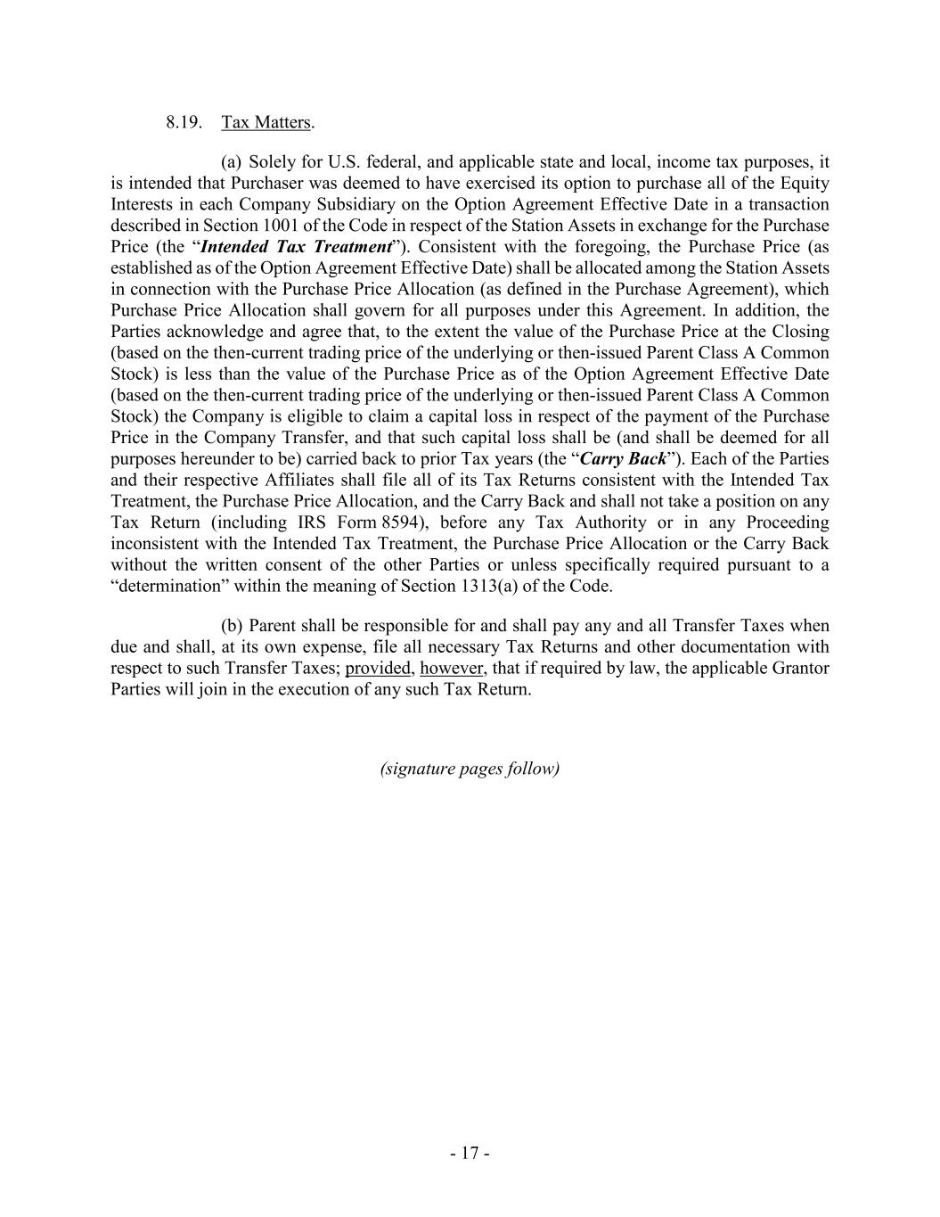 - 17 - 8.19. Tax Matters. (a) Solely for U.S. federal, and applicable state and local, income tax purposes, it is intended that Purchaser was deemed to have exercised its option to purchase all of the Equity Interests in each Company Subsidiary on the Option Agreement Effective Date in a transaction described in Section 1001 of the Code in respect of the Station Assets in exchange for the Purchase Price (the “Intended Tax Treatment”). Consistent with the foregoing, the Purchase Price (as established as of the Option Agreement Effective Date) shall be allocated among the Station Assets in connection with the Purchase Price Allocation (as defined in the Purchase Agreement), which Purchase Price Allocation shall govern for all purposes under this Agreement. In addition, the Parties acknowledge and agree that, to the extent the value of the Purchase Price at the Closing (based on the then-current trading price of the underlying or then-issued Parent Class A Common Stock) is less than the value of the Purchase Price as of the Option Agreement Effective Date (based on the then-current trading price of the underlying or then-issued Parent Class A Common Stock) the Company is eligible to claim a capital loss in respect of the payment of the Purchase Price in the Company Transfer, and that such capital loss shall be (and shall be deemed for all purposes hereunder to be) carried back to prior Tax years (the “Carry Back”). Each of the Parties and their respective Affiliates shall file all of its Tax Returns consistent with the Intended Tax Treatment, the Purchase Price Allocation, and the Carry Back and shall not take a position on any Tax Return (including IRS Form 8594), before any Tax Authority or in any Proceeding inconsistent with the Intended Tax Treatment, the Purchase Price Allocation or the Carry Back without the written consent of the other Parties or unless specifically required pursuant to a “determination” within the meaning of Section 1313(a) of the Code. (b) Parent shall be responsible for and shall pay any and all Transfer Taxes when due and shall, at its own expense, file all necessary Tax Returns and other documentation with respect to such Transfer Taxes; provided, however, that if required by law, the applicable Grantor Parties will join in the execution of any such Tax Return. (signature pages follow)