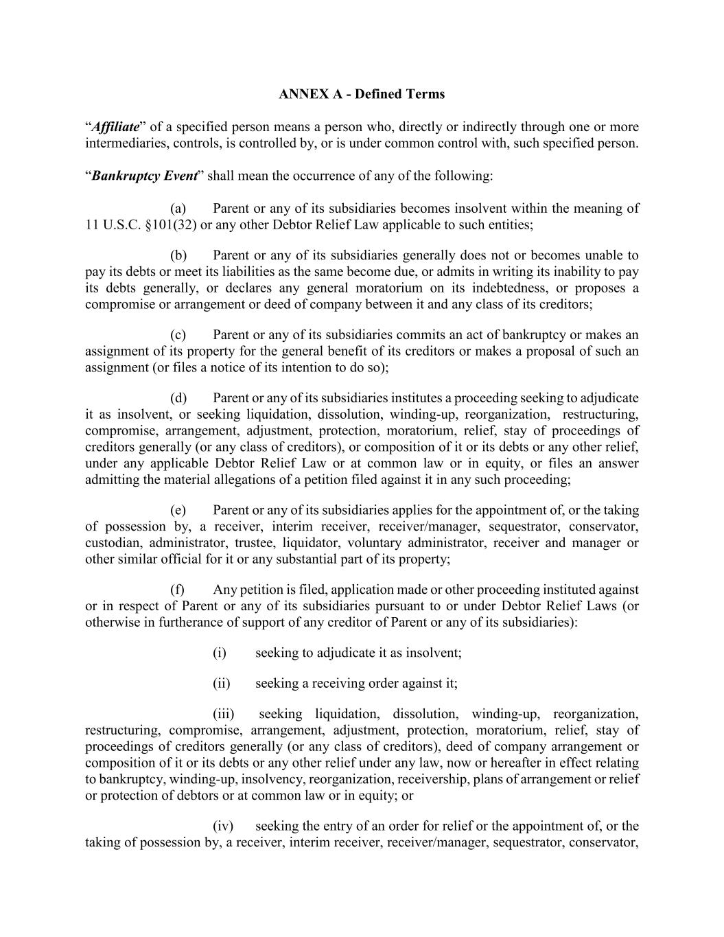 ANNEX A - Defined Terms “Affiliate” of a specified person means a person who, directly or indirectly through one or more intermediaries, controls, is controlled by, or is under common control with, such specified person. “Bankruptcy Event” shall mean the occurrence of any of the following: (a) Parent or any of its subsidiaries becomes insolvent within the meaning of 11 U.S.C. §101(32) or any other Debtor Relief Law applicable to such entities; (b) Parent or any of its subsidiaries generally does not or becomes unable to pay its debts or meet its liabilities as the same become due, or admits in writing its inability to pay its debts generally, or declares any general moratorium on its indebtedness, or proposes a compromise or arrangement or deed of company between it and any class of its creditors; (c) Parent or any of its subsidiaries commits an act of bankruptcy or makes an assignment of its property for the general benefit of its creditors or makes a proposal of such an assignment (or files a notice of its intention to do so); (d) Parent or any of its subsidiaries institutes a proceeding seeking to adjudicate it as insolvent, or seeking liquidation, dissolution, winding-up, reorganization, restructuring, compromise, arrangement, adjustment, protection, moratorium, relief, stay of proceedings of creditors generally (or any class of creditors), or composition of it or its debts or any other relief, under any applicable Debtor Relief Law or at common law or in equity, or files an answer admitting the material allegations of a petition filed against it in any such proceeding; (e) Parent or any of its subsidiaries applies for the appointment of, or the taking of possession by, a receiver, interim receiver, receiver/manager, sequestrator, conservator, custodian, administrator, trustee, liquidator, voluntary administrator, receiver and manager or other similar official for it or any substantial part of its property; (f) Any petition is filed, application made or other proceeding instituted against or in respect of Parent or any of its subsidiaries pursuant to or under Debtor Relief Laws (or otherwise in furtherance of support of any creditor of Parent or any of its subsidiaries): (i) seeking to adjudicate it as insolvent; (ii) seeking a receiving order against it; (iii) seeking liquidation, dissolution, winding-up, reorganization, restructuring, compromise, arrangement, adjustment, protection, moratorium, relief, stay of proceedings of creditors generally (or any class of creditors), deed of company arrangement or composition of it or its debts or any other relief under any law, now or hereafter in effect relating to bankruptcy, winding-up, insolvency, reorganization, receivership, plans of arrangement or relief or protection of debtors or at common law or in equity; or (iv) seeking the entry of an order for relief or the appointment of, or the taking of possession by, a receiver, interim receiver, receiver/manager, sequestrator, conservator,