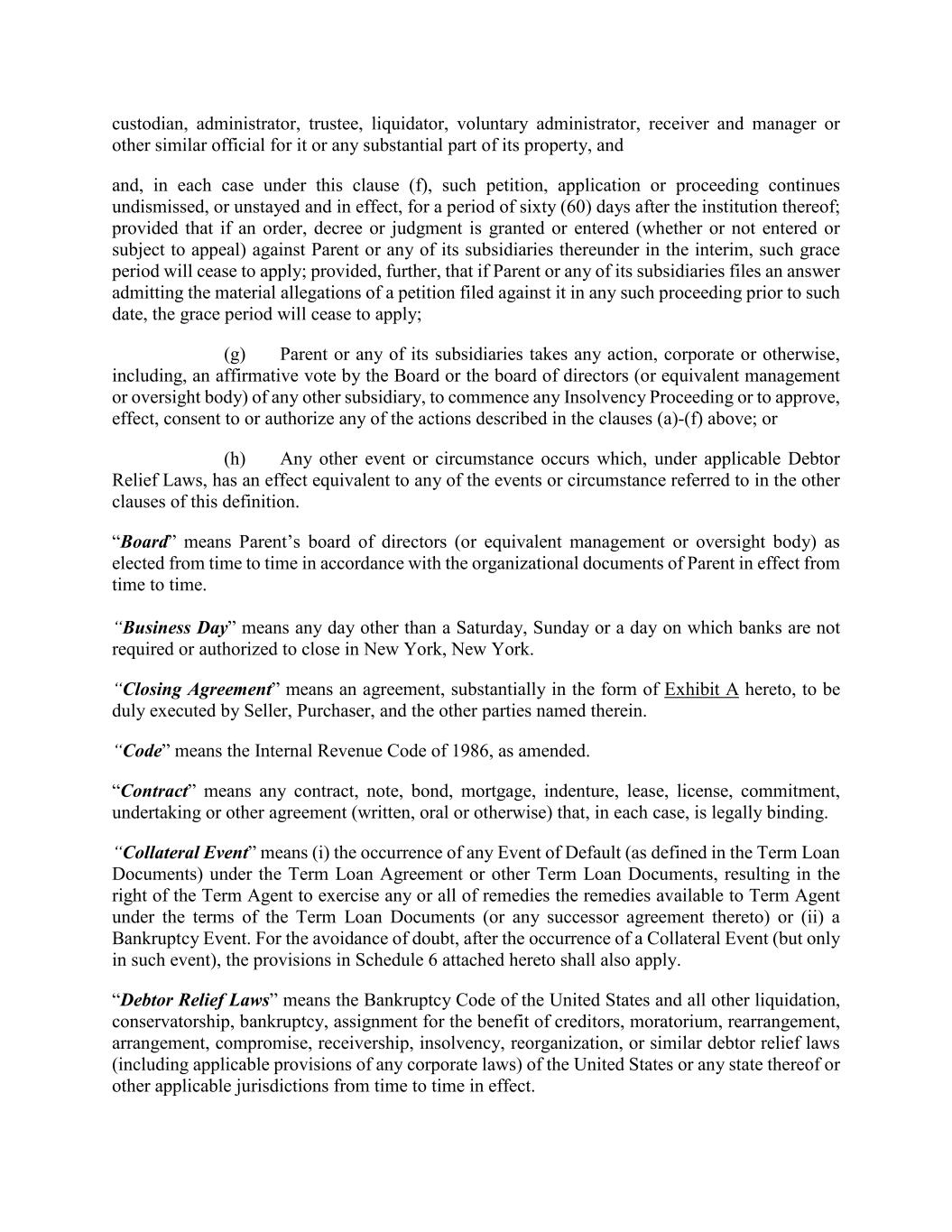 custodian, administrator, trustee, liquidator, voluntary administrator, receiver and manager or other similar official for it or any substantial part of its property, and and, in each case under this clause (f), such petition, application or proceeding continues undismissed, or unstayed and in effect, for a period of sixty (60) days after the institution thereof; provided that if an order, decree or judgment is granted or entered (whether or not entered or subject to appeal) against Parent or any of its subsidiaries thereunder in the interim, such grace period will cease to apply; provided, further, that if Parent or any of its subsidiaries files an answer admitting the material allegations of a petition filed against it in any such proceeding prior to such date, the grace period will cease to apply; (g) Parent or any of its subsidiaries takes any action, corporate or otherwise, including, an affirmative vote by the Board or the board of directors (or equivalent management or oversight body) of any other subsidiary, to commence any Insolvency Proceeding or to approve, effect, consent to or authorize any of the actions described in the clauses (a)-(f) above; or (h) Any other event or circumstance occurs which, under applicable Debtor Relief Laws, has an effect equivalent to any of the events or circumstance referred to in the other clauses of this definition. “Board” means Parent’s board of directors (or equivalent management or oversight body) as elected from time to time in accordance with the organizational documents of Parent in effect from time to time. “Business Day” means any day other than a Saturday, Sunday or a day on which banks are not required or authorized to close in New York, New York. “Closing Agreement” means an agreement, substantially in the form of Exhibit A hereto, to be duly executed by Seller, Purchaser, and the other parties named therein. “Code” means the Internal Revenue Code of 1986, as amended. “Contract” means any contract, note, bond, mortgage, indenture, lease, license, commitment, undertaking or other agreement (written, oral or otherwise) that, in each case, is legally binding. “Collateral Event” means (i) the occurrence of any Event of Default (as defined in the Term Loan Documents) under the Term Loan Agreement or other Term Loan Documents, resulting in the right of the Term Agent to exercise any or all of remedies the remedies available to Term Agent under the terms of the Term Loan Documents (or any successor agreement thereto) or (ii) a Bankruptcy Event. For the avoidance of doubt, after the occurrence of a Collateral Event (but only in such event), the provisions in Schedule 6 attached hereto shall also apply. “Debtor Relief Laws” means the Bankruptcy Code of the United States and all other liquidation, conservatorship, bankruptcy, assignment for the benefit of creditors, moratorium, rearrangement, arrangement, compromise, receivership, insolvency, reorganization, or similar debtor relief laws (including applicable provisions of any corporate laws) of the United States or any state thereof or other applicable jurisdictions from time to time in effect.