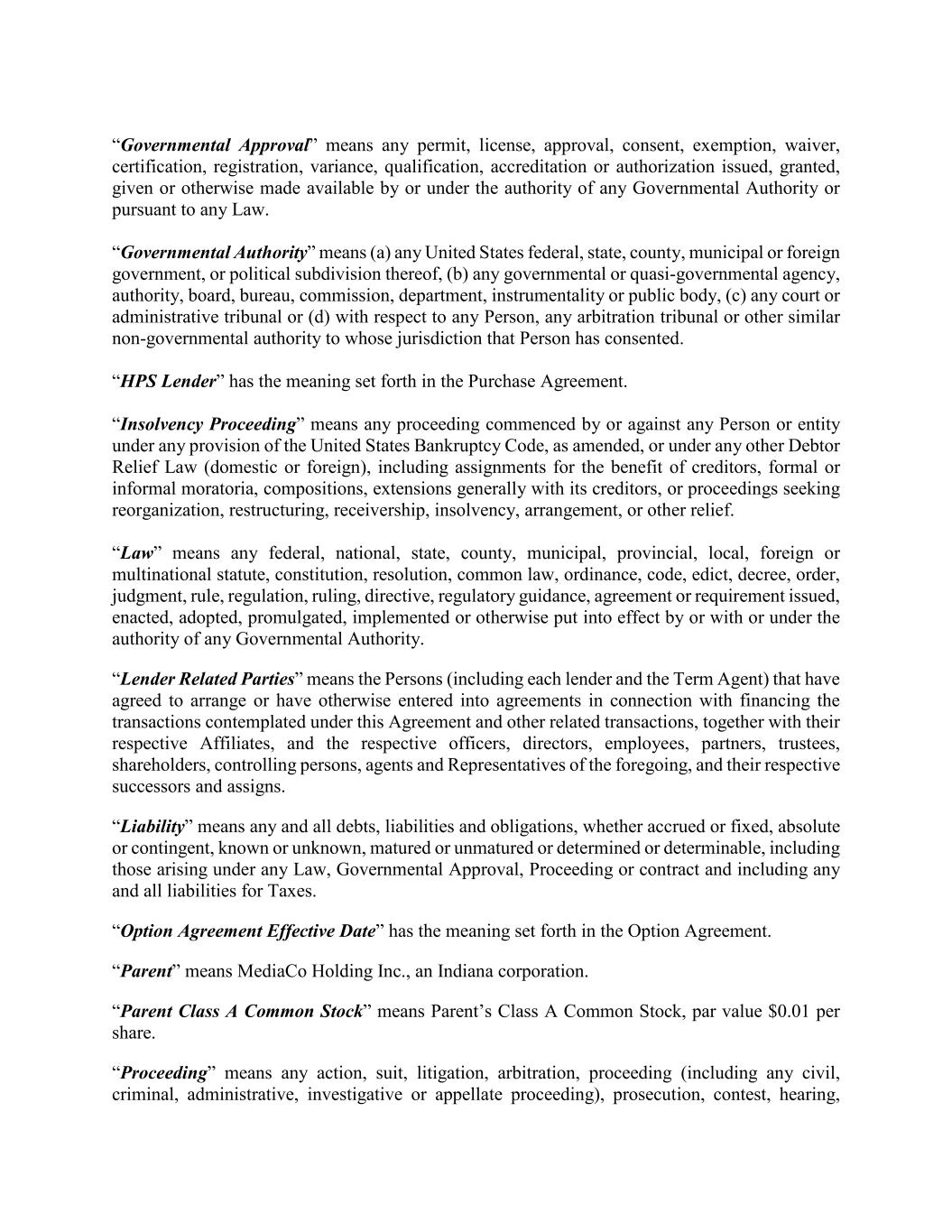 “Governmental Approval” means any permit, license, approval, consent, exemption, waiver, certification, registration, variance, qualification, accreditation or authorization issued, granted, given or otherwise made available by or under the authority of any Governmental Authority or pursuant to any Law. “Governmental Authority” means (a) any United States federal, state, county, municipal or foreign government, or political subdivision thereof, (b) any governmental or quasi-governmental agency, authority, board, bureau, commission, department, instrumentality or public body, (c) any court or administrative tribunal or (d) with respect to any Person, any arbitration tribunal or other similar non-governmental authority to whose jurisdiction that Person has consented. “HPS Lender” has the meaning set forth in the Purchase Agreement. “Insolvency Proceeding” means any proceeding commenced by or against any Person or entity under any provision of the United States Bankruptcy Code, as amended, or under any other Debtor Relief Law (domestic or foreign), including assignments for the benefit of creditors, formal or informal moratoria, compositions, extensions generally with its creditors, or proceedings seeking reorganization, restructuring, receivership, insolvency, arrangement, or other relief. “Law” means any federal, national, state, county, municipal, provincial, local, foreign or multinational statute, constitution, resolution, common law, ordinance, code, edict, decree, order, judgment, rule, regulation, ruling, directive, regulatory guidance, agreement or requirement issued, enacted, adopted, promulgated, implemented or otherwise put into effect by or with or under the authority of any Governmental Authority. “Lender Related Parties” means the Persons (including each lender and the Term Agent) that have agreed to arrange or have otherwise entered into agreements in connection with financing the transactions contemplated under this Agreement and other related transactions, together with their respective Affiliates, and the respective officers, directors, employees, partners, trustees, shareholders, controlling persons, agents and Representatives of the foregoing, and their respective successors and assigns. “Liability” means any and all debts, liabilities and obligations, whether accrued or fixed, absolute or contingent, known or unknown, matured or unmatured or determined or determinable, including those arising under any Law, Governmental Approval, Proceeding or contract and including any and all liabilities for Taxes. “Option Agreement Effective Date” has the meaning set forth in the Option Agreement. “Parent” means MediaCo Holding Inc., an Indiana corporation. “Parent Class A Common Stock” means Parent’s Class A Common Stock, par value $0.01 per share. “Proceeding” means any action, suit, litigation, arbitration, proceeding (including any civil, criminal, administrative, investigative or appellate proceeding), prosecution, contest, hearing,