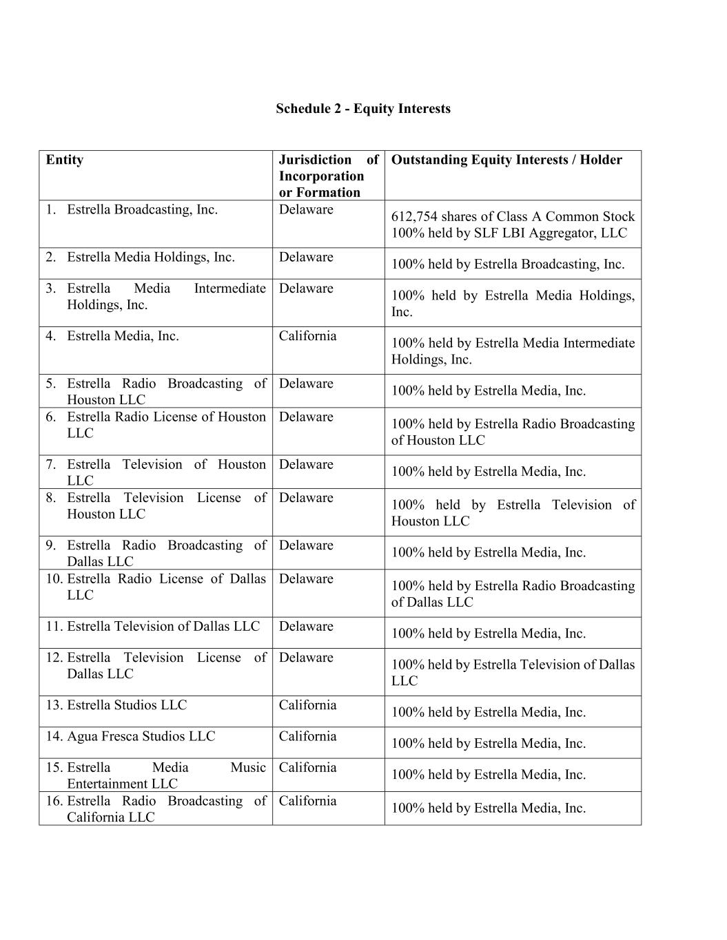 Schedule 2 - Equity Interests Entity Jurisdiction of Incorporation or Formation Outstanding Equity Interests / Holder 1. Estrella Broadcasting, Inc. Delaware 612,754 shares of Class A Common Stock 100% held by SLF LBI Aggregator, LLC 2. Estrella Media Holdings, Inc. Delaware 100% held by Estrella Broadcasting, Inc. 3. Estrella Media Intermediate Holdings, Inc. Delaware 100% held by Estrella Media Holdings, Inc. 4. Estrella Media, Inc. California 100% held by Estrella Media Intermediate Holdings, Inc. 5. Estrella Radio Broadcasting of Houston LLC Delaware 100% held by Estrella Media, Inc. 6. Estrella Radio License of Houston LLC Delaware 100% held by Estrella Radio Broadcasting of Houston LLC 7. Estrella Television of Houston LLC Delaware 100% held by Estrella Media, Inc. 8. Estrella Television License of Houston LLC Delaware 100% held by Estrella Television of Houston LLC 9. Estrella Radio Broadcasting of Dallas LLC Delaware 100% held by Estrella Media, Inc. 10. Estrella Radio License of Dallas LLC Delaware 100% held by Estrella Radio Broadcasting of Dallas LLC 11. Estrella Television of Dallas LLC Delaware 100% held by Estrella Media, Inc. 12. Estrella Television License of Dallas LLC Delaware 100% held by Estrella Television of Dallas LLC 13. Estrella Studios LLC California 100% held by Estrella Media, Inc. 14. Agua Fresca Studios LLC California 100% held by Estrella Media, Inc. 15. Estrella Media Music Entertainment LLC California 100% held by Estrella Media, Inc. 16. Estrella Radio Broadcasting of California LLC California 100% held by Estrella Media, Inc.