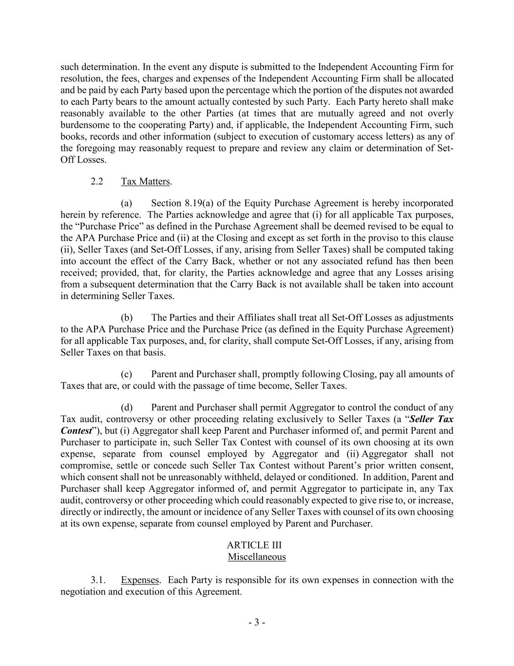- 3 - such determination. In the event any dispute is submitted to the Independent Accounting Firm for resolution, the fees, charges and expenses of the Independent Accounting Firm shall be allocated and be paid by each Party based upon the percentage which the portion of the disputes not awarded to each Party bears to the amount actually contested by such Party. Each Party hereto shall make reasonably available to the other Parties (at times that are mutually agreed and not overly burdensome to the cooperating Party) and, if applicable, the Independent Accounting Firm, such books, records and other information (subject to execution of customary access letters) as any of the foregoing may reasonably request to prepare and review any claim or determination of Set- Off Losses. 2.2 Tax Matters. (a) Section 8.19(a) of the Equity Purchase Agreement is hereby incorporated herein by reference. The Parties acknowledge and agree that (i) for all applicable Tax purposes, the “Purchase Price” as defined in the Purchase Agreement shall be deemed revised to be equal to the APA Purchase Price and (ii) at the Closing and except as set forth in the proviso to this clause (ii), Seller Taxes (and Set-Off Losses, if any, arising from Seller Taxes) shall be computed taking into account the effect of the Carry Back, whether or not any associated refund has then been received; provided, that, for clarity, the Parties acknowledge and agree that any Losses arising from a subsequent determination that the Carry Back is not available shall be taken into account in determining Seller Taxes. (b) The Parties and their Affiliates shall treat all Set-Off Losses as adjustments to the APA Purchase Price and the Purchase Price (as defined in the Equity Purchase Agreement) for all applicable Tax purposes, and, for clarity, shall compute Set-Off Losses, if any, arising from Seller Taxes on that basis. (c) Parent and Purchaser shall, promptly following Closing, pay all amounts of Taxes that are, or could with the passage of time become, Seller Taxes. (d) Parent and Purchaser shall permit Aggregator to control the conduct of any Tax audit, controversy or other proceeding relating exclusively to Seller Taxes (a “Seller Tax Contest”), but (i) Aggregator shall keep Parent and Purchaser informed of, and permit Parent and Purchaser to participate in, such Seller Tax Contest with counsel of its own choosing at its own expense, separate from counsel employed by Aggregator and (ii) Aggregator shall not compromise, settle or concede such Seller Tax Contest without Parent’s prior written consent, which consent shall not be unreasonably withheld, delayed or conditioned. In addition, Parent and Purchaser shall keep Aggregator informed of, and permit Aggregator to participate in, any Tax audit, controversy or other proceeding which could reasonably expected to give rise to, or increase, directly or indirectly, the amount or incidence of any Seller Taxes with counsel of its own choosing at its own expense, separate from counsel employed by Parent and Purchaser. ARTICLE III Miscellaneous 3.1. Expenses. Each Party is responsible for its own expenses in connection with the negotiation and execution of this Agreement.