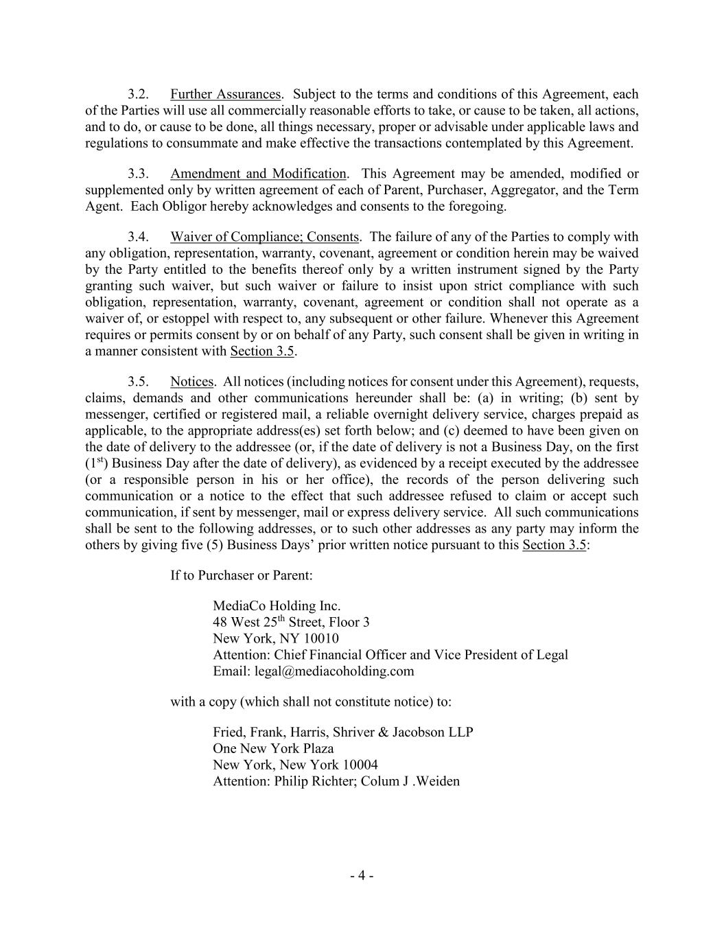 - 4 - 3.2. Further Assurances. Subject to the terms and conditions of this Agreement, each of the Parties will use all commercially reasonable efforts to take, or cause to be taken, all actions, and to do, or cause to be done, all things necessary, proper or advisable under applicable laws and regulations to consummate and make effective the transactions contemplated by this Agreement. 3.3. Amendment and Modification. This Agreement may be amended, modified or supplemented only by written agreement of each of Parent, Purchaser, Aggregator, and the Term Agent. Each Obligor hereby acknowledges and consents to the foregoing. 3.4. Waiver of Compliance; Consents. The failure of any of the Parties to comply with any obligation, representation, warranty, covenant, agreement or condition herein may be waived by the Party entitled to the benefits thereof only by a written instrument signed by the Party granting such waiver, but such waiver or failure to insist upon strict compliance with such obligation, representation, warranty, covenant, agreement or condition shall not operate as a waiver of, or estoppel with respect to, any subsequent or other failure. Whenever this Agreement requires or permits consent by or on behalf of any Party, such consent shall be given in writing in a manner consistent with Section 3.5. 3.5. Notices. All notices (including notices for consent under this Agreement), requests, claims, demands and other communications hereunder shall be: (a) in writing; (b) sent by messenger, certified or registered mail, a reliable overnight delivery service, charges prepaid as applicable, to the appropriate address(es) set forth below; and (c) deemed to have been given on the date of delivery to the addressee (or, if the date of delivery is not a Business Day, on the first (1st) Business Day after the date of delivery), as evidenced by a receipt executed by the addressee (or a responsible person in his or her office), the records of the person delivering such communication or a notice to the effect that such addressee refused to claim or accept such communication, if sent by messenger, mail or express delivery service. All such communications shall be sent to the following addresses, or to such other addresses as any party may inform the others by giving five (5) Business Days’ prior written notice pursuant to this Section 3.5: If to Purchaser or Parent: MediaCo Holding Inc. 48 West 25th Street, Floor 3 New York, NY 10010 Attention: Chief Financial Officer and Vice President of Legal Email: legal@mediacoholding.com with a copy (which shall not constitute notice) to: Fried, Frank, Harris, Shriver & Jacobson LLP One New York Plaza New York, New York 10004 Attention: Philip Richter; Colum J .Weiden