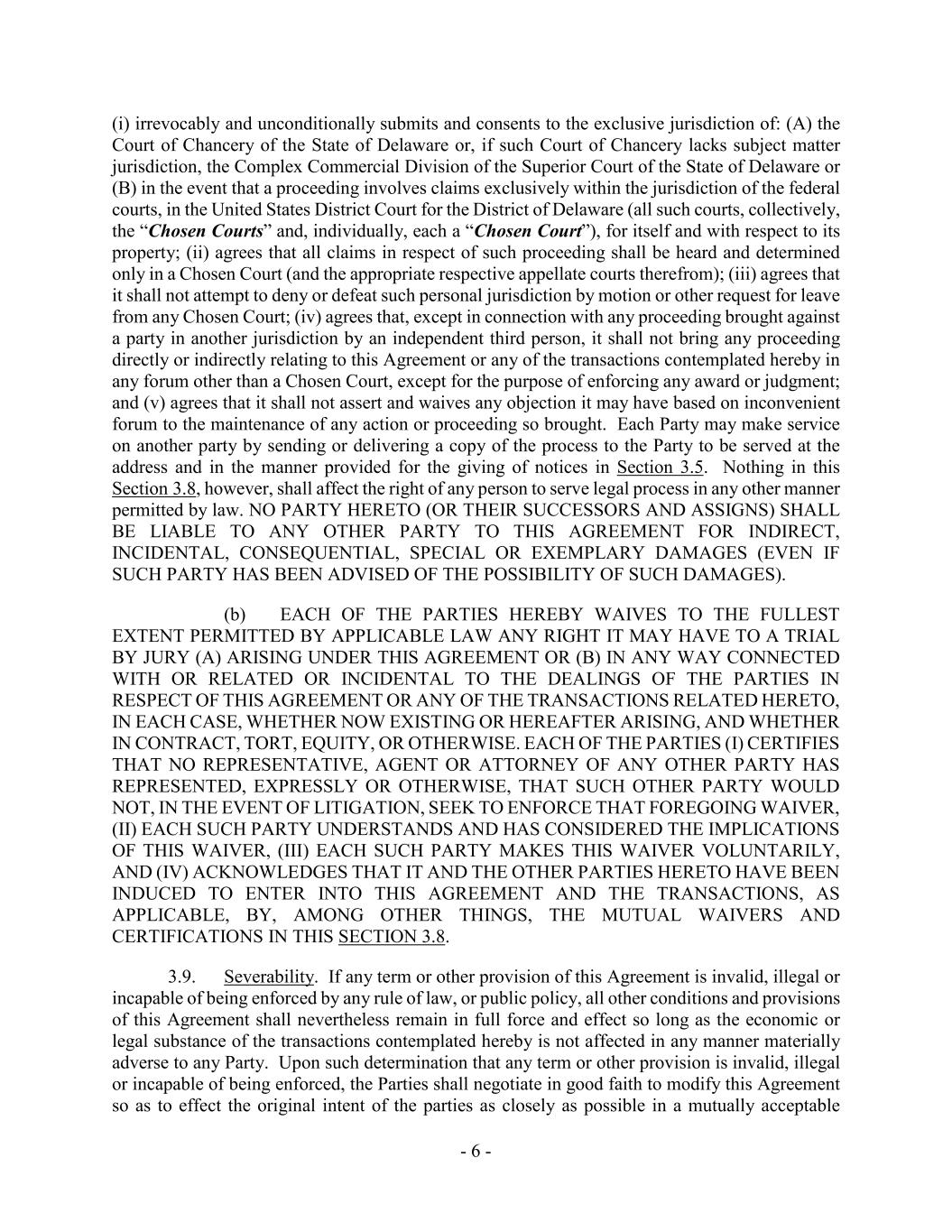 - 6 - (i) irrevocably and unconditionally submits and consents to the exclusive jurisdiction of: (A) the Court of Chancery of the State of Delaware or, if such Court of Chancery lacks subject matter jurisdiction, the Complex Commercial Division of the Superior Court of the State of Delaware or (B) in the event that a proceeding involves claims exclusively within the jurisdiction of the federal courts, in the United States District Court for the District of Delaware (all such courts, collectively, the “Chosen Courts” and, individually, each a “Chosen Court”), for itself and with respect to its property; (ii) agrees that all claims in respect of such proceeding shall be heard and determined only in a Chosen Court (and the appropriate respective appellate courts therefrom); (iii) agrees that it shall not attempt to deny or defeat such personal jurisdiction by motion or other request for leave from any Chosen Court; (iv) agrees that, except in connection with any proceeding brought against a party in another jurisdiction by an independent third person, it shall not bring any proceeding directly or indirectly relating to this Agreement or any of the transactions contemplated hereby in any forum other than a Chosen Court, except for the purpose of enforcing any award or judgment; and (v) agrees that it shall not assert and waives any objection it may have based on inconvenient forum to the maintenance of any action or proceeding so brought. Each Party may make service on another party by sending or delivering a copy of the process to the Party to be served at the address and in the manner provided for the giving of notices in Section 3.5. Nothing in this Section 3.8, however, shall affect the right of any person to serve legal process in any other manner permitted by law. NO PARTY HERETO (OR THEIR SUCCESSORS AND ASSIGNS) SHALL BE LIABLE TO ANY OTHER PARTY TO THIS AGREEMENT FOR INDIRECT, INCIDENTAL, CONSEQUENTIAL, SPECIAL OR EXEMPLARY DAMAGES (EVEN IF SUCH PARTY HAS BEEN ADVISED OF THE POSSIBILITY OF SUCH DAMAGES). (b) EACH OF THE PARTIES HEREBY WAIVES TO THE FULLEST EXTENT PERMITTED BY APPLICABLE LAW ANY RIGHT IT MAY HAVE TO A TRIAL BY JURY (A) ARISING UNDER THIS AGREEMENT OR (B) IN ANY WAY CONNECTED WITH OR RELATED OR INCIDENTAL TO THE DEALINGS OF THE PARTIES IN RESPECT OF THIS AGREEMENT OR ANY OF THE TRANSACTIONS RELATED HERETO, IN EACH CASE, WHETHER NOW EXISTING OR HEREAFTER ARISING, AND WHETHER IN CONTRACT, TORT, EQUITY, OR OTHERWISE. EACH OF THE PARTIES (I) CERTIFIES THAT NO REPRESENTATIVE, AGENT OR ATTORNEY OF ANY OTHER PARTY HAS REPRESENTED, EXPRESSLY OR OTHERWISE, THAT SUCH OTHER PARTY WOULD NOT, IN THE EVENT OF LITIGATION, SEEK TO ENFORCE THAT FOREGOING WAIVER, (II) EACH SUCH PARTY UNDERSTANDS AND HAS CONSIDERED THE IMPLICATIONS OF THIS WAIVER, (III) EACH SUCH PARTY MAKES THIS WAIVER VOLUNTARILY, AND (IV) ACKNOWLEDGES THAT IT AND THE OTHER PARTIES HERETO HAVE BEEN INDUCED TO ENTER INTO THIS AGREEMENT AND THE TRANSACTIONS, AS APPLICABLE, BY, AMONG OTHER THINGS, THE MUTUAL WAIVERS AND CERTIFICATIONS IN THIS SECTION 3.8. 3.9. Severability. If any term or other provision of this Agreement is invalid, illegal or incapable of being enforced by any rule of law, or public policy, all other conditions and provisions of this Agreement shall nevertheless remain in full force and effect so long as the economic or legal substance of the transactions contemplated hereby is not affected in any manner materially adverse to any Party. Upon such determination that any term or other provision is invalid, illegal or incapable of being enforced, the Parties shall negotiate in good faith to modify this Agreement so as to effect the original intent of the parties as closely as possible in a mutually acceptable