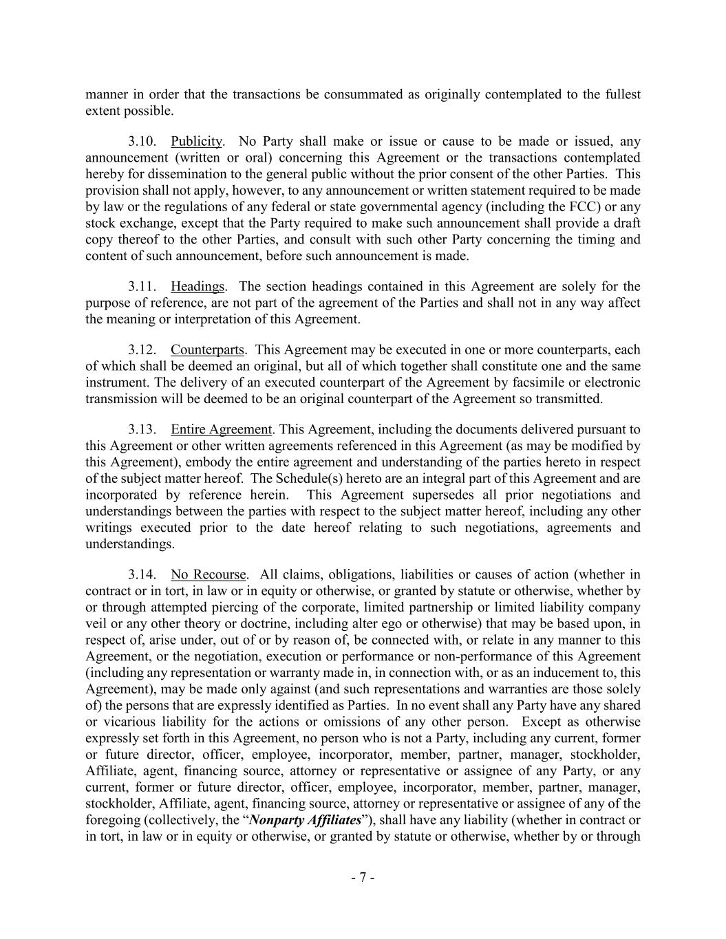 - 7 - manner in order that the transactions be consummated as originally contemplated to the fullest extent possible. 3.10. Publicity. No Party shall make or issue or cause to be made or issued, any announcement (written or oral) concerning this Agreement or the transactions contemplated hereby for dissemination to the general public without the prior consent of the other Parties. This provision shall not apply, however, to any announcement or written statement required to be made by law or the regulations of any federal or state governmental agency (including the FCC) or any stock exchange, except that the Party required to make such announcement shall provide a draft copy thereof to the other Parties, and consult with such other Party concerning the timing and content of such announcement, before such announcement is made. 3.11. Headings. The section headings contained in this Agreement are solely for the purpose of reference, are not part of the agreement of the Parties and shall not in any way affect the meaning or interpretation of this Agreement. 3.12. Counterparts. This Agreement may be executed in one or more counterparts, each of which shall be deemed an original, but all of which together shall constitute one and the same instrument. The delivery of an executed counterpart of the Agreement by facsimile or electronic transmission will be deemed to be an original counterpart of the Agreement so transmitted. 3.13. Entire Agreement. This Agreement, including the documents delivered pursuant to this Agreement or other written agreements referenced in this Agreement (as may be modified by this Agreement), embody the entire agreement and understanding of the parties hereto in respect of the subject matter hereof. The Schedule(s) hereto are an integral part of this Agreement and are incorporated by reference herein. This Agreement supersedes all prior negotiations and understandings between the parties with respect to the subject matter hereof, including any other writings executed prior to the date hereof relating to such negotiations, agreements and understandings. 3.14. No Recourse. All claims, obligations, liabilities or causes of action (whether in contract or in tort, in law or in equity or otherwise, or granted by statute or otherwise, whether by or through attempted piercing of the corporate, limited partnership or limited liability company veil or any other theory or doctrine, including alter ego or otherwise) that may be based upon, in respect of, arise under, out of or by reason of, be connected with, or relate in any manner to this Agreement, or the negotiation, execution or performance or non-performance of this Agreement (including any representation or warranty made in, in connection with, or as an inducement to, this Agreement), may be made only against (and such representations and warranties are those solely of) the persons that are expressly identified as Parties. In no event shall any Party have any shared or vicarious liability for the actions or omissions of any other person. Except as otherwise expressly set forth in this Agreement, no person who is not a Party, including any current, former or future director, officer, employee, incorporator, member, partner, manager, stockholder, Affiliate, agent, financing source, attorney or representative or assignee of any Party, or any current, former or future director, officer, employee, incorporator, member, partner, manager, stockholder, Affiliate, agent, financing source, attorney or representative or assignee of any of the foregoing (collectively, the “Nonparty Affiliates”), shall have any liability (whether in contract or in tort, in law or in equity or otherwise, or granted by statute or otherwise, whether by or through