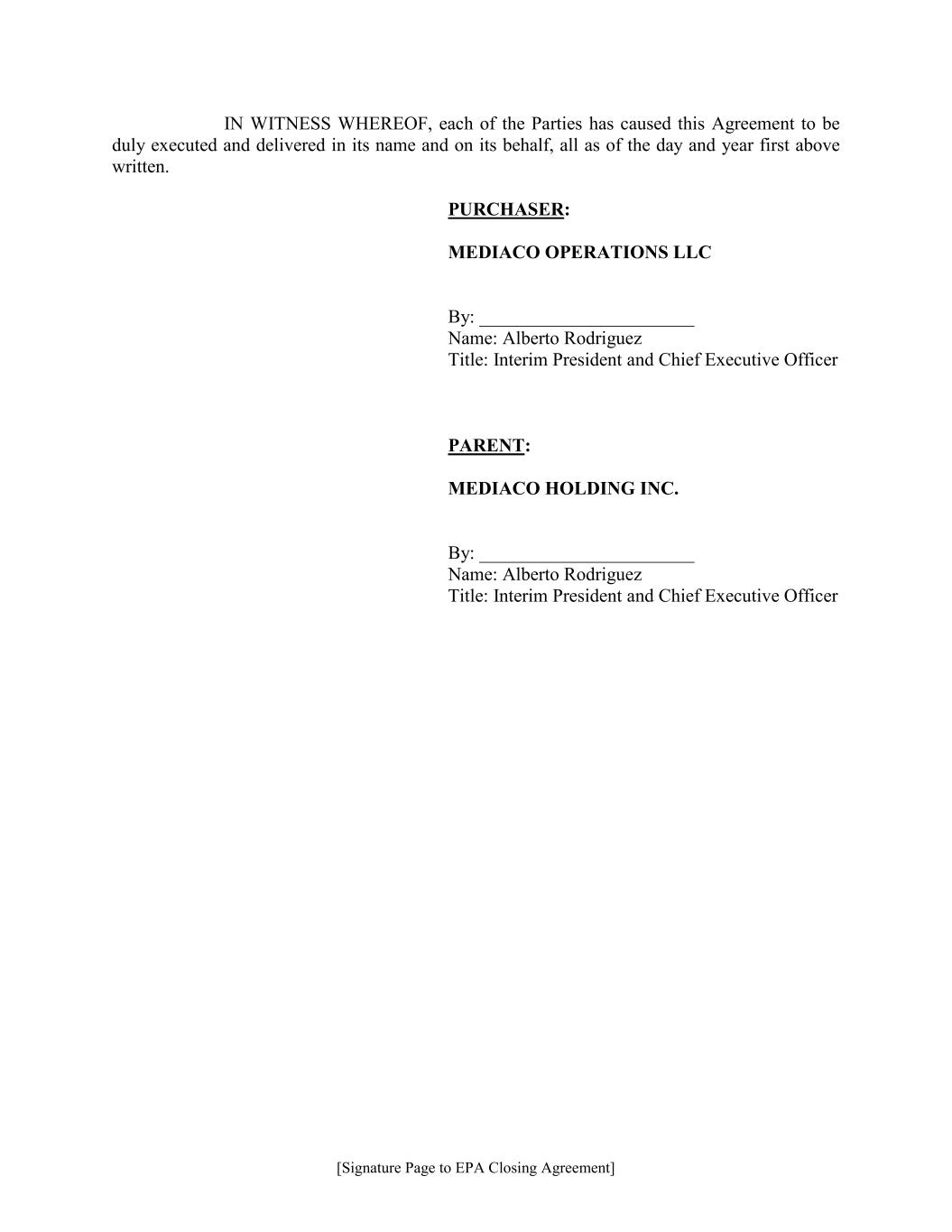 [Signature Page to EPA Closing Agreement] IN WITNESS WHEREOF, each of the Parties has caused this Agreement to be duly executed and delivered in its name and on its behalf, all as of the day and year first above written. PURCHASER: MEDIACO OPERATIONS LLC By: _______________________ Name: Alberto Rodriguez Title: Interim President and Chief Executive Officer PARENT: MEDIACO HOLDING INC. By: _______________________ Name: Alberto Rodriguez Title: Interim President and Chief Executive Officer