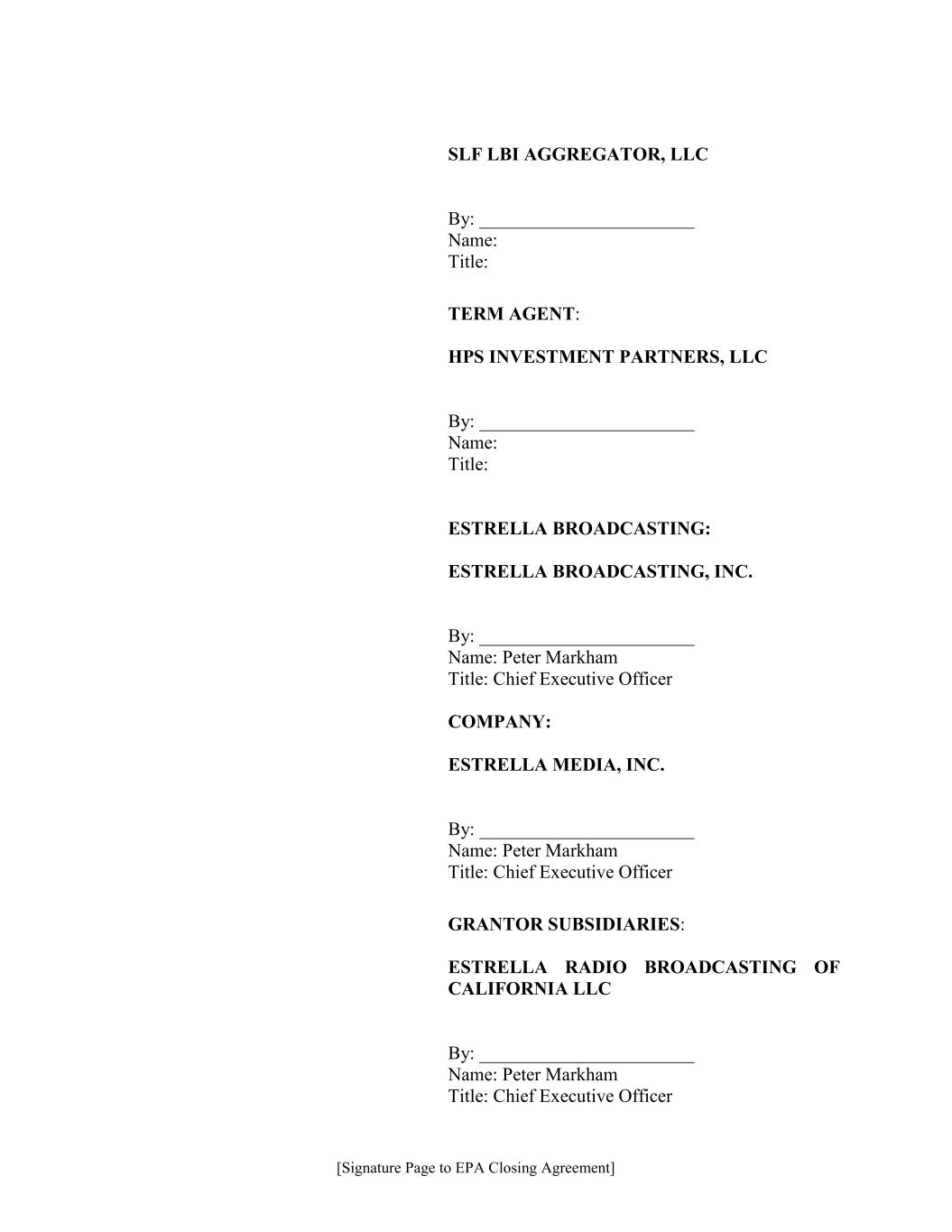 [Signature Page to EPA Closing Agreement] SLF LBI AGGREGATOR, LLC By: _______________________ Name: Title: TERM AGENT: HPS INVESTMENT PARTNERS, LLC By: _______________________ Name: Title: ESTRELLA BROADCASTING: ESTRELLA BROADCASTING, INC. By: _______________________ Name: Peter Markham Title: Chief Executive Officer COMPANY: ESTRELLA MEDIA, INC. By: _______________________ Name: Peter Markham Title: Chief Executive Officer GRANTOR SUBSIDIARIES: ESTRELLA RADIO BROADCASTING OF CALIFORNIA LLC By: _______________________ Name: Peter Markham Title: Chief Executive Officer