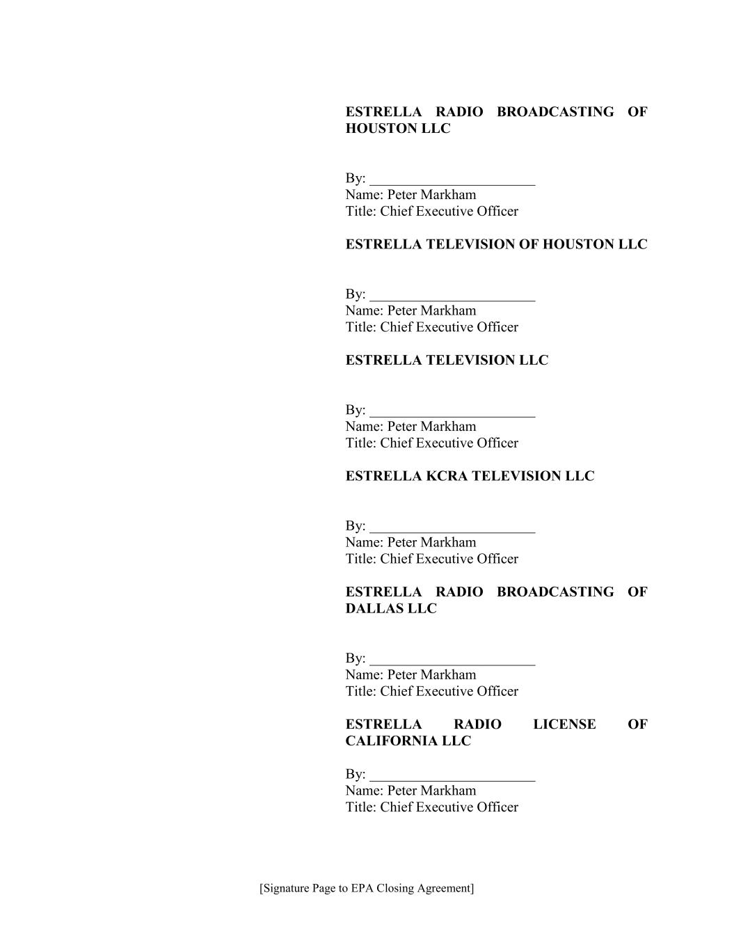 [Signature Page to EPA Closing Agreement] ESTRELLA RADIO BROADCASTING OF HOUSTON LLC By: _______________________ Name: Peter Markham Title: Chief Executive Officer ESTRELLA TELEVISION OF HOUSTON LLC By: _______________________ Name: Peter Markham Title: Chief Executive Officer ESTRELLA TELEVISION LLC By: _______________________ Name: Peter Markham Title: Chief Executive Officer ESTRELLA KCRA TELEVISION LLC By: _______________________ Name: Peter Markham Title: Chief Executive Officer ESTRELLA RADIO BROADCASTING OF DALLAS LLC By: _______________________ Name: Peter Markham Title: Chief Executive Officer ESTRELLA RADIO LICENSE OF CALIFORNIA LLC By: _______________________ Name: Peter Markham Title: Chief Executive Officer