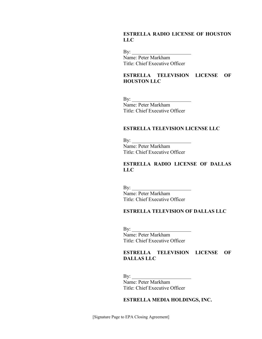 [Signature Page to EPA Closing Agreement] ESTRELLA RADIO LICENSE OF HOUSTON LLC By: _______________________ Name: Peter Markham Title: Chief Executive Officer ESTRELLA TELEVISION LICENSE OF HOUSTON LLC By: _______________________ Name: Peter Markham Title: Chief Executive Officer ESTRELLA TELEVISION LICENSE LLC By: _______________________ Name: Peter Markham Title: Chief Executive Officer ESTRELLA RADIO LICENSE OF DALLAS LLC By: _______________________ Name: Peter Markham Title: Chief Executive Officer ESTRELLA TELEVISION OF DALLAS LLC By: _______________________ Name: Peter Markham Title: Chief Executive Officer ESTRELLA TELEVISION LICENSE OF DALLAS LLC By: _______________________ Name: Peter Markham Title: Chief Executive Officer ESTRELLA MEDIA HOLDINGS, INC.