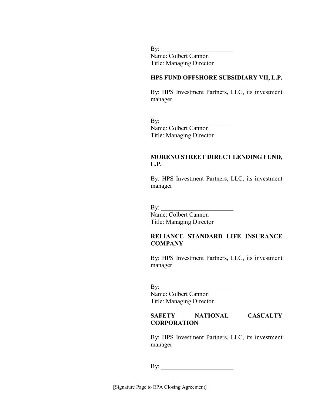 [Signature Page to EPA Closing Agreement] By: _______________________ Name: Colbert Cannon Title: Managing Director HPS FUND OFFSHORE SUBSIDIARY VII, L.P. By: HPS Investment Partners, LLC, its investment manager By: _______________________ Name: Colbert Cannon Title: Managing Director MORENO STREET DIRECT LENDING FUND, L.P. By: HPS Investment Partners, LLC, its investment manager By: _______________________ Name: Colbert Cannon Title: Managing Director RELIANCE STANDARD LIFE INSURANCE COMPANY By: HPS Investment Partners, LLC, its investment manager By: _______________________ Name: Colbert Cannon Title: Managing Director SAFETY NATIONAL CASUALTY CORPORATION By: HPS Investment Partners, LLC, its investment manager By: _______________________