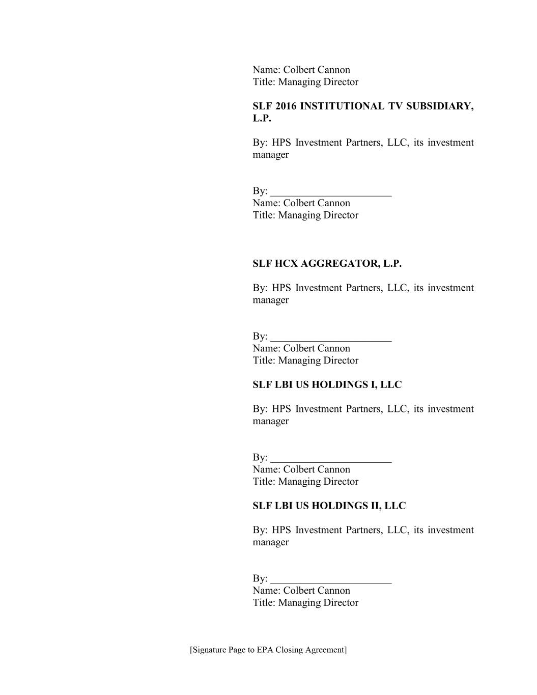 [Signature Page to EPA Closing Agreement] Name: Colbert Cannon Title: Managing Director SLF 2016 INSTITUTIONAL TV SUBSIDIARY, L.P. By: HPS Investment Partners, LLC, its investment manager By: _______________________ Name: Colbert Cannon Title: Managing Director SLF HCX AGGREGATOR, L.P. By: HPS Investment Partners, LLC, its investment manager By: _______________________ Name: Colbert Cannon Title: Managing Director SLF LBI US HOLDINGS I, LLC By: HPS Investment Partners, LLC, its investment manager By: _______________________ Name: Colbert Cannon Title: Managing Director SLF LBI US HOLDINGS II, LLC By: HPS Investment Partners, LLC, its investment manager By: _______________________ Name: Colbert Cannon Title: Managing Director