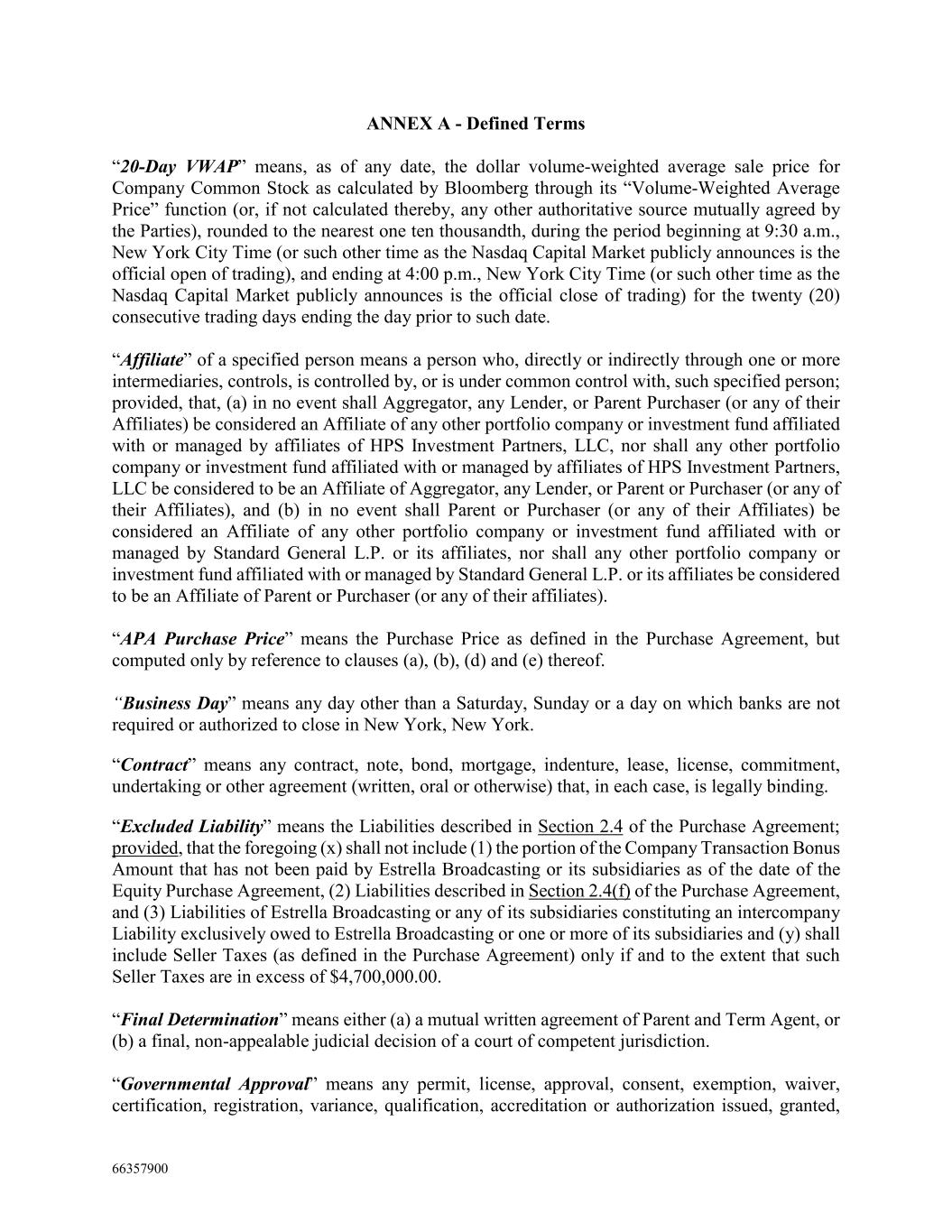 66357900 ANNEX A - Defined Terms “20-Day VWAP” means, as of any date, the dollar volume-weighted average sale price for Company Common Stock as calculated by Bloomberg through its “Volume-Weighted Average Price” function (or, if not calculated thereby, any other authoritative source mutually agreed by the Parties), rounded to the nearest one ten thousandth, during the period beginning at 9:30 a.m., New York City Time (or such other time as the Nasdaq Capital Market publicly announces is the official open of trading), and ending at 4:00 p.m., New York City Time (or such other time as the Nasdaq Capital Market publicly announces is the official close of trading) for the twenty (20) consecutive trading days ending the day prior to such date. “Affiliate” of a specified person means a person who, directly or indirectly through one or more intermediaries, controls, is controlled by, or is under common control with, such specified person; provided, that, (a) in no event shall Aggregator, any Lender, or Parent Purchaser (or any of their Affiliates) be considered an Affiliate of any other portfolio company or investment fund affiliated with or managed by affiliates of HPS Investment Partners, LLC, nor shall any other portfolio company or investment fund affiliated with or managed by affiliates of HPS Investment Partners, LLC be considered to be an Affiliate of Aggregator, any Lender, or Parent or Purchaser (or any of their Affiliates), and (b) in no event shall Parent or Purchaser (or any of their Affiliates) be considered an Affiliate of any other portfolio company or investment fund affiliated with or managed by Standard General L.P. or its affiliates, nor shall any other portfolio company or investment fund affiliated with or managed by Standard General L.P. or its affiliates be considered to be an Affiliate of Parent or Purchaser (or any of their affiliates). “APA Purchase Price” means the Purchase Price as defined in the Purchase Agreement, but computed only by reference to clauses (a), (b), (d) and (e) thereof. “Business Day” means any day other than a Saturday, Sunday or a day on which banks are not required or authorized to close in New York, New York. “Contract” means any contract, note, bond, mortgage, indenture, lease, license, commitment, undertaking or other agreement (written, oral or otherwise) that, in each case, is legally binding. “Excluded Liability” means the Liabilities described in Section 2.4 of the Purchase Agreement; provided, that the foregoing (x) shall not include (1) the portion of the Company Transaction Bonus Amount that has not been paid by Estrella Broadcasting or its subsidiaries as of the date of the Equity Purchase Agreement, (2) Liabilities described in Section 2.4(f) of the Purchase Agreement, and (3) Liabilities of Estrella Broadcasting or any of its subsidiaries constituting an intercompany Liability exclusively owed to Estrella Broadcasting or one or more of its subsidiaries and (y) shall include Seller Taxes (as defined in the Purchase Agreement) only if and to the extent that such Seller Taxes are in excess of $4,700,000.00. “Final Determination” means either (a) a mutual written agreement of Parent and Term Agent, or (b) a final, non-appealable judicial decision of a court of competent jurisdiction. “Governmental Approval” means any permit, license, approval, consent, exemption, waiver, certification, registration, variance, qualification, accreditation or authorization issued, granted,
