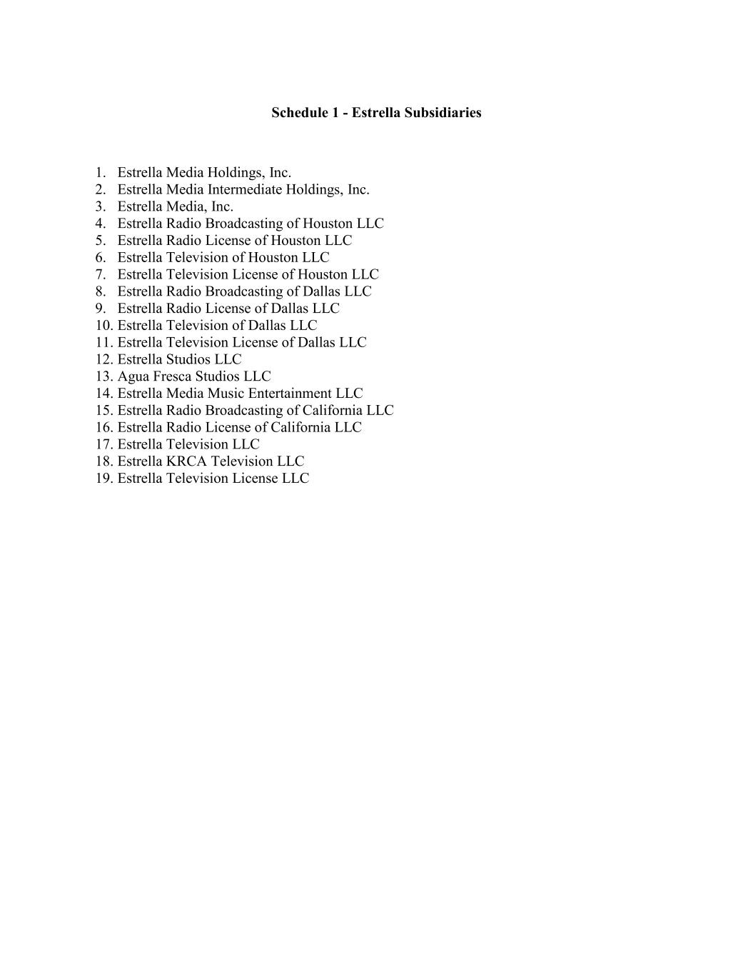 Schedule 1 - Estrella Subsidiaries 1. Estrella Media Holdings, Inc. 2. Estrella Media Intermediate Holdings, Inc. 3. Estrella Media, Inc. 4. Estrella Radio Broadcasting of Houston LLC 5. Estrella Radio License of Houston LLC 6. Estrella Television of Houston LLC 7. Estrella Television License of Houston LLC 8. Estrella Radio Broadcasting of Dallas LLC 9. Estrella Radio License of Dallas LLC 10. Estrella Television of Dallas LLC 11. Estrella Television License of Dallas LLC 12. Estrella Studios LLC 13. Agua Fresca Studios LLC 14. Estrella Media Music Entertainment LLC 15. Estrella Radio Broadcasting of California LLC 16. Estrella Radio License of California LLC 17. Estrella Television LLC 18. Estrella KRCA Television LLC 19. Estrella Television License LLC