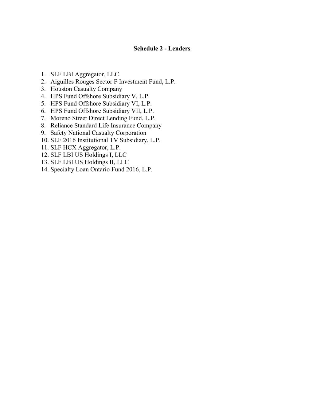 Schedule 2 - Lenders 1. SLF LBI Aggregator, LLC 2. Aiguilles Rouges Sector F Investment Fund, L.P. 3. Houston Casualty Company 4. HPS Fund Offshore Subsidiary V, L.P. 5. HPS Fund Offshore Subsidiary VI, L.P. 6. HPS Fund Offshore Subsidiary VII, L.P. 7. Moreno Street Direct Lending Fund, L.P. 8. Reliance Standard Life Insurance Company 9. Safety National Casualty Corporation 10. SLF 2016 Institutional TV Subsidiary, L.P. 11. SLF HCX Aggregator, L.P. 12. SLF LBI US Holdings I, LLC 13. SLF LBI US Holdings II, LLC 14. Specialty Loan Ontario Fund 2016, L.P.