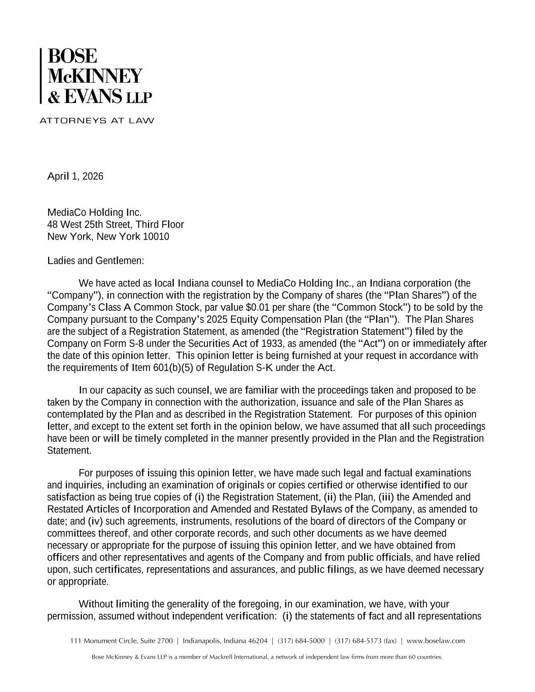 111 Monument Circle, Suite 2700 | Indianapolis, Indiana 46204 | (317) 684-5000 | (317) 684-5173 (fax) | www.boselaw.com Bose McKinney & Evans LLP is a member of Mackrell International, a network of independent law firms from more than 60 countries. April 1, 2026 MediaCo Holding Inc. 48 West 25th Street, Third Floor New York, New York 10010 Ladies and Gentlemen: We have acted as local Indiana counsel to MediaCo Holding Inc., an Indiana corporation (the “Company”), in connection with the registration by the Company of shares (the “Plan Shares”) of the Company’s Class A Common Stock, par value $0.01 per share (the “Common Stock”) to be sold by the Company pursuant to the Company’s 2025 Equity Compensation Plan (the “Plan”). The Plan Shares are the subject of a Registration Statement, as amended (the “Registration Statement”) filed by the Company on Form S-8 under the Securities Act of 1933, as amended (the “Act”) on or immediately after the date of this opinion letter. This opinion letter is being furnished at your request in accordance with the requirements of Item 601(b)(5) of Regulation S-K under the Act. In our capacity as such counsel, we are familiar with the proceedings taken and proposed to be taken by the Company in connection with the authorization, issuance and sale of the Plan Shares as contemplated by the Plan and as described in the Registration Statement. For purposes of this opinion letter, and except to the extent set forth in the opinion below, we have assumed that all such proceedings have been or will be timely completed in the manner presently provided in the Plan and the Registration Statement. For purposes of issuing this opinion letter, we have made such legal and factual examinations and inquiries, including an examination of originals or copies certified or otherwise identified to our satisfaction as being true copies of (i) the Registration Statement, (ii) the Plan, (iii) the Amended and Restated Articles of Incorporation and Amended and Restated Bylaws of the Company, as amended to date; and (iv) such agreements, instruments, resolutions of the board of directors of the Company or committees thereof, and other corporate records, and such other documents as we have deemed necessary or appropriate for the purpose of issuing this opinion letter, and we have obtained from officers and other representatives and agents of the Company and from public officials, and have relied upon, such certificates, representations and assurances, and public filings, as we have deemed necessary or appropriate. Without limiting the generality of the foregoing, in our examination, we have, with your permission, assumed without independent verification: (i) the statements of fact and all representations