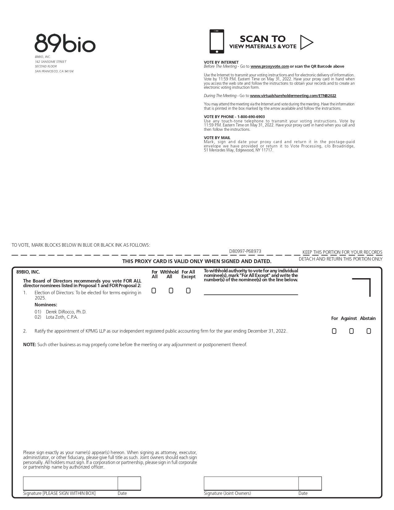 89bio 89BIO, INC. 142 SANSOME STREET SECOND FLOOR SAN FRANCISCO, CA 94104 SCAN TO VIEW MATERIALS & VOTE VOTE BY INTERNET Before The Meeting - Go to www.proxyvote.com or scan the QR Barcode above Use the Internet to transmit your voting instructions and for electronic delivery of information. Vote by 11:59 P.M. Eastern Time on May 31, 2022. Have your proxy card in hand when you access the web site and follow the instructions to obtain your records and to create an electronic voting instruction form. During The Meeting - Go to www.virtualshareholdermeeting.com/ETNB2022 You may attend the meeting via the Internet and vote during the meeting. Have the information that is printed in the box marked by the arrow available and follow the instructions. VOTE BY PHONE - 1-800-690-6903 Use any touch-tone telephone to transmit your voting instructions. Vote by 11:59 P.M. Eastern Time on May 31, 2022. Have your proxy card in hand when you call and then follow the instructions. VOTE BY MAIL Mark, sign and date your proxy card and return it in the postage-paid envelope we have provided or return it to Vote Processing, c/o Broadridge, 51 Mercedes Way, Edgewood, NY 11717. TO VOTE, MARK BLOCKS BELOW IN BLUE OR BLACK INK AS FOLLOWS: D80997-P68973 KEEP THIS PORTION FOR YOUR RECORDS THIS PROXY CARD IS VALID ONLY WHEN SIGNED AND DATED. DETACH AND RETURN THIS PORTION ONLY 89BIO, INC The Board of Directors recommends you vote FOR ALL director nominees listed in Proposal 1 and FOR Proposal 2: 1. Election of Directors: To be elected for terms expiring in 2025. Nominees: 01) Derek DiRocco, Ph.D. 02) Lota Zoth, C.P.A. For All Withhold All For All Except To withhold authority to vote for any individual nominee(s), mark "For All Except" and write the number(s) of the nominee(s) on the line below. For Against Abstain 2. Ratify the appointment of KPMG LLP as our independent registered public accounting firm for the year ending December 31, 2022. NOTE: Such other business as may properly come before the meeting or any adjournment or postponement thereof Please sign exactly as your name(s) appear(s) hereon. When signing as attorney, executor, administrator, or other fiduciary, please give full title as such. Joint owners should each sign personally. All holders must sign. If a corporation or partnership, please sign in full corporate or partnership name by authorized officer. Signature [PLEASE SIGN WITHIN BOX] Date Signature (Joint Owners) Date