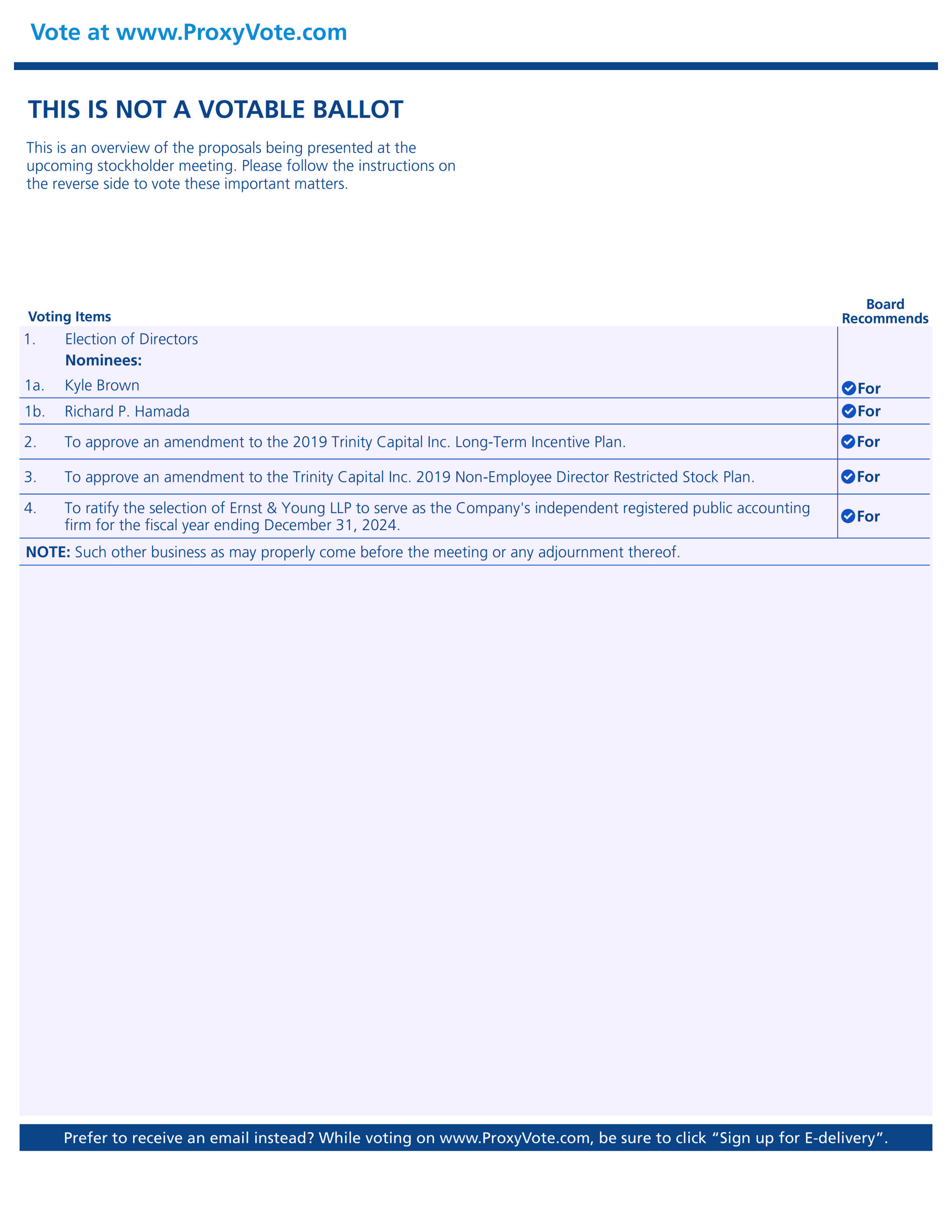 Vote at www.ProxyVote.com THIS IS NOT A VOTABLE BALLOT This is an overview of the proposals being presented at the upcoming stockholder meeting. Please follow the instructions on the reverse side to vote these important matters. Voting Items 1. Election of Directors Nominees: 1a. Kyle Brown Board Recommends 1b. Richard P. Hamada 0 For 2. To approve an amendment to the 2019 Trinity Capital Inc. Long - Term Incentive Plan. 0 For 3. To approve an amendment to the Trinity Capital Inc. 2019 Non - Employee Director Restricted Stock Plan. 0 For 4. To ratify the selection of Ernst & Young LLP to serve as the Company's independent registered public accounting firm for the fiscal year ending December 31, 2024. O For NOTE: Such other business as may properly come before the meeting or any adjournment thereof. Prefer to receive an email instead? While voting on www.ProxyVote.com, be sure to click "Sign up for E - delivery".