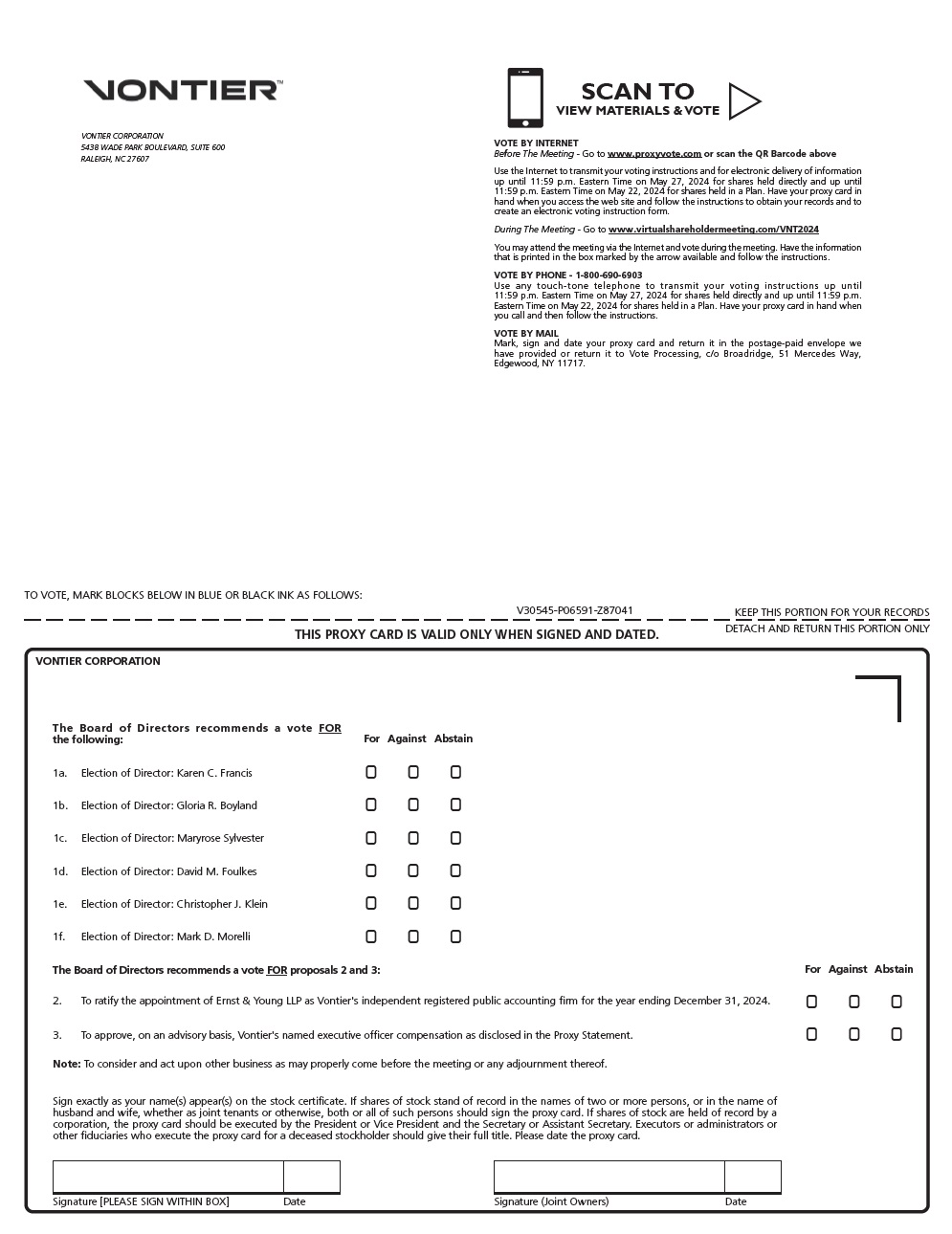 Signature [PLEASE SIGN WITHIN BOX] Date Signature (Joint Owners) Date TO VOTE, MARK BLOCKS BELOW IN BLUE OR BLACK INK AS FOLLOWS: KEEP THIS PORTION FOR YOUR RECORDS THIS PROXY CARD IS VALID ONLY WHEN SIGNED AND DATED. DETACH AND RETURN THIS PORTION ONLY V30545-P06591-Z87041 For Against Abstain For Against Abstain ! ! ! ! ! ! VONTIER CORPORATION 5438 WADE PARK BOULEVARD, SUITE 600 RALEIGH, NC 27607 VONTIER CORPORATION 1d. Election of Director: David M. Foulkes 1e. Election of Director: Christopher J. Klein 1f. Election of Director: Mark D. Morelli 1c. Election of Director: Maryrose Sylvester 1b. Election of Director: Gloria R. Boyland 1a. Election of Director: Karen C. Francis The Board of Directors recommends a vote FOR the following: The Board of Directors recommends a vote FOR proposals 2 and 3: 2. To ratify the appointment of Ernst & Young LLP as Vontier's independent registered public accounting firm for the year ending December 31, 2024. 3. To approve, on an advisory basis, Vontier's named executive officer compensation as disclosed in the Proxy Statement. Note: To consider and act upon other business as may properly come before the meeting or any adjournment thereof. Sign exactly as your name(s) appear(s) on the stock certificate. If shares of stock stand of record in the names of two or more persons, or in the name of husband and wife, whether as joint tenants or otherwise, both or all of such persons should sign the proxy card. If shares of stock are held of record by a corporation, the proxy card should be executed by the President or Vice President and the Secretary or Assistant Secretary. Executors or administrators or other fiduciaries who execute the proxy card for a deceased stockholder should give their full title. Please date the proxy card. ! ! ! ! ! ! ! ! ! ! ! ! ! ! ! ! ! ! VOTE BY INTERNET Before The Meeting - Go to www.proxyvote.com or scan the QR Barcode above Use the Internet to transmit your voting instructions and for electronic delivery of information up until 11:59 p.m. Eastern Time on May 27, 2024 for shares held directly and up until 11:59 p.m. Eastern Time on May 22, 2024 for shares held in a Plan. Have your proxy card in hand when you access the web site and follow the instructions to obtain your records and to create an electronic voting instruction form. During The Meeting - Go to www.virtualshareholdermeeting.com/VNT2024 You may attend the meeting via the Internet and vote during the meeting. Have the information that is printed in the box marked by the arrow available and follow the instructions. VOTE BY PHONE - 1-800-690-6903 Use any touch-tone telephone to transmit your voting instructions up until 11:59 p.m. Eastern Time on May 27, 2024 for shares held directly and up until 11:59 p.m. Eastern Time on May 22, 2024 for shares held in a Plan. Have your proxy card in hand when you call and then follow the instructions. VOTE BY MAIL Mark, sign and date your proxy card and return it in the postage-paid envelope we have provided or return it to Vote Processing, c/o Broadridge, 51 Mercedes Way, Edgewood, NY 11717. SCAN TO VIEW MATERIALS & VOTE w