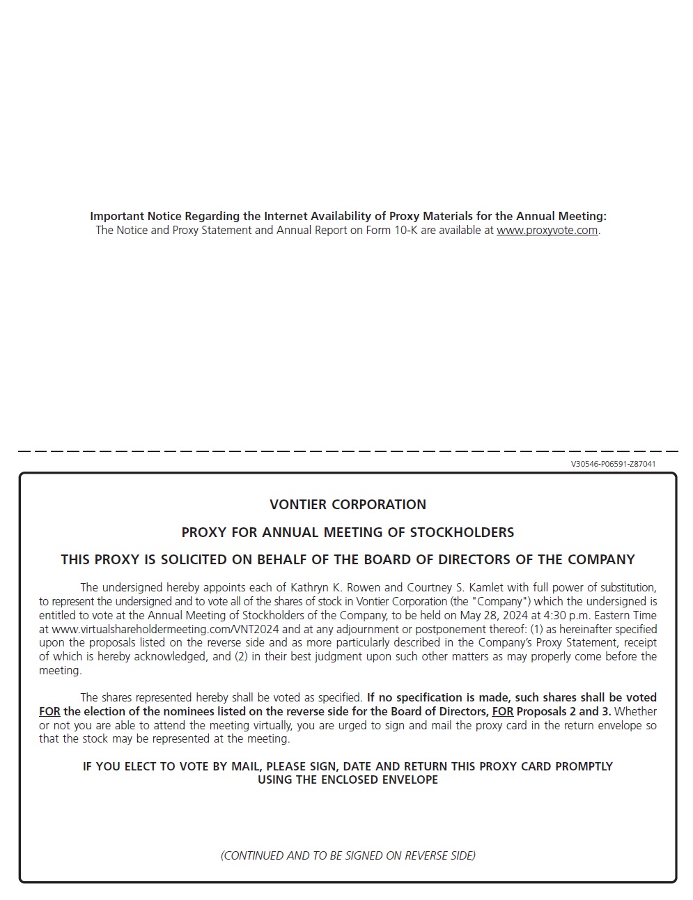 V30546-P06591-Z87041 Important Notice Regarding the Internet Availability of Proxy Materials for the Annual Meeting: The Notice and Proxy Statement and Annual Report on Form 10-K are available at www.proxyvote.com. VONTIER CORPORATION PROXY FOR ANNUAL MEETING OF STOCKHOLDERS THIS PROXY IS SOLICITED ON BEHALF OF THE BOARD OF DIRECTORS OF THE COMPANY The undersigned hereby appoints each of Kathryn K. Rowen and Courtney S. Kamlet with full power of substitution, to represent the undersigned and to vote all of the shares of stock in Vontier Corporation (the "Company") which the undersigned is entitled to vote at the Annual Meeting of Stockholders of the Company, to be held on May 28, 2024 at 4:30 p.m. Eastern Time at www.virtualshareholdermeeting.com/VNT2024 and at any adjournment or postponement thereof: (1) as hereinafter specified upon the proposals listed on the reverse side and as more particularly described in the Company’s Proxy Statement, receipt of which is hereby acknowledged, and (2) in their best judgment upon such other matters as may properly come before the meeting. The shares represented hereby shall be voted as specified. If no specification is made, such shares shall be voted FOR the election of the nominees listed on the reverse side for the Board of Directors, FOR Proposals 2 and 3. Whether or not you are able to attend the meeting virtually, you are urged to sign and mail the proxy card in the return envelope so that the stock may be represented at the meeting. IF YOU ELECT TO VOTE BY MAIL, PLEASE SIGN, DATE AND RETURN THIS PROXY CARD PROMPTLY USING THE ENCLOSED ENVELOPE (CONTINUED AND TO BE SIGNED ON REVERSE SIDE)