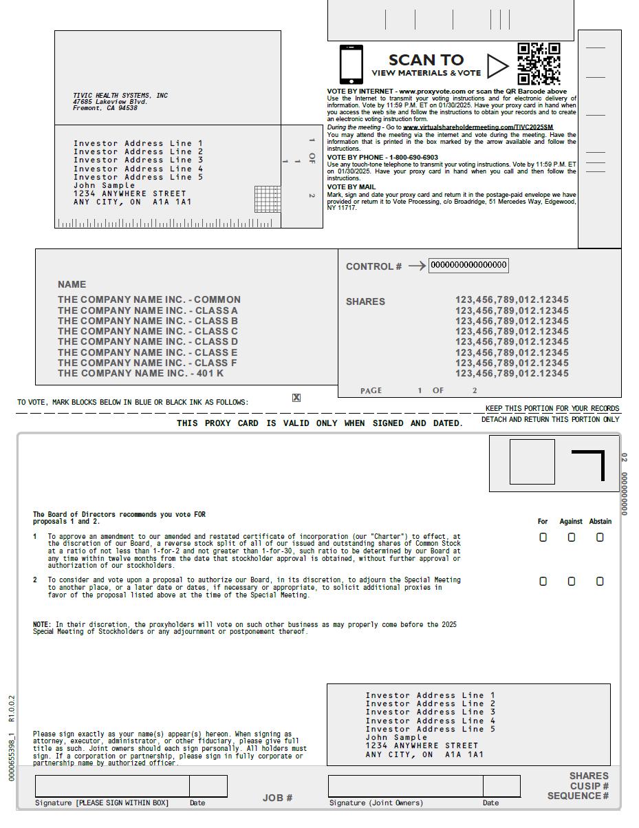 The Reverse Split, if approved by our stockholders and implemented by our Board, will be effected simultaneously for all outstanding shares of our Common Stock. The Reverse Split will affect all of our stockholders uniformly and will not affect any stockholder’s percentage ownership interest in the Company, except to the extent that the Reverse Split results in any of our stockholders owning a fractional share. The Reverse Split will not change the terms of our Common Stock, and will not change the number of shares of capital stock authorized for issuance under our Charter. After the Reverse Split, the shares of Common Stock will have the same voting rights and rights to dividends and distributions and will be identical in all other respects to the Common Stock now authorized, which is not entitled to preemptive or subscription rights, and is not subject to conversion, redemption or sinking fund provisions. The post-Reverse Split Common Stock will remain fully paid and non-assessable. The Reverse Split is not intended as, and will not have the effect of, a “going private transaction” covered by Rule 13e-3 under the Securities Exchange Act of 1934, as amended (the “Exchange Act”). Following the Reverse Split, we will continue to be subject to the periodic reporting requirements of the Exchange Act. After the Reverse Split, if implemented in accordance with Nasdaq rules, our Common Stock will continue to be listed on Nasdaq under the symbol “TIVC.”