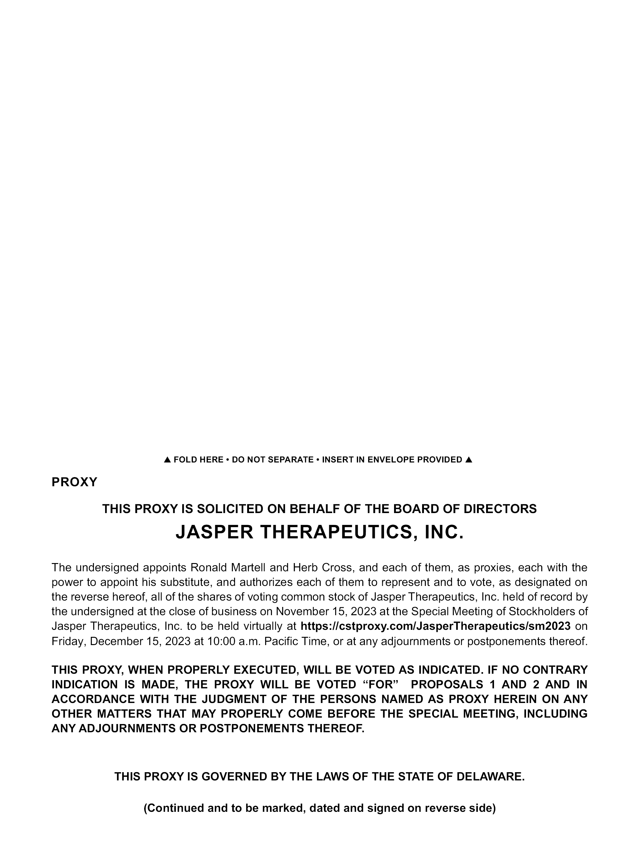 FOLD HERE DO NOT SEPARATE INSERT IN ENVELOPE PROVIDED PROXY THIS PROXY IS SOLICITED ON BEHALF OF THE BOARD OF DIRECTORS JASPER THERAPEUTICS, INC. The undersigned appoints Ronald Martell and Herb Cross, and each of them, as proxies, each with the power to appoint his substitute, and authorizes each of them to represent and to vote, as designated on the reverse hereof, all of the shares of voting common stock of Jasper Therapeutics, Inc. held of record by the undersigned at the close of business on November 15, 2023 at the Special Meeting of Stockholders of Jasper Therapeutics, Inc. to be held virtually at https://cstproxy.com/JasperTherapeutics/sm2023 on Friday, December 15, 2023 at 10:00 a.m. Pacific Time, or at any adjournments or postponements thereof. THIS PROXY, WHEN PROPERLY EXECUTED, WILL BE VOTED AS INDICATED. IF NO CONTRARY INDICATION IS MADE, THE PROXY WILL BE VOTED “FOR” PROPOSALS 1 AND 2 AND IN ACCORDANCE WITH THE JUDGMENT OF THE PERSONS NAMED AS PROXY HEREIN ON ANY OTHER MATTERS THAT MAY PROPERLY COME BEFORE THE SPECIAL MEETING, INCLUDING ANY ADJOURNMENTS OR POSTPONEMENTS THEREOF. THIS PROXY IS GOVERNED BY THE LAWS OF THE STATE OF DELAWARE. (Continued and to be marked, dated and signed on reverse side)
