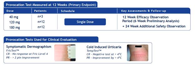 | ● | UAS7 reductions of as much as 29 points were noted 4 weeks post-dose (120mg Q12W); and |