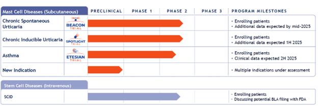 Historically, we have also evaluated briquilimab as a one-time conditioning therapy for severe combined immunodeficiency (“SCID”) patients undergoing a second stem cell transplant for which we conducted a Phase 1/2 clinical trial as well as via Investigator Sponsored Trials (“ISTs”) in several other stem cell transplant indications. As of July 2025, the SCID program and any remaining ISTs are being immediately discontinued to focus resources exclusively on our mast cell disease development programs.