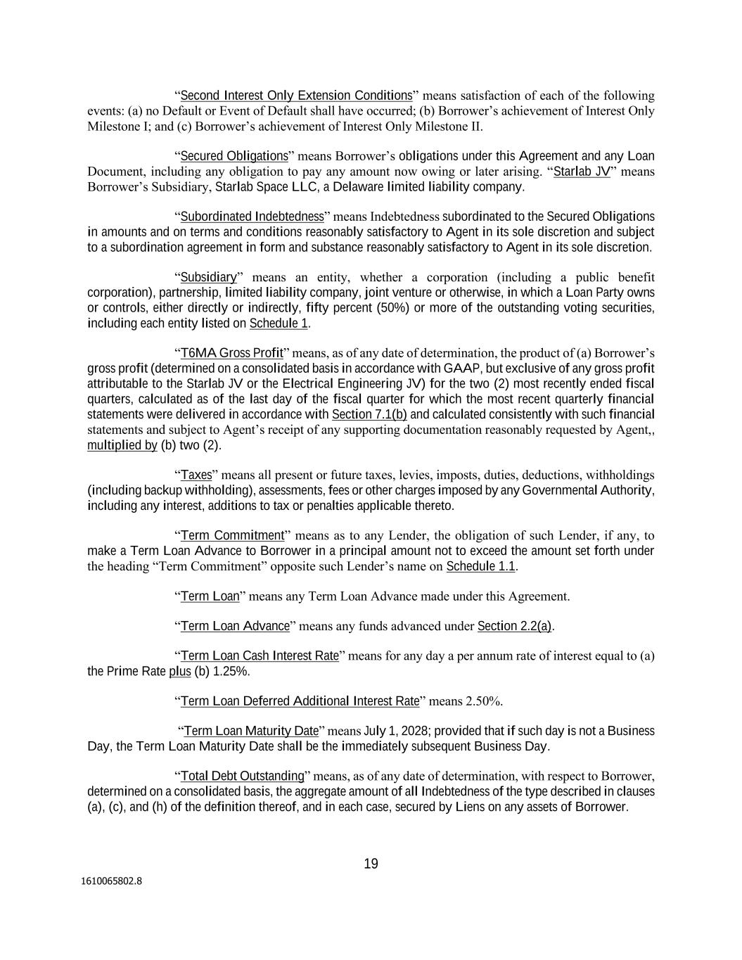 1610065802.8 19 “Second Interest Only Extension Conditions” means satisfaction of each of the following events: (a) no Default or Event of Default shall have occurred; (b) Borrower’s achievement of Interest Only Milestone I; and (c) Borrower’s achievement of Interest Only Milestone II. “Secured Obligations” means Borrower’s obligations under this Agreement and any Loan Document, including any obligation to pay any amount now owing or later arising. “Starlab JV” means Borrower’s Subsidiary, Starlab Space LLC, a Delaware limited liability company. “Subordinated Indebtedness” means Indebtedness subordinated to the Secured Obligations in amounts and on terms and conditions reasonably satisfactory to Agent in its sole discretion and subject to a subordination agreement in form and substance reasonably satisfactory to Agent in its sole discretion. “Subsidiary” means an entity, whether a corporation (including a public benefit corporation), partnership, limited liability company, joint venture or otherwise, in which a Loan Party owns or controls, either directly or indirectly, fifty percent (50%) or more of the outstanding voting securities, including each entity listed on Schedule 1. “T6MA Gross Profit” means, as of any date of determination, the product of (a) Borrower’s gross profit (determined on a consolidated basis in accordance with GAAP, but exclusive of any gross profit attributable to the Starlab JV or the Electrical Engineering JV) for the two (2) most recently ended fiscal quarters, calculated as of the last day of the fiscal quarter for which the most recent quarterly financial statements were delivered in accordance with Section 7.1(b) and calculated consistently with such financial statements and subject to Agent’s receipt of any supporting documentation reasonably requested by Agent,, multiplied by (b) two (2). “Taxes” means all present or future taxes, levies, imposts, duties, deductions, withholdings (including backup withholding), assessments, fees or other charges imposed by any Governmental Authority, including any interest, additions to tax or penalties applicable thereto. “Term Commitment” means as to any Lender, the obligation of such Lender, if any, to make a Term Loan Advance to Borrower in a principal amount not to exceed the amount set forth under the heading “Term Commitment” opposite such Lender’s name on Schedule 1.1. “Term Loan” means any Term Loan Advance made under this Agreement. “Term Loan Advance” means any funds advanced under Section 2.2(a). “Term Loan Cash Interest Rate” means for any day a per annum rate of interest equal to (a) the Prime Rate plus (b) 1.25%. “Term Loan Deferred Additional Interest Rate” means 2.50%. “Term Loan Maturity Date” means July 1, 2028; provided that if such day is not a Business Day, the Term Loan Maturity Date shall be the immediately subsequent Business Day. “Total Debt Outstanding” means, as of any date of determination, with respect to Borrower, determined on a consolidated basis, the aggregate amount of all Indebtedness of the type described in clauses (a), (c), and (h) of the definition thereof, and in each case, secured by Liens on any assets of Borrower.