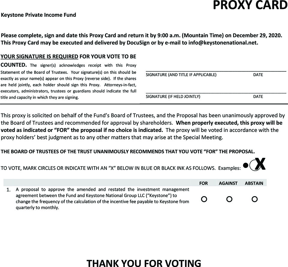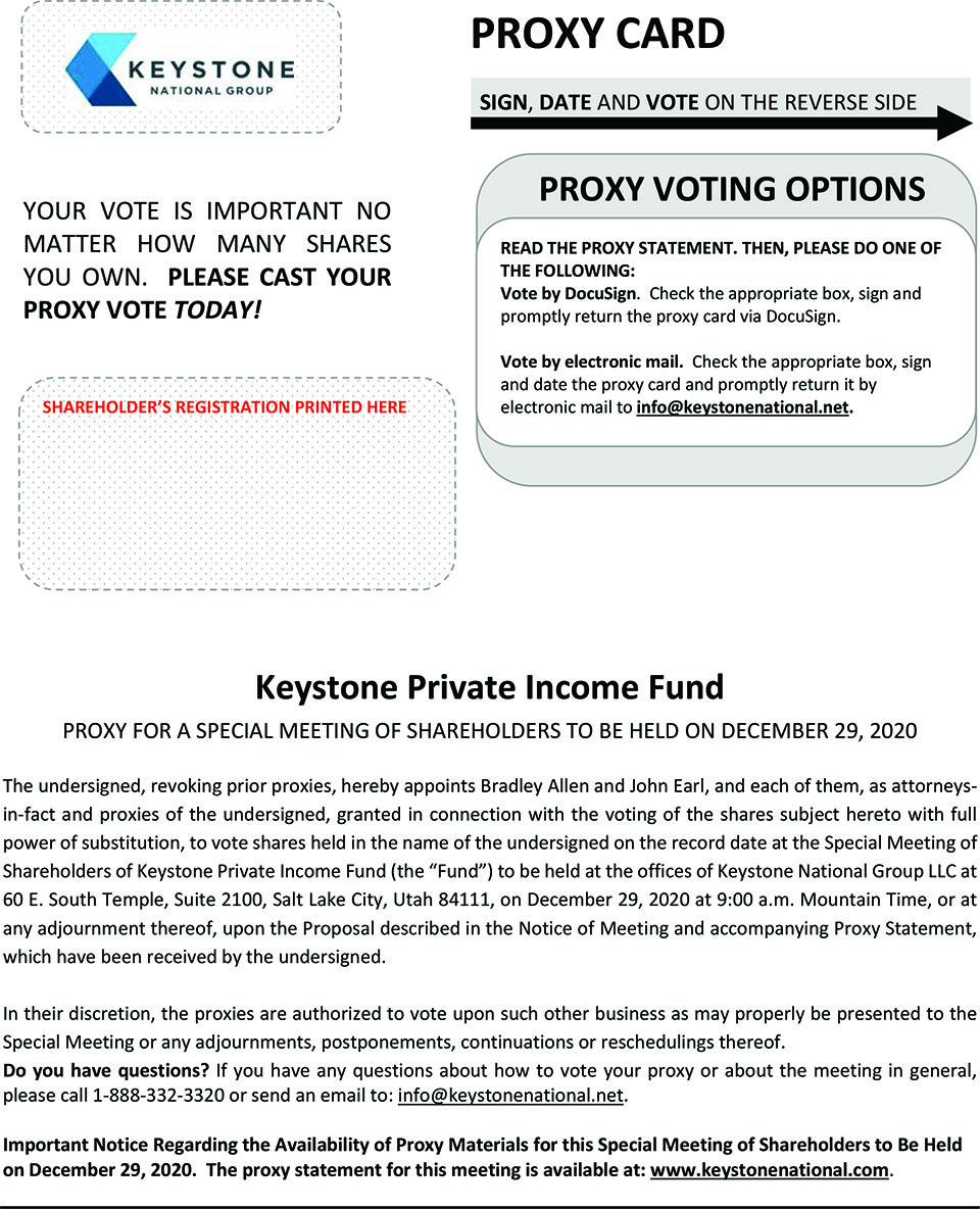 Keystone Private Income Fund (the “Fund”) will hold a Special Meeting of Shareholders on December 29, 2020 at the offices of Keystone National Group LLC at 60 E. South Temple, Suite 2100, Salt Lake City, Utah 84111 at 9 a.m. Mountain Time (the “Special Meeting”). This Special Meeting is being called because the shareholders of the Fund are being asked to consider the proposal set forth below. The Fund will not bear any portion of the costs related to the Special Meeting.
