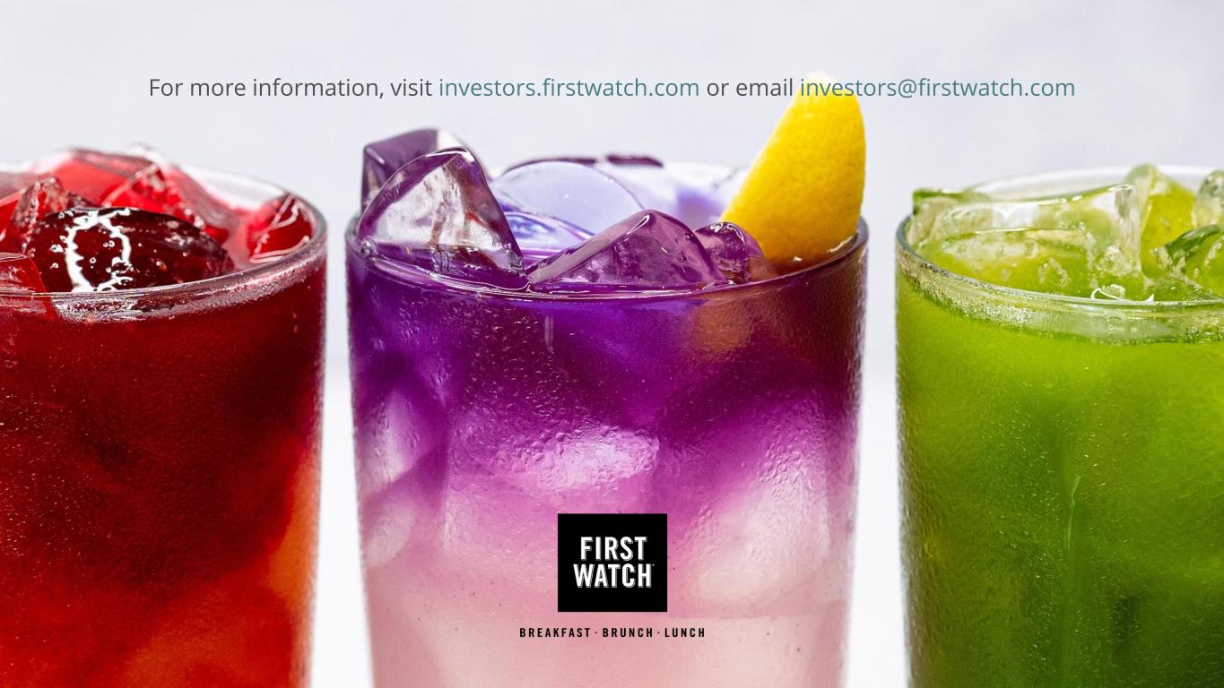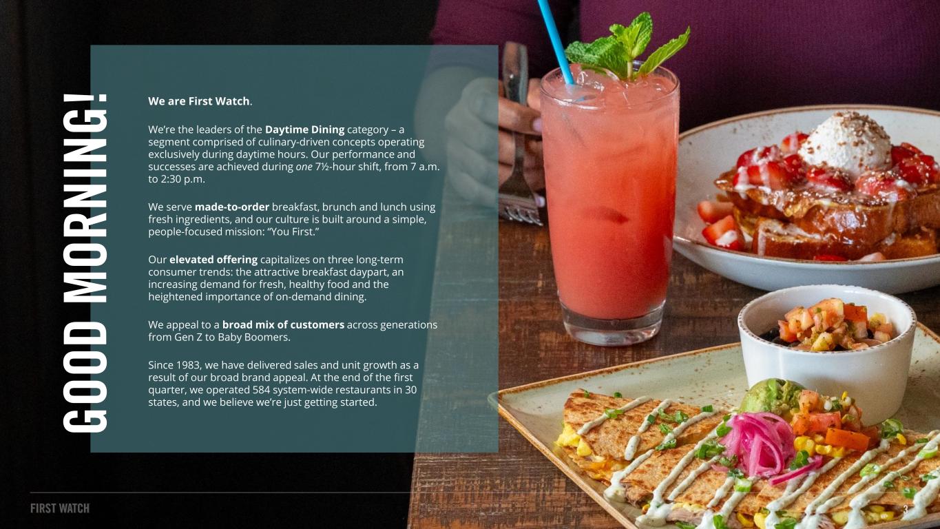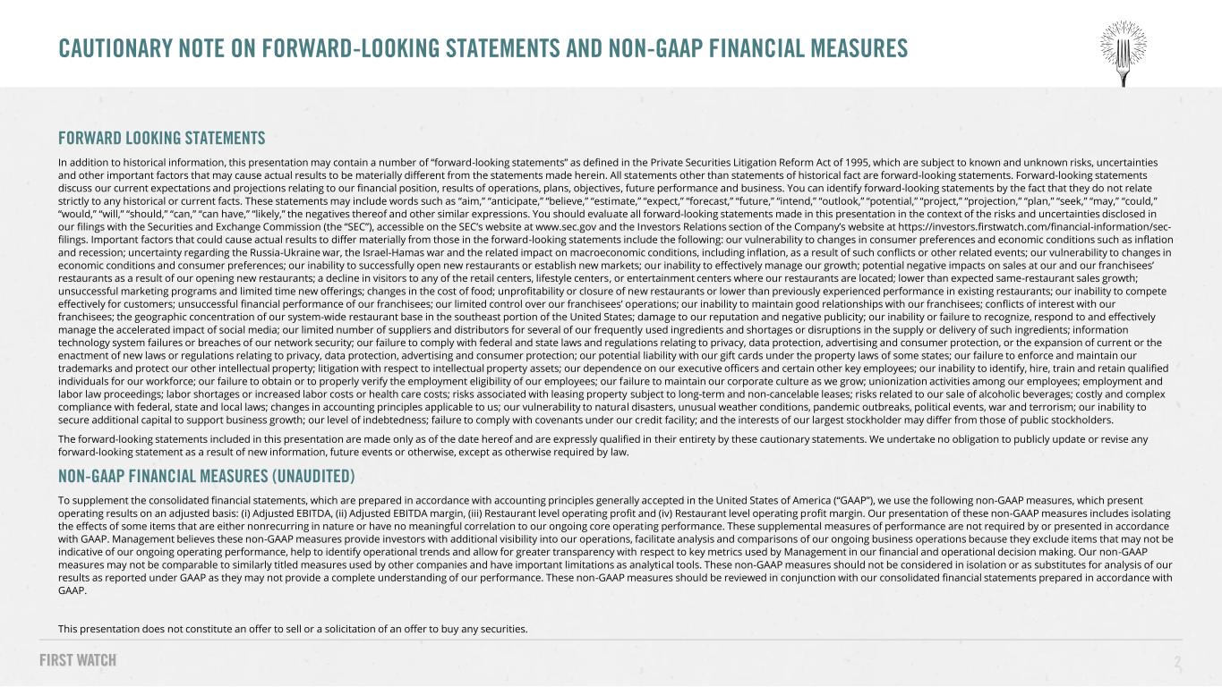 FORWARD LOOKING STATEMENTS In addition to historical information, this presentation may contain a number of “forward-looking statements” as defined in the Private Securities Litigation Reform Act of 1995, which are subject to known and unknown risks, uncertainties and other important factors that may cause actual results to be materially different from the statements made herein. All statements other than statements of historical fact are forward-looking statements. Forward-looking statements discuss our current expectations and projections relating to our financial position, results of operations, plans, objectives, future performance and business. You can identify forward-looking statements by the fact that they do not relate strictly to any historical or current facts. These statements may include words such as “aim,” “anticipate,” “believe,” “estimate,” “expect,” “forecast,” “future,” “intend,” “outlook,” “potential,” “project,” “projection,” “plan,” “seek,” “may,” “could,” “would,” “will,” “should,” “can,” “can have,” “likely,” the negatives thereof and other similar expressions. You should evaluate all forward-looking statements made in this presentation in the context of the risks and uncertainties disclosed in our filings with the Securities and Exchange Commission (the “SEC”), accessible on the SEC’s website at www.sec.gov and the Investors Relations section of the Company’s website at https://investors.firstwatch.com/financial-information/sec- filings. Important factors that could cause actual results to differ materially from those in the forward-looking statements include the following: our vulnerability to changes in consumer preferences and economic conditions such as inflation and recession; uncertainty regarding the Russia-Ukraine war, the Israel-Hamas war and the related impact on macroeconomic conditions, including inflation, as a result of such conflicts or other related events; our vulnerability to changes in economic conditions and consumer preferences; our inability to successfully open new restaurants or establish new markets; our inability to effectively manage our growth; potential negative impacts on sales at our and our franchisees’ restaurants as a result of our opening new restaurants; a decline in visitors to any of the retail centers, lifestyle centers, or entertainment centers where our restaurants are located; lower than expected same-restaurant sales growth; unsuccessful marketing programs and limited time new offerings; changes in the cost of food; unprofitability or closure of new restaurants or lower than previously experienced performance in existing restaurants; our inability to compete effectively for customers; unsuccessful financial performance of our franchisees; our limited control over our franchisees’ operations; our inability to maintain good relationships with our franchisees; conflicts of interest with our franchisees; the geographic concentration of our system-wide restaurant base in the southeast portion of the United States; damage to our reputation and negative publicity; our inability or failure to recognize, respond to and effectively manage the accelerated impact of social media; our limited number of suppliers and distributors for several of our frequently used ingredients and shortages or disruptions in the supply or delivery of such ingredients; information technology system failures or breaches of our network security; our failure to comply with federal and state laws and regulations relating to privacy, data protection, advertising and consumer protection, or the expansion of current or the enactment of new laws or regulations relating to privacy, data protection, advertising and consumer protection; our potential liability with our gift cards under the property laws of some states; our failure to enforce and maintain our trademarks and protect our other intellectual property; litigation with respect to intellectual property assets; our dependence on our executive officers and certain other key employees; our inability to identify, hire, train and retain qualified individuals for our workforce; our failure to obtain or to properly verify the employment eligibility of our employees; our failure to maintain our corporate culture as we grow; unionization activities among our employees; employment and labor law proceedings; labor shortages or increased labor costs or health care costs; risks associated with leasing property subject to long-term and non-cancelable leases; risks related to our sale of alcoholic beverages; costly and complex compliance with federal, state and local laws; changes in accounting principles applicable to us; our vulnerability to natural disasters, unusual weather conditions, pandemic outbreaks, political events, war and terrorism; our inability to secure additional capital to support business growth; our level of indebtedness; failure to comply with covenants under our credit facility; and the interests of our largest stockholder may differ from those of public stockholders. The forward-looking statements included in this presentation are made only as of the date hereof and are expressly qualified in their entirety by these cautionary statements. We undertake no obligation to publicly update or revise any forward-looking statement as a result of new information, future events or otherwise, except as otherwise required by law. NON-GAAP FINANCIAL MEASURES (UNAUDITED) To supplement the consolidated financial statements, which are prepared in accordance with accounting principles generally accepted in the United States of America (“GAAP”), we use the following non-GAAP measures, which present operating results on an adjusted basis: (i) Adjusted EBITDA, (ii) Adjusted EBITDA margin, (iii) Restaurant level operating profit and (iv) Restaurant level operating profit margin. Our presentation of these non-GAA
