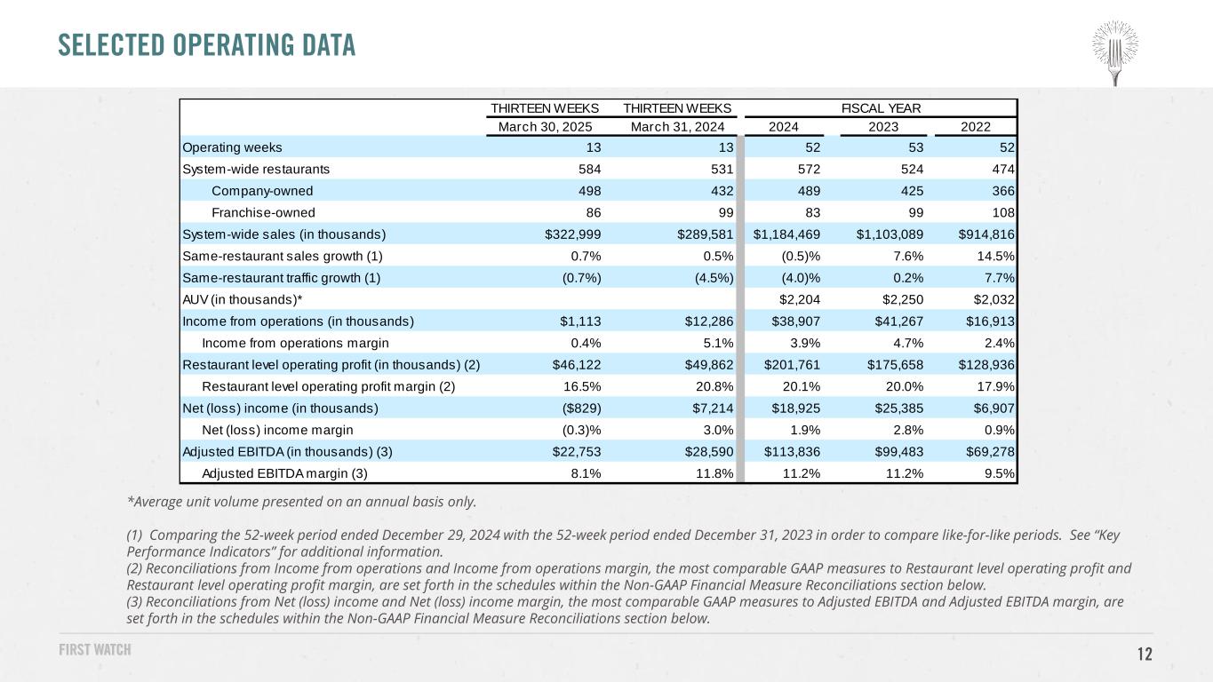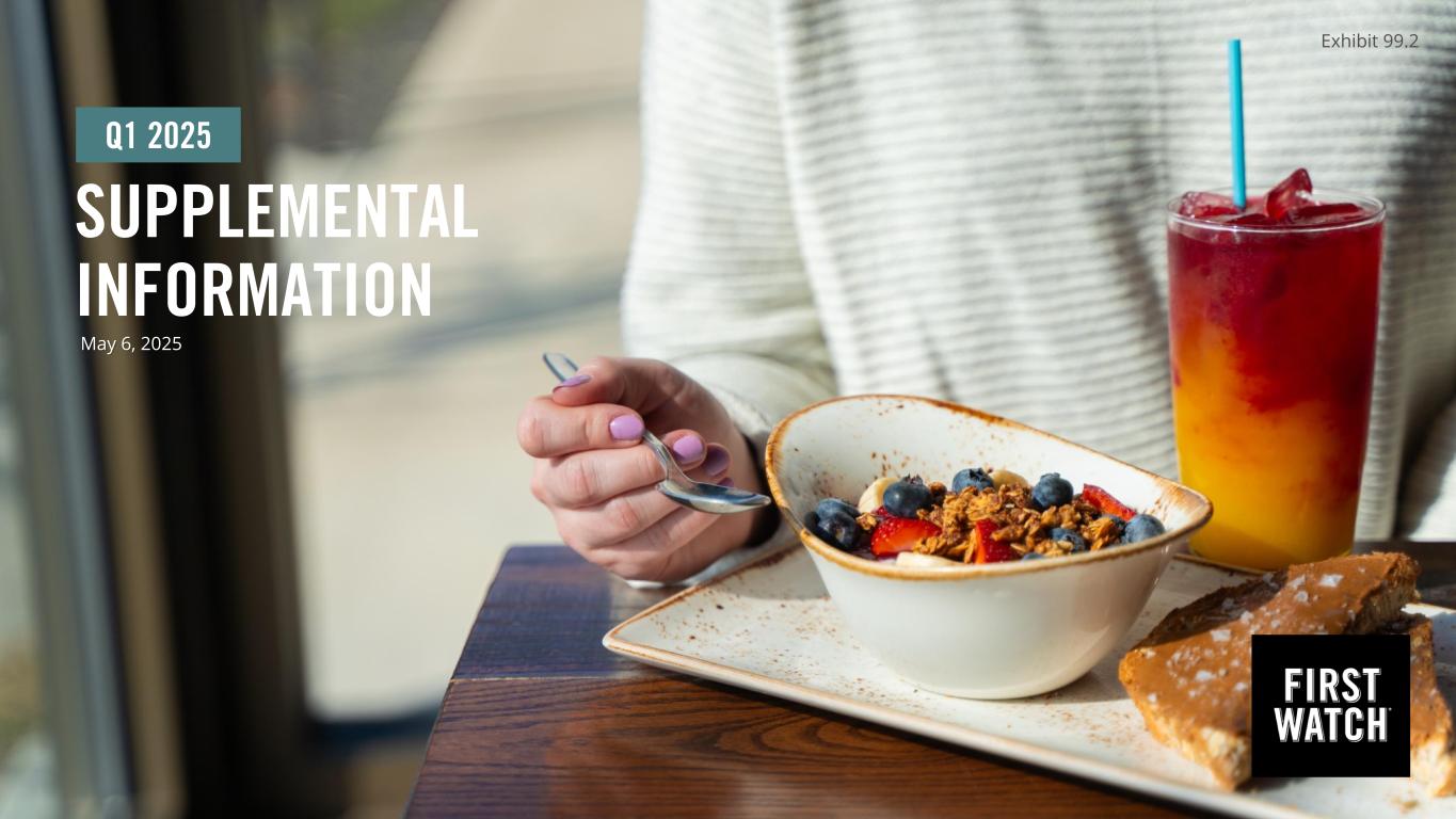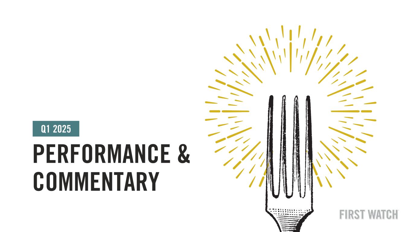 FORWARD LOOKING STATEMENTS In addition to historical information, this presentation may contain a number of “forward-looking statements” as defined in the Private Securities Litigation Reform Act of 1995, which are subject to known and unknown risks, uncertainties and other important factors that may cause actual results to be materially different from the statements made herein. All statements other than statements of historical fact are forward-looking statements. Forward-looking statements discuss our current expectations and projections relating to our financial position, results of operations, plans, objectives, future performance and business. You can identify forward-looking statements by the fact that they do not relate strictly to any historical or current facts. These statements may include words such as “aim,” “anticipate,” “believe,” “estimate,” “expect,” “forecast,” “future,” “intend,” “outlook,” “potential,” “project,” “projection,” “plan,” “seek,” “may,” “could,” “would,” “will,” “should,” “can,” “can have,” “likely,” the negatives thereof and other similar expressions. You should evaluate all forward-looking statements made in this presentation in the context of the risks and uncertainties disclosed in our filings with the Securities and Exchange Commission (the “SEC”), accessible on the SEC’s website at www.sec.gov and the Investors Relations section of the Company’s website at https://investors.firstwatch.com/financial-information/sec- filings. Important factors that could cause actual results to differ materially from those in the forward-looking statements include the following: our vulnerability to changes in consumer preferences and economic conditions such as inflation and recession; uncertainty regarding the Russia-Ukraine war, the Israel-Hamas war and the related impact on macroeconomic conditions, including inflation, as a result of such conflicts or other related events; our vulnerability to changes in economic conditions and consumer preferences; our inability to successfully open new restaurants or establish new markets; our inability to effectively manage our growth; potential negative impacts on sales at our and our franchisees’ restaurants as a result of our opening new restaurants; a decline in visitors to any of the retail centers, lifestyle centers, or entertainment centers where our restaurants are located; lower than expected same-restaurant sales growth; unsuccessful marketing programs and limited time new offerings; changes in the cost of food; unprofitability or closure of new restaurants or lower than previously experienced performance in existing restaurants; our inability to compete effectively for customers; unsuccessful financial performance of our franchisees; our limited control over our franchisees’ operations; our inability to maintain good relationships with our franchisees; conflicts of interest with our franchisees; the geographic concentration of our system-wide restaurant base in the southeast portion of the United States; damage to our reputation and negative publicity; our inability or failure to recognize, respond to and effectively manage the accelerated impact of social media; our limited number of suppliers and distributors for several of our frequently used ingredients and shortages or disruptions in the supply or delivery of such ingredients; information technology system failures or breaches of our network security; our failure to comply with federal and state laws and regulations relating to privacy, data protection, advertising and consumer protection, or the expansion of current or the enactment of new laws or regulations relating to privacy, data protection, advertising and consumer protection; our potential liability with our gift cards under the property laws of some states; our failure to enforce and maintain our trademarks and protect our other intellectual property; litigation with respect to intellectual property assets; our dependence on our executive officers and certain other key employees; our inability to identify, hire, train and retain qualified individuals for our workforce; our failure to obtain or to properly verify the employment eligibility of our employees; our failure to maintain our corporate culture as we grow; unionization activities among our employees; employment and labor law proceedings; labor shortages or increased labor costs or health care costs; risks associated with leasing property subject to long-term and non-cancelable leases; risks related to our sale of alcoholic beverages; costly and complex compliance with federal, state and local laws; changes in accounting principles applicable to us; our vulnerability to natural disasters, unusual weather conditions, pandemic outbreaks, political events, war and terrorism; our inability to secure additional capital to support business growth; our level of indebtedness; failure to comply with covenants under our credit facility; and the interests of our largest stockholder may differ from those of public stockholders. The forward-looking statements included in this presentation are made only as of the date hereof and are expressly qualified in their entirety by these cautionary statements. We undertake no obligation to publicly update or revise any forward-looking statement as a result of new information, future events or otherwise, except as otherwise required by law. NON-GAAP FINANCIAL MEASURES (UNAUDITED) To supplement the consolidated financial statements, which are prepared in accordance with accounting principles generally accepted in the United States of America (“GAAP”), we use the following non-GAAP measures, which present operating results on an adjusted basis: (i) Adjusted EBITDA, (ii) Adjusted EBITDA margin, (iii) Restaurant level operating profit and (iv) Restaurant level operating profit margin. Our presentation of these non-GAA