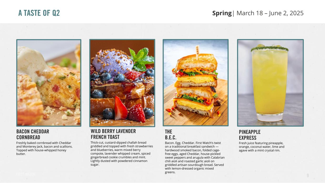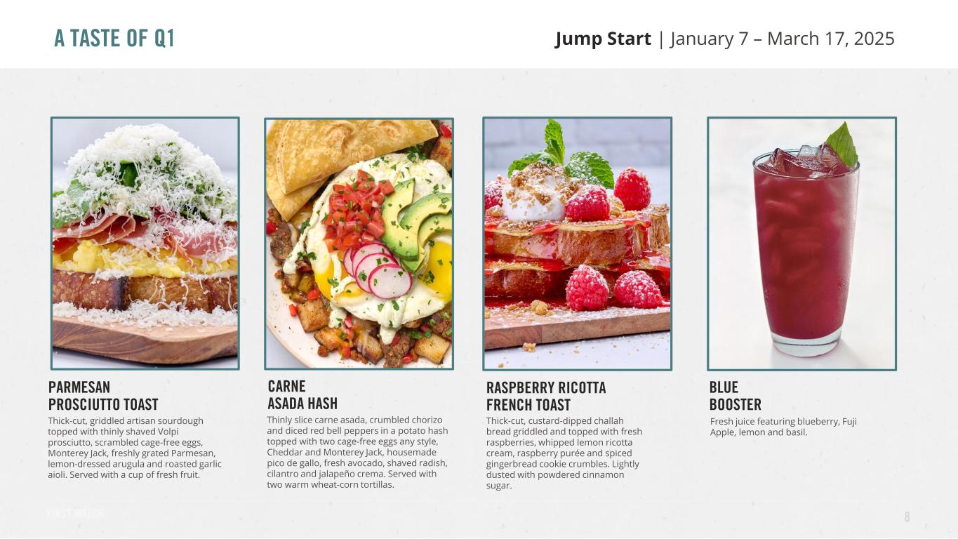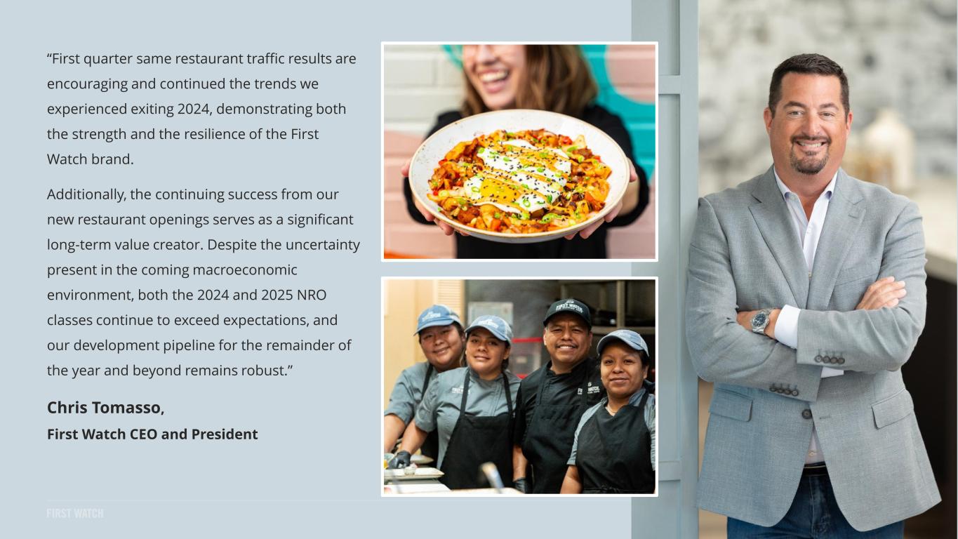 “First quarter same restaurant traffic results are encouraging and continued the trends we experienced exiting 2024, demonstrating both the strength and the resilience of the First Watch brand. Additionally, the continuing success from our new restaurant openings serves as a significant long-term value creator. Despite the uncertainty present in the coming macroeconomic environment, both the 2024 and 2025 NRO classes continue to exceed expectations, and our development pipeline for the remainder of the year and beyond remains robust.” Chris Tomasso, First Watch CEO and President 7