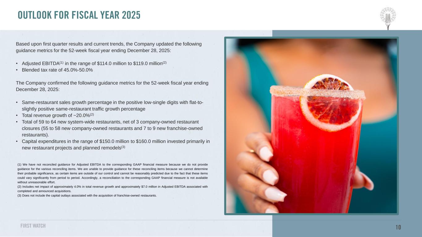 Based upon first quarter results and current trends, the Company updated the following guidance metrics for the 52-week fiscal year ending December 28, 2025: • Adjusted EBITDA(1) in the range of $114.0 million to $119.0 million(2) • Blended tax rate of 45.0%-50.0% The Company confirmed the following guidance metrics for the 52-week fiscal year ending December 28, 2025: • Same-restaurant sales growth percentage in the positive low-single digits with flat-to- slightly positive same-restaurant traffic growth percentage • Total revenue growth of ~20.0%(2) • Total of 59 to 64 new system-wide restaurants, net of 3 company-owned restaurant closures (55 to 58 new company-owned restaurants and 7 to 9 new franchise-owned restaurants). • Capital expenditures in the range of $150.0 million to $160.0 million invested primarily in new restaurant projects and planned remodels(3) 10 OUTLOOK (1) We have not reconciled guidance for Adjusted EBITDA to the corresponding GAAP financial measure because we do not provide guidance for the various reconciling items. We are unable to provide guidance for these reconciling items because we cannot determine their probable significance, as certain items are outside of our control and cannot be reasonably predicted due to the fact that these items could vary significantly from period to period. Accordingly, a reconciliation to the corresponding GAAP financial measure is not available without unreasonable effort. (2) Includes net impact of approximately 4.0% in total revenue growth and approximately $7.0 million in Adjusted EBITDA associated with completed and announced acquisitions. (3) Does not include the capital outlays associated with the acquisition of franchise-owned restaurants. OUTLOOK FOR FISCAL YEAR 2025