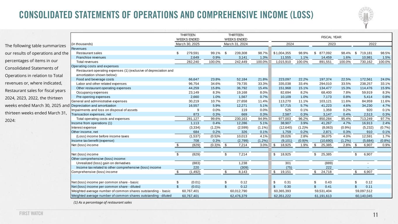 11 The following table summarizes our results of operations and the percentages of items in our Consolidated Statements of Operations in relation to Total revenues or, where indicated, Restaurant sales for fiscal years 2024, 2023, 2022, the thirteen weeks ended March 30, 2025 and thirteen weeks ended March 31, 2024: CONSOLIDATED STATEMENTS OF OPERATIONS AND COMPREHENSIVE INCOME (LOSS) (1) As a percentage of restaurant sales THIRTEEN WEEKS ENDED THIRTEEN WEEKS ENDED (in thousands) March 30, 2025 March 31, 2024 Revenues Restaurant sales 279,591$ 99.1% 239,308$ 98.7% 1,004,355$ 98.9% 877,092$ 98.4% 719,181$ 98.5% Franchise revenues 2,649 0.9% 3,141 1.3% 11,555 1.1% 14,459 1.6% 10,981 1.5% Total revenues 282,240 100.0% 242,449 100.0% 1,015,910 100.0% 891,551 100.0% 730,162 100.0% Operating costs and expenses Restaurant operating expenses (1) (exclusive of depreciation and amortization shown below): Food and beverage costs 66,647 23.8% 52,184 21.8% 223,097 22.2% 197,374 22.5% 172,561 24.0% Labor and other related expenses 96,754 34.6% 79,735 33.3% 335,038 33.4% 294,010 33.5% 238,257 33.1% Other restaurant operating expenses 44,259 15.8% 36,792 15.4% 151,968 15.1% 134,477 15.3% 114,476 15.9% Occupancy expenses 23,149 8.3% 19,168 8.0% 82,694 8.2% 68,400 7.8% 59,919 8.3% Pre-opening expenses 2,660 1.0% 1,567 0.7% 10,109 1.0% 7,173 0.8% 5,414 0.8% General and administrative expenses 30,219 10.7% 27,658 11.4% 113,270 11.1% 103,121 11.6% 84,959 11.6% Depreciation and amortization 16,557 5.9% 12,271 5.1% 57,715 5.7% 41,223 4.6% 34,230 4.7% Impairments and loss on disposal of assets 9 0.0% 119 0.0% 525 0.1% 1,359 0.2% 920 0.1% Transaction expenses, net 873 0.3% 669 0.3% 2,587 0.3% 3,147 0.4% 2,513 0.3% Total operating costs and expenses 281,127 99.6% 230,163 94.9% 977,003 96.2% 850,284 95.4% 713,249 97.7% Income from operations (1) 1,113 0.4% 12,286 5.1% 38,907 3.9% 41,267 4.7% 16,913 2.4% Interest expense (3,334) (1.2)% (2,599) (1.1%) (12,640) (1.2)% (8,063) (0.9%) (5,232) (0.7%) Other income, net 684 0.2% 326 0.1% 1,759 0.2% 2,871 0.3% 910 0.1% (Loss) income before income taxes (1,537) (0.5)% 10,013 4.1% 28,026 2.8% 36,075 4.0% 12,591 1.7% Income tax benefit (expense) 708 0.3% (2,799) (1.2%) (9,101) (0.9)% (10,690) (1.2%) (5,684) (0.8%) Net (loss) income (829)$ (0.3)% 7,214$ 3.0% 18,925$ 1.9% 25,385$ 2.8% 6,907$ 0.9% Net (loss) income (829)$ 7,214$ 18,925$ 25,385$ 6,907$ Other comprehensive (loss) income: Unrealized (loss) gain on derivatives (883) 1,238 301 (889) - Income tax related to other comprehensive (loss) income 220 (309) (75) 222 - Comprehensive (loss) income (1,492)$ 8,143$ 19,151$ 24,718$ 6,907$ Net (loss) income per common share - basic (0.01)$ 0.12$ 0.31$ 0.43$ 0.12$ Net (loss) income per common share - diluted (0.01)$ 0.12$ 0.30$ 0.41$ 0.11$ Weighted average number of common shares outstanding - basic 60,767,401 60,012,790 60,365,393 59,531,404 59,097,512 Weighted average number of common shares outstanding - diluted 60,767,401 62,476,379 62,351,222 61,191,613 60,140,045 2022 FISCAL YEAR 2024 2023