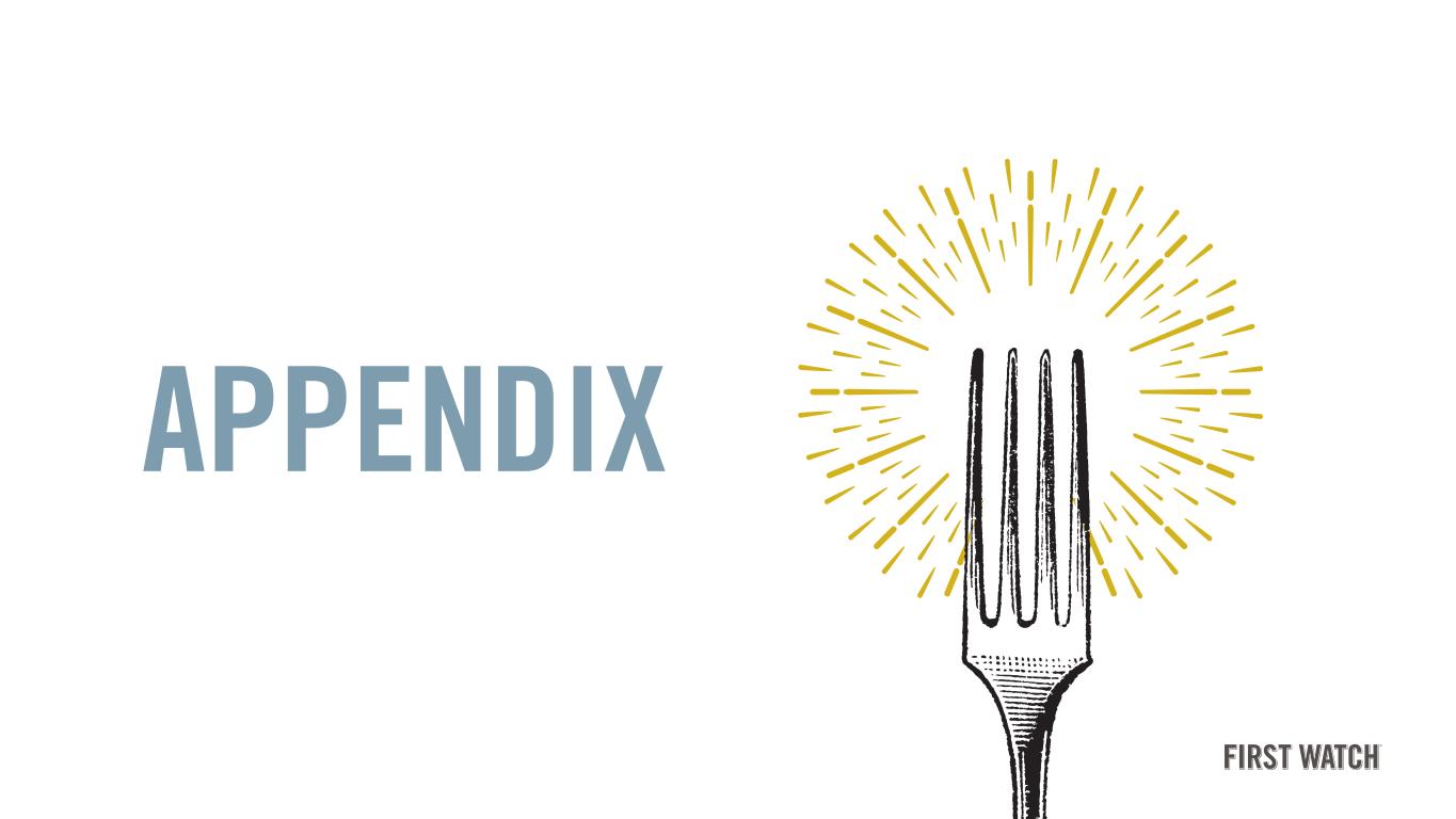 18 The following definitions apply to these terms as used in this presentation: Adjusted EBITDA: a non-GAAP financial measure, is defined as net income (loss) before depreciation and amortization, interest expense, income taxes and items that the Company does not consider in the evaluation of its ongoing core operating performance. Adjusted EBITDA margin: a non-GAAP financial measure, is defined as Adjusted EBITDA as a percentage of total revenues. Average Unit Volume: the total restaurant sales (excluding gift card breakage) recognized in the comparable restaurant base, which is defined as the number of company-owned First Watch branded restaurants open for 18 months or longer as of the beginning of the fiscal year (“Comparable Restaurant Base”), divided by the number of restaurants in the Comparable Restaurant Base during the period. This measurement allows management to assess changes in consumer spending patterns at our restaurants and the overall performance of our restaurant base. Restaurant level operating profit: a non-GAAP financial measure, is defined as restaurant sales, less restaurant operating expenses, which include food and beverage costs, labor and other related expenses, other restaurant operating expenses, pre-opening expenses and occupancy expenses. Restaurant level operating profit excludes corporate-level expenses and items that are not considered in the Company’s evaluation of its ongoing core operating performance. Restaurant level operating profit margin: a non-GAAP financial measure, is defined as Restaurant level operating profit as a percentage of restaurant sales. Same-restaurant sales growth: the percentage change in year-over-year restaurant sales (excluding gift card breakage) for the comparable restaurant base, which we define as the number of company-owned First Watch branded restaurants open for 18 months or longer as of the beginning of the fiscal year (“Comparable Restaurant Base”). For the thirteen weeks ended March 30, 2025 and March 31, 2024, there were 383 restaurants and 344 restaurants, respectively, in our Comparable Restaurant Base. Measuring our same-restaurant sales growth allows management to evaluate the performance of our existing restaurant base. We believe this measure is useful for investors to provide a consistent comparison of restaurant sales results and trends across periods within our core, established restaurant base, unaffected by results of store openings, closings, and other transitional changes. Same-restaurant traffic growth: the percentage change in traffic counts as compared to the same period in the prior year using the Comparable Restaurant Base. Measuring our same- restaurant traffic growth allows management to evaluate the performance of our existing restaurant base. We believe this measure is useful for investors because an increase in same- restaurant traffic provides an indicator as to the development of our brand and the effectiveness of our marketing strategy. System-wide restaurants: the total number of restaurants, including all company-owned and franchise-owned restaurants. System-wide sales: consists of restaurant sales from our company-owned restaurants and franchise-owned restaurants. We do not recognize the restaurant sales from our franchise- owned restaurants as revenue. DEFINITIONS